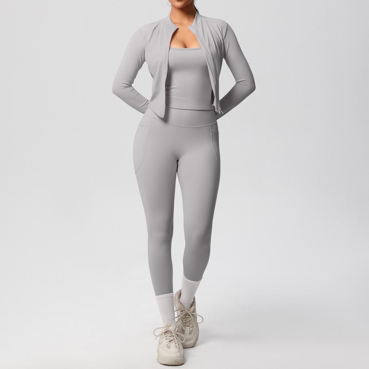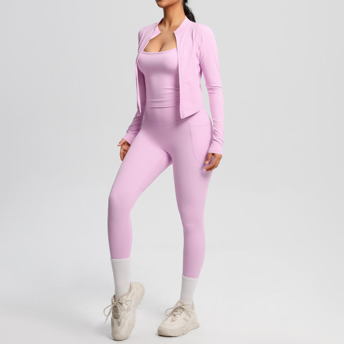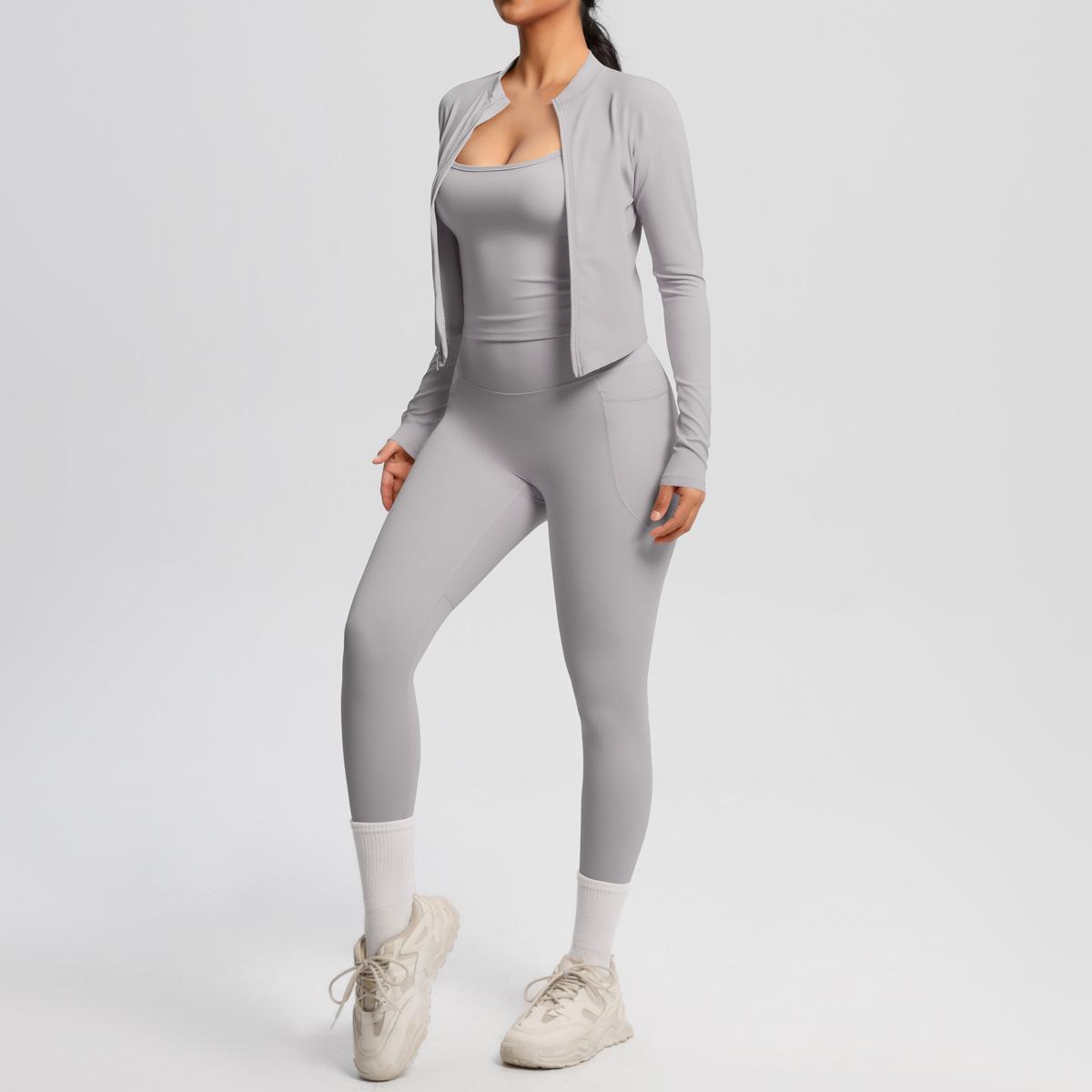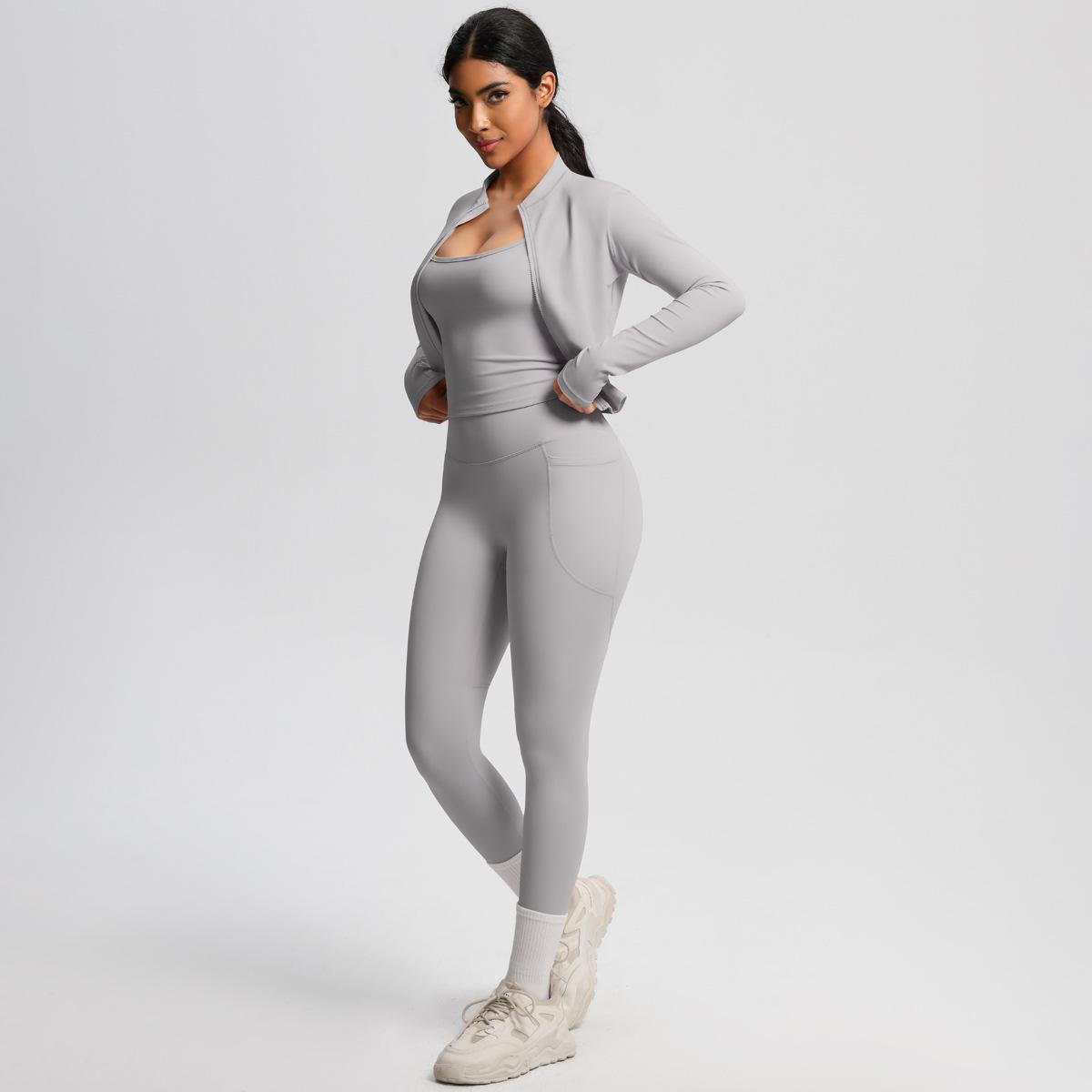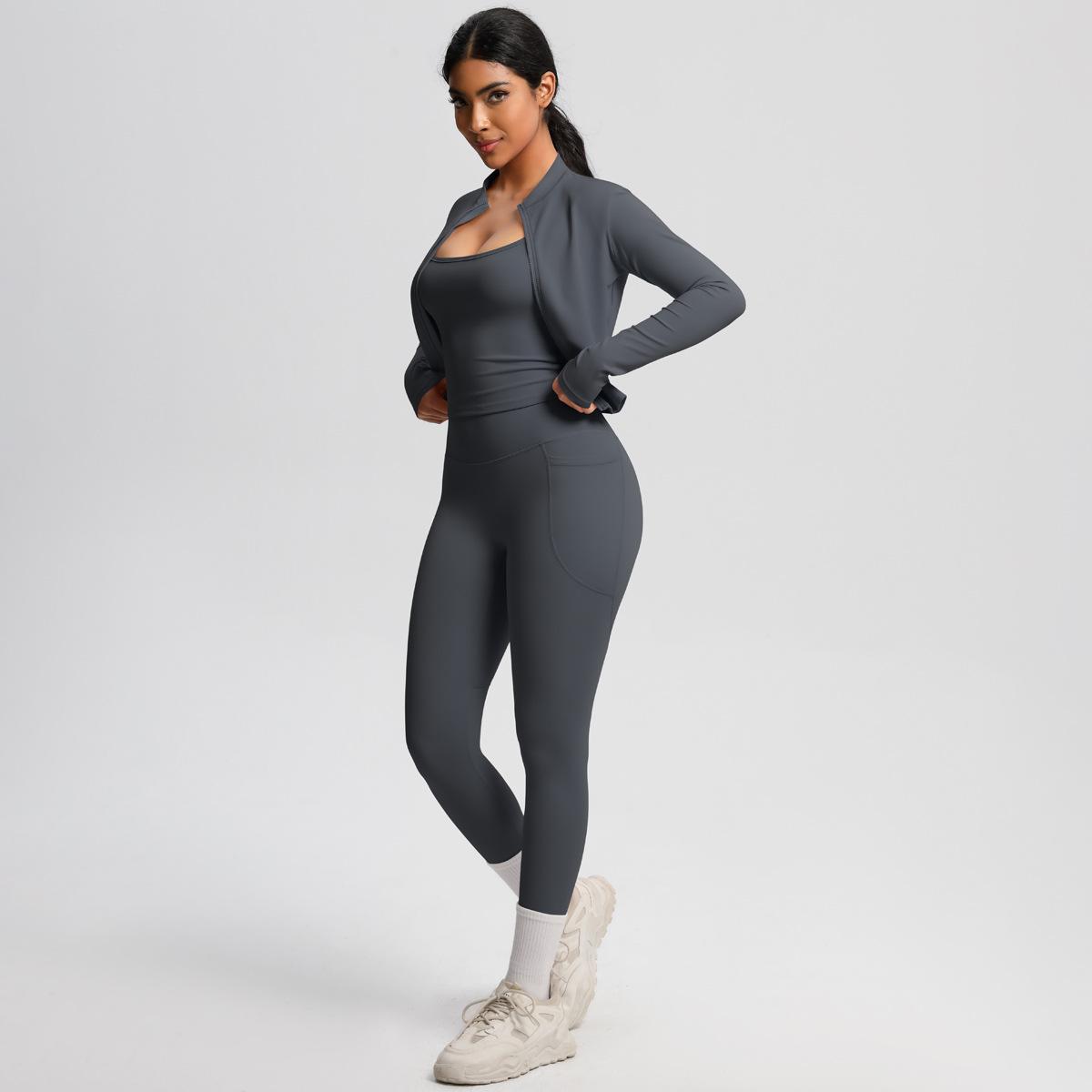 Traje de Yoga Ajustado Casual para Exterior Europeo y Americano con Bolsillo Secado Rápido Cintura Alta Adelgazante Fitness Sensación Nube Set Deportivo de Tres Piezas