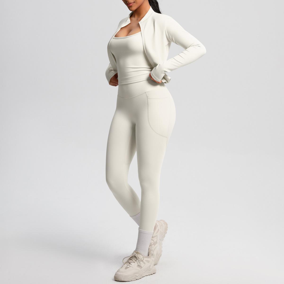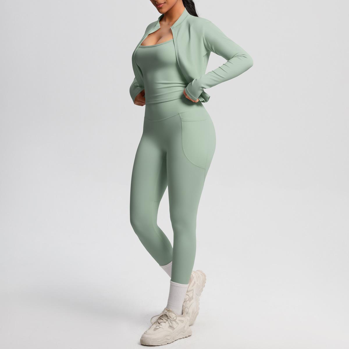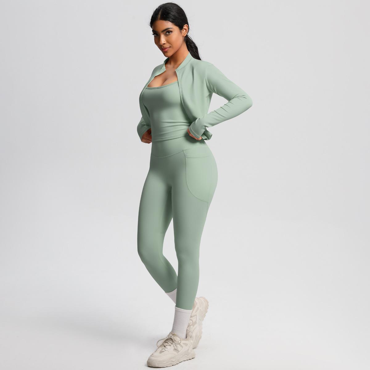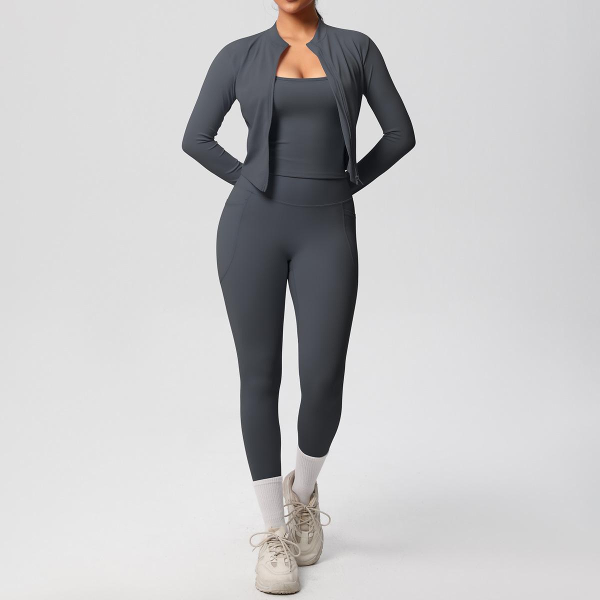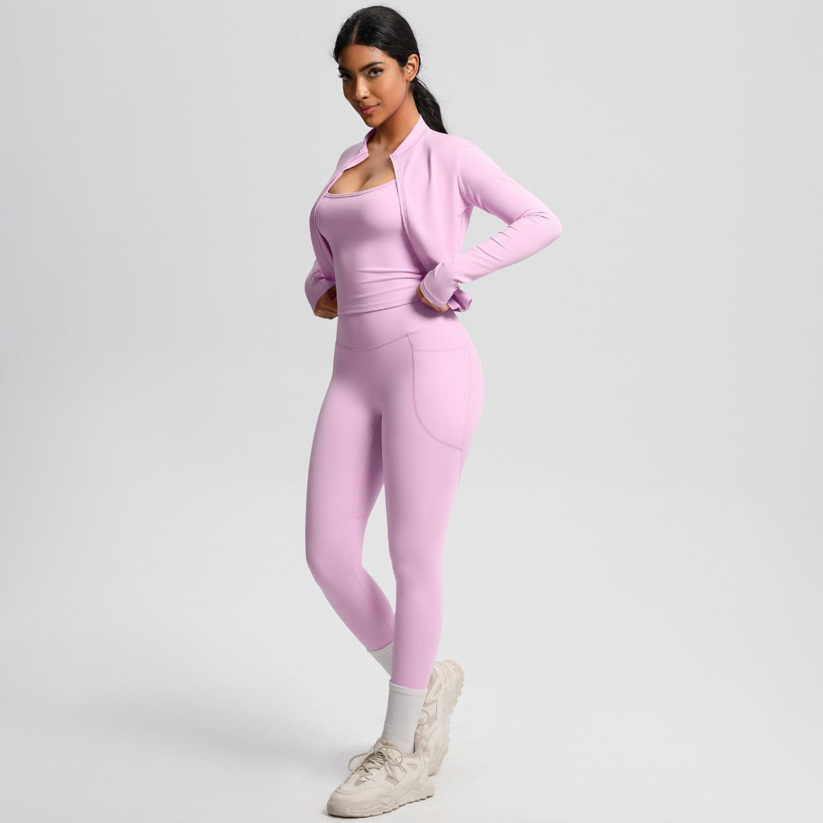 Traje de Yoga Ajustado Casual para Exterior Europeo y Americano con Bolsillo Secado Rápido Cintura Alta Adelgazante Fitness Sensación Nube Set Deportivo de Tres Piezas