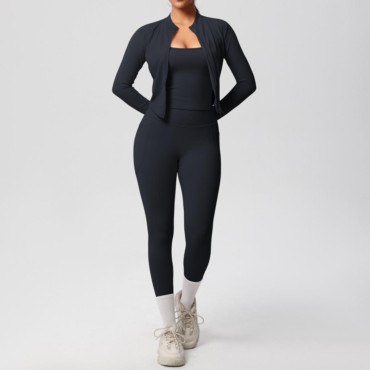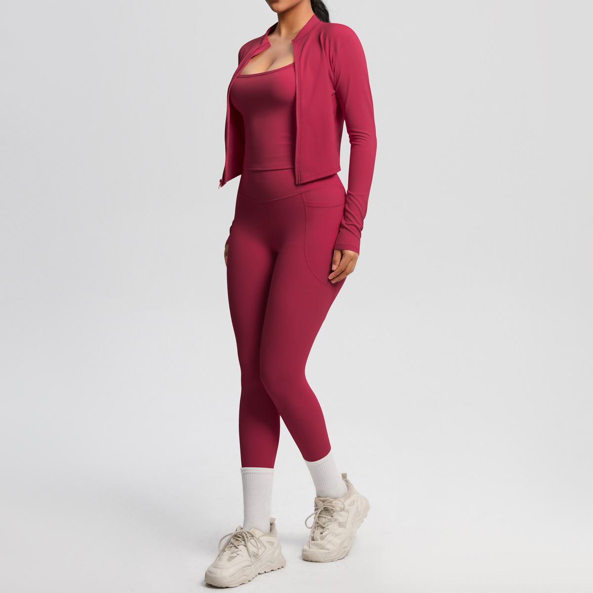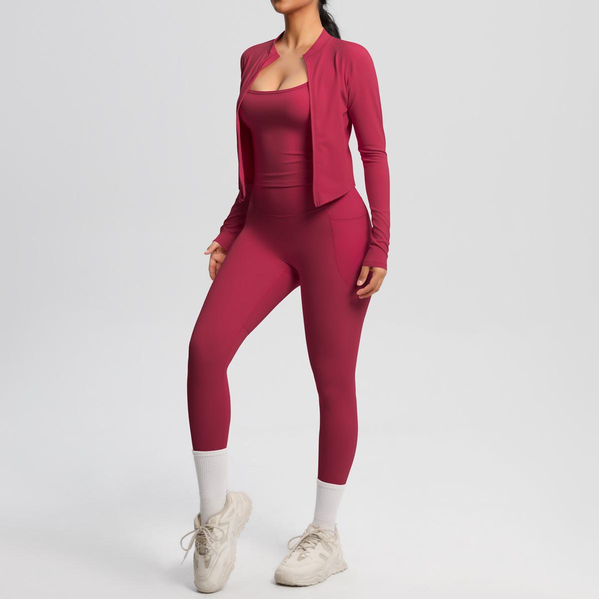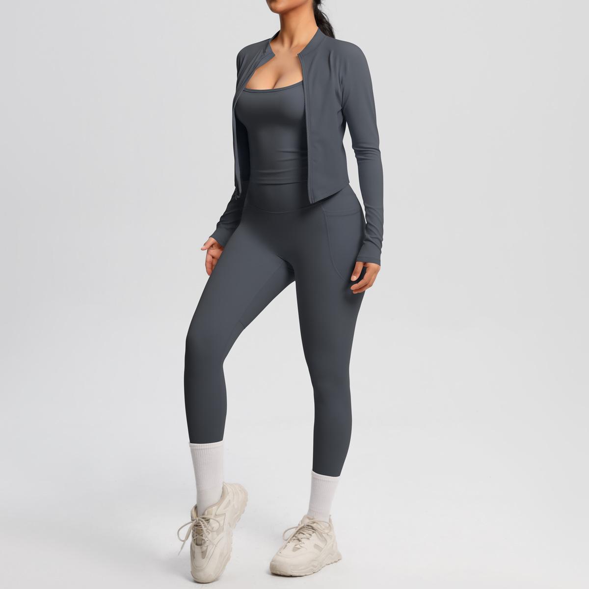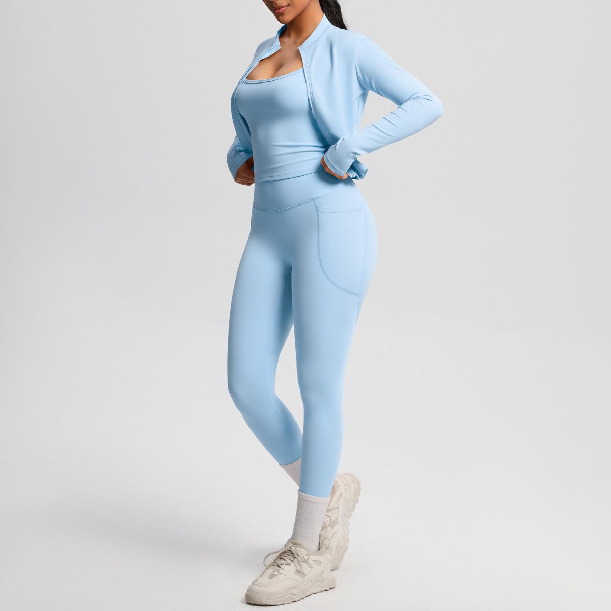 Traje de Yoga Ajustado Casual para Exterior Europeo y Americano con Bolsillo Secado Rápido Cintura Alta Adelgazante Fitness Sensación Nube Set Deportivo de Tres Piezas