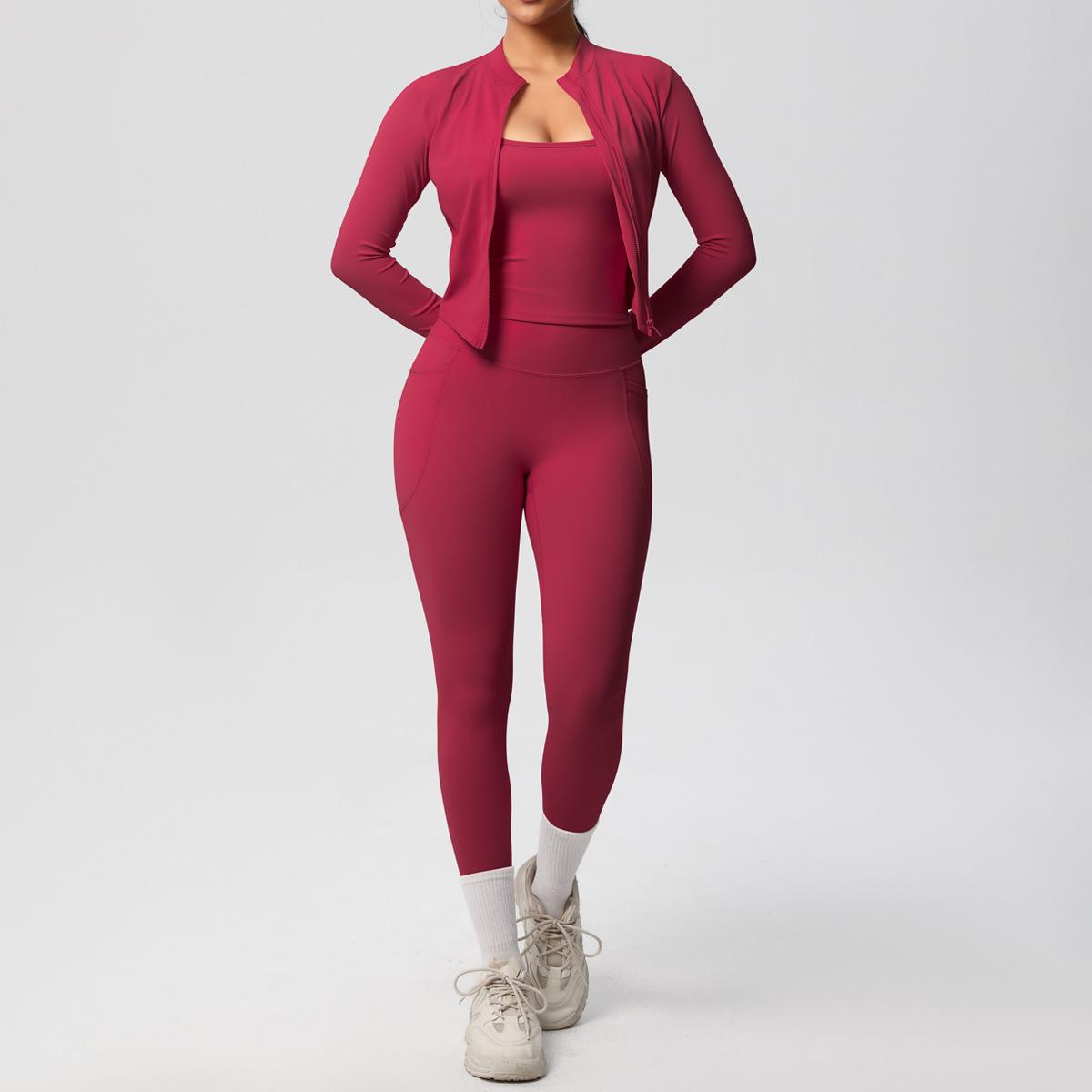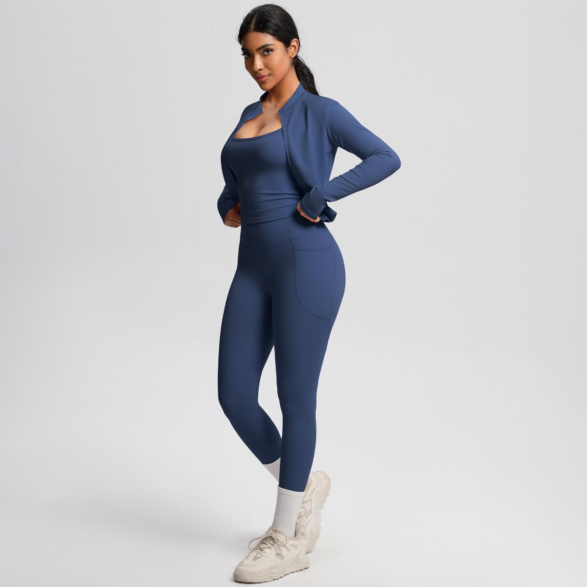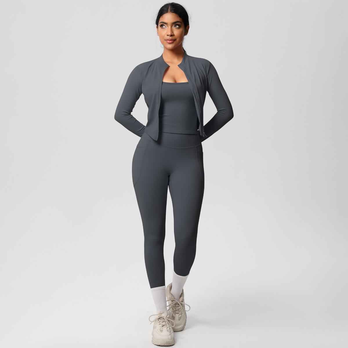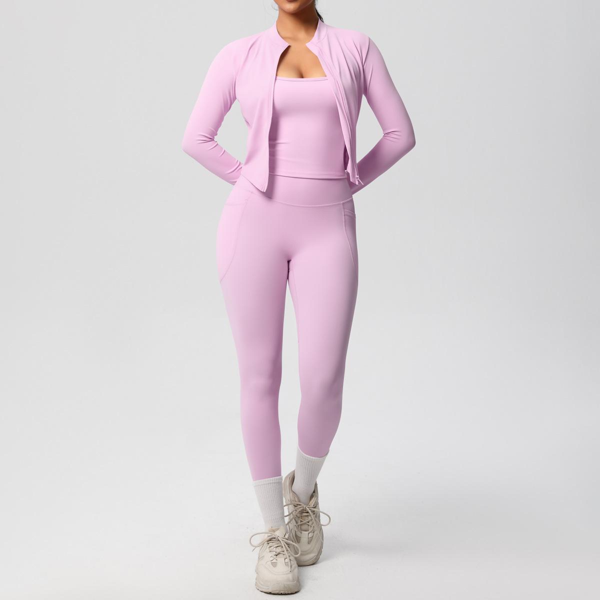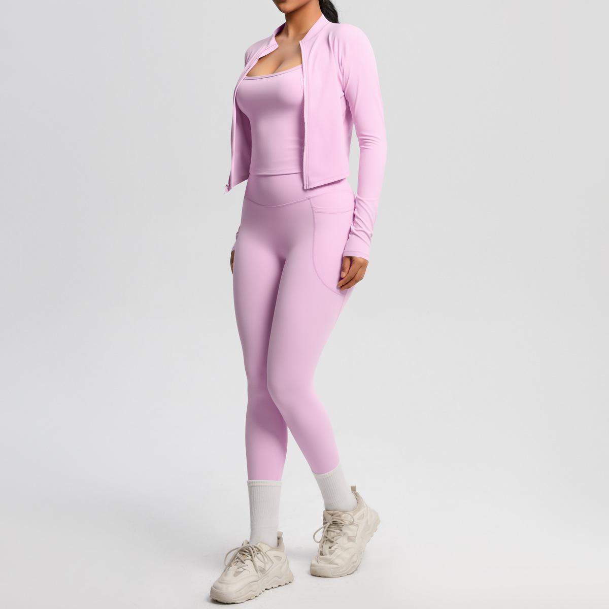 Traje de Yoga Ajustado Casual para Exterior Europeo y Americano con Bolsillo Secado Rápido Cintura Alta Adelgazante Fitness Sensación Nube Set Deportivo de Tres Piezas
