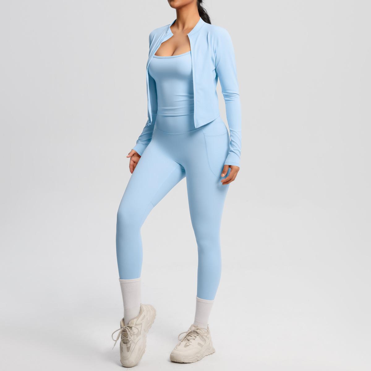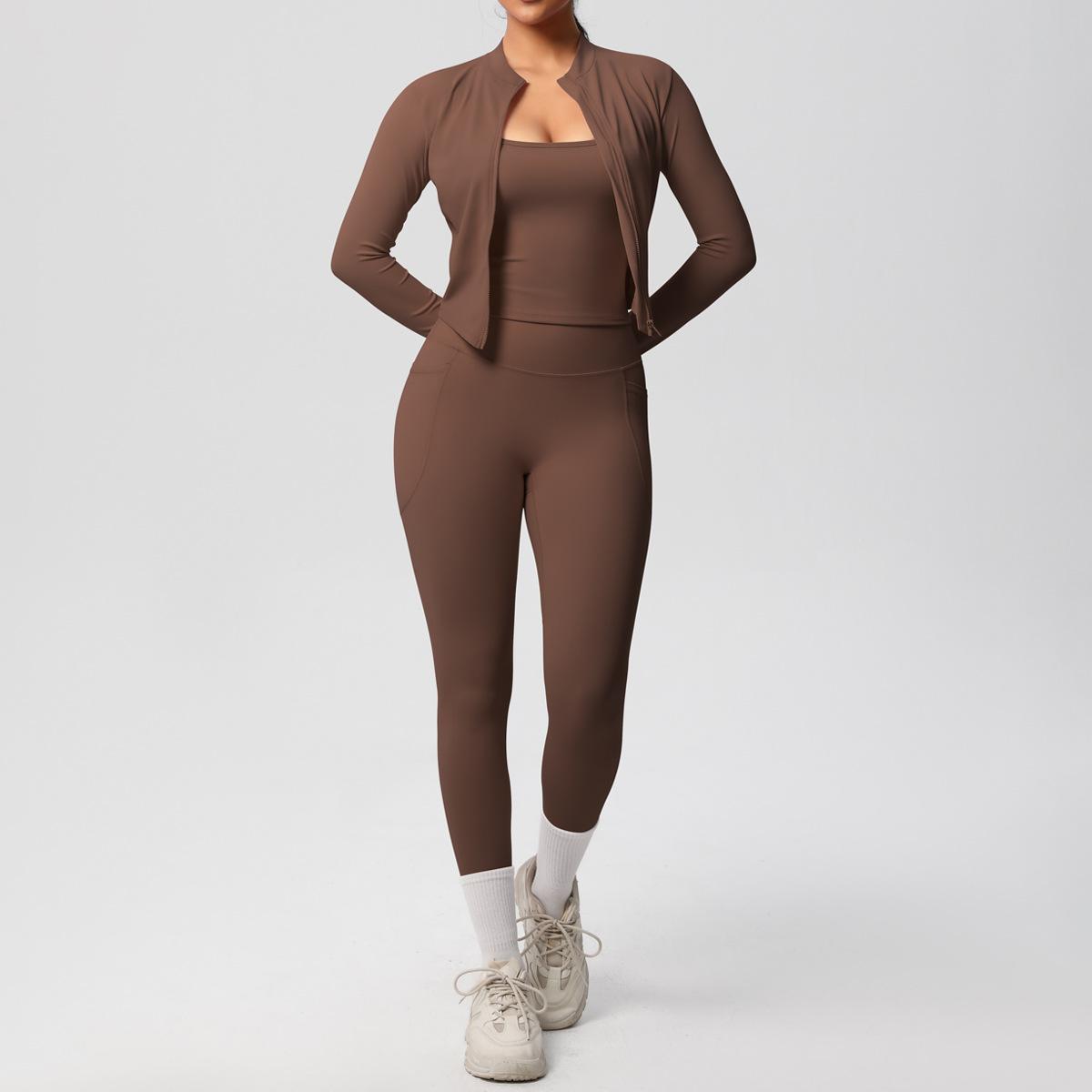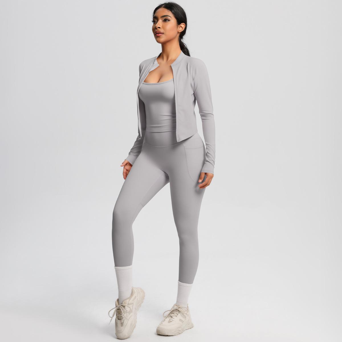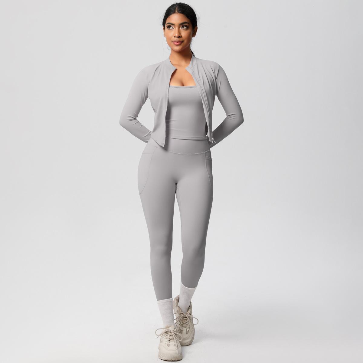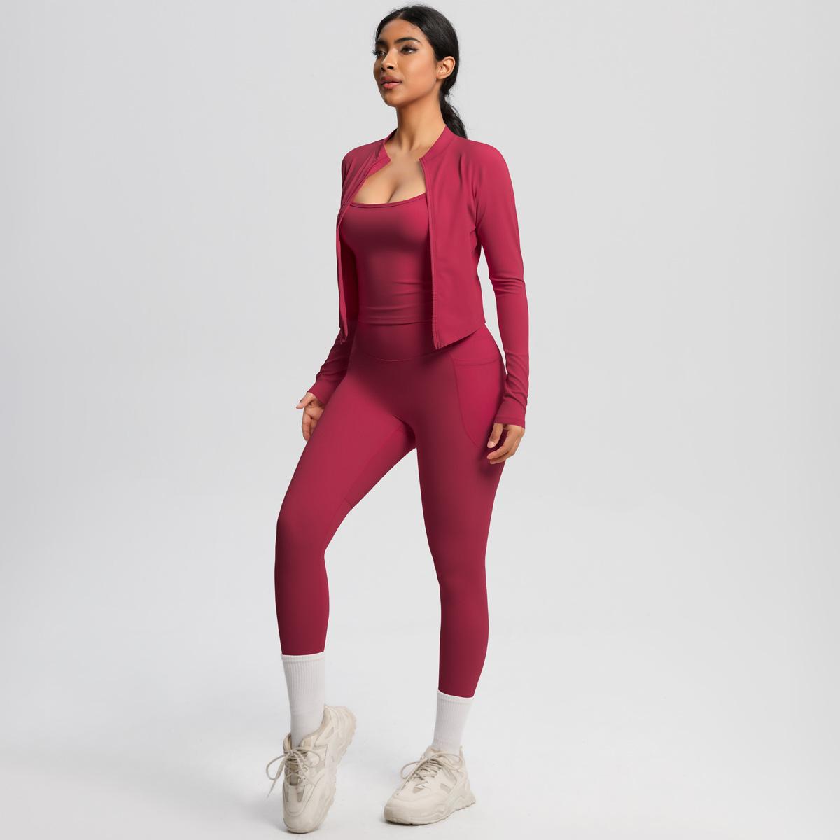 Traje de Yoga Ajustado Casual para Exterior Europeo y Americano con Bolsillo Secado Rápido Cintura Alta Adelgazante Fitness Sensación Nube Set Deportivo de Tres Piezas