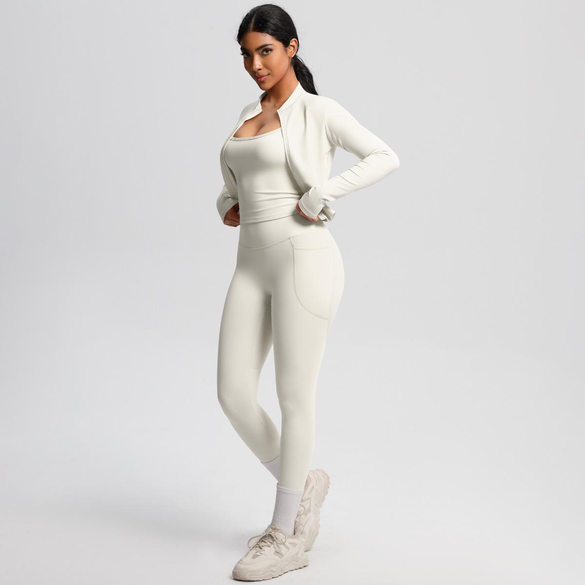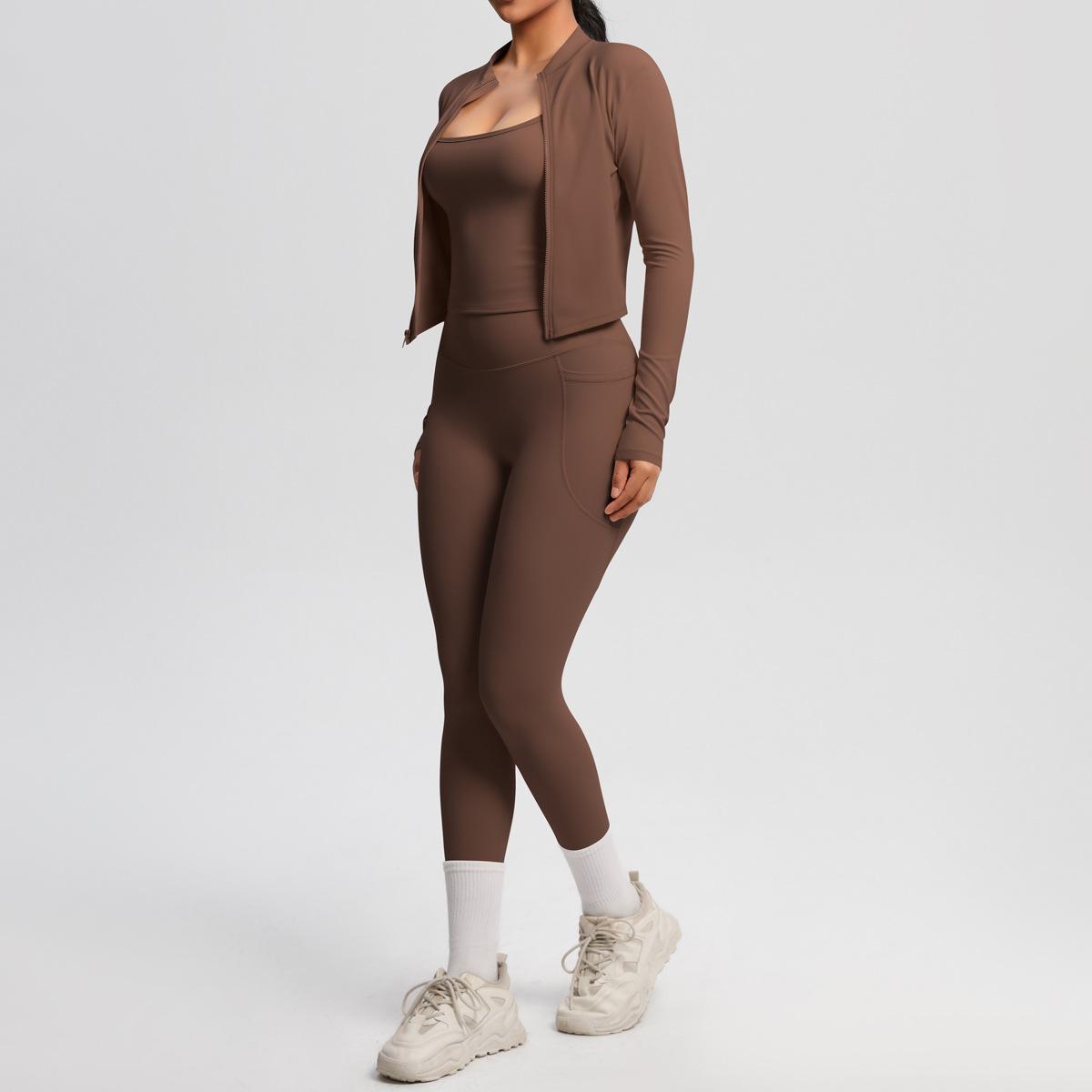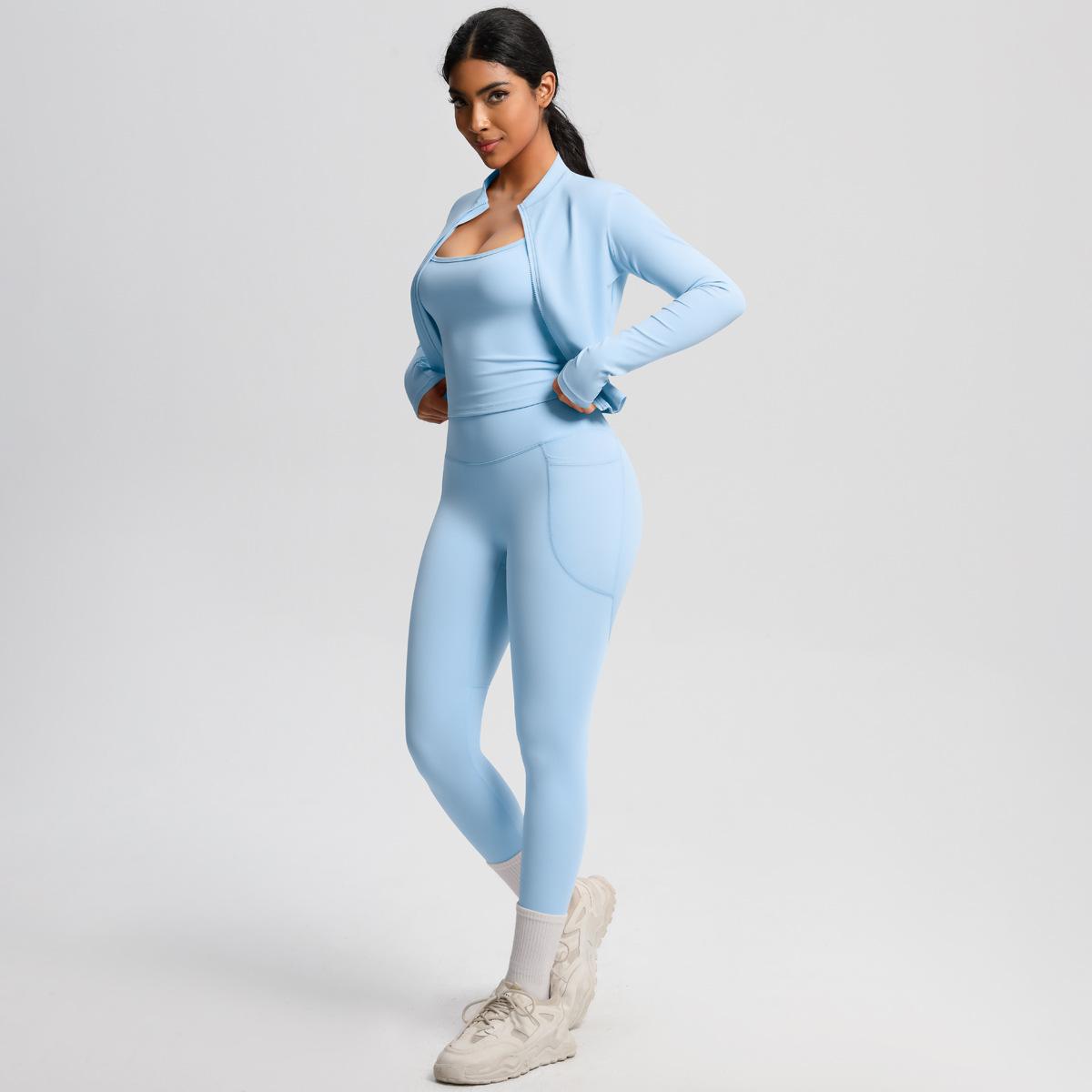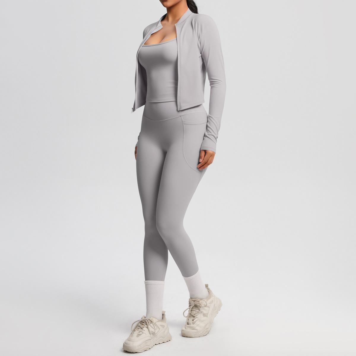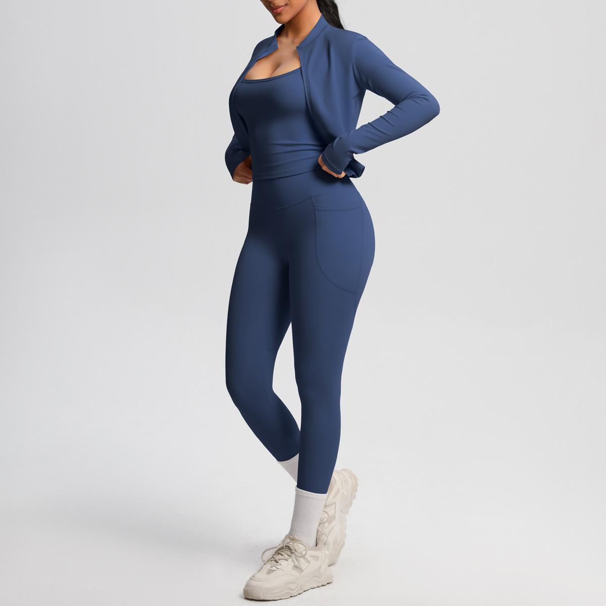 Traje de Yoga Ajustado Casual para Exterior Europeo y Americano con Bolsillo Secado Rápido Cintura Alta Adelgazante Fitness Sensación Nube Set Deportivo de Tres Piezas