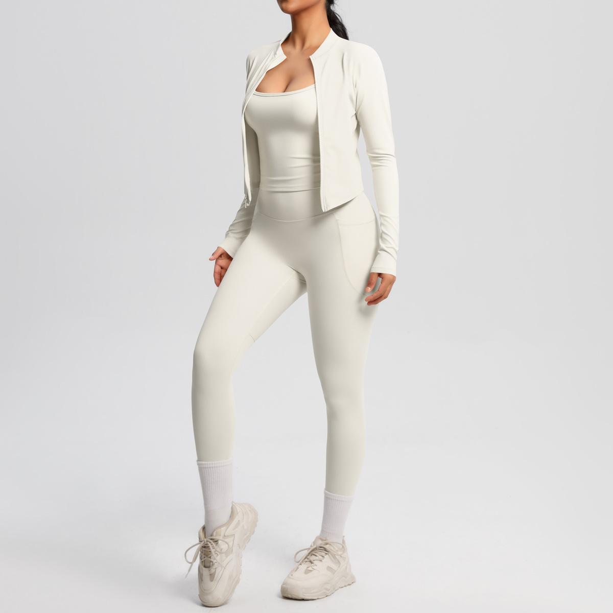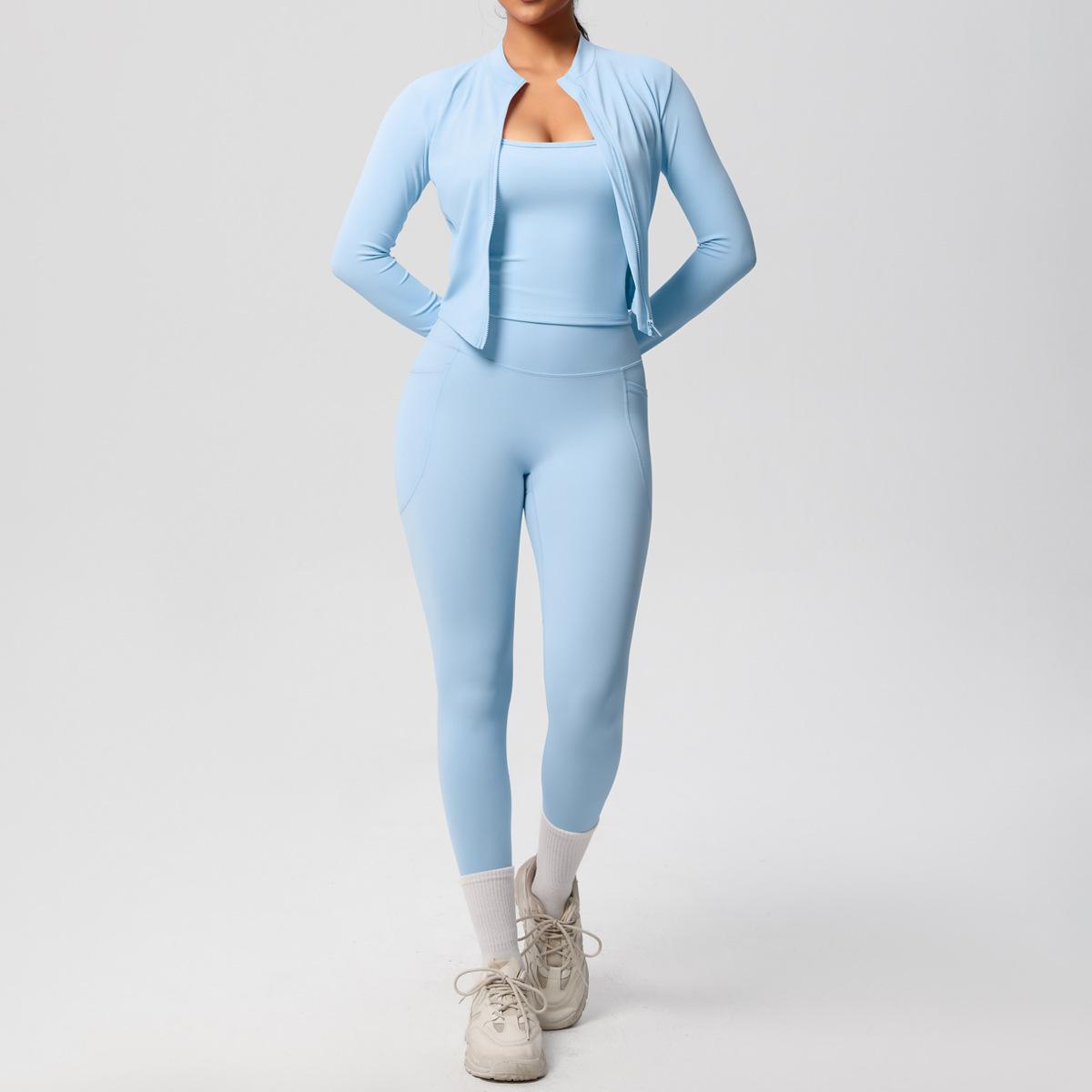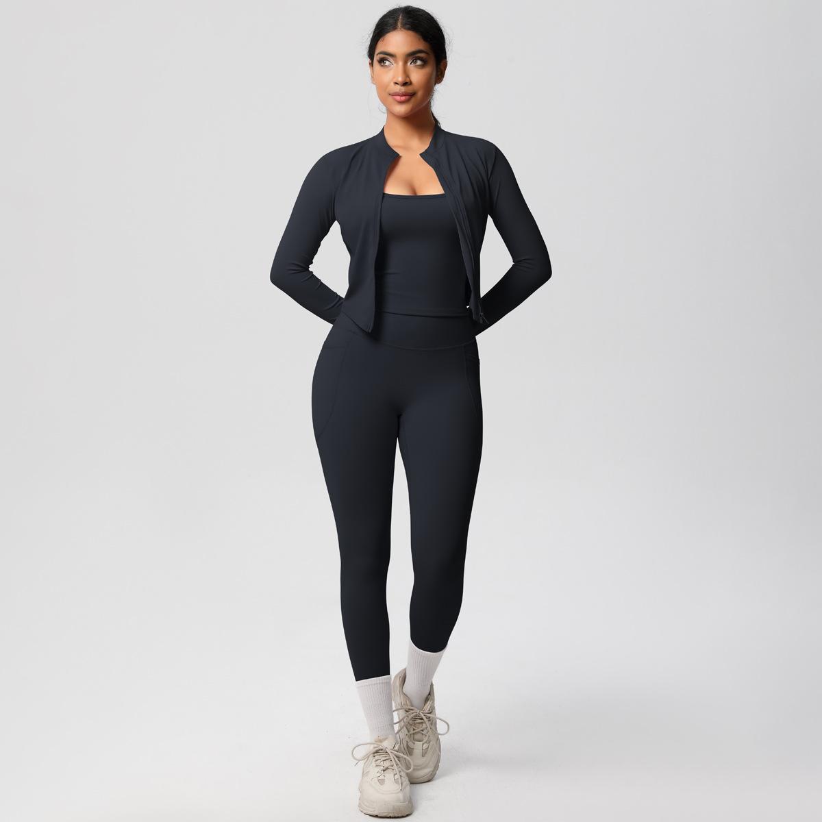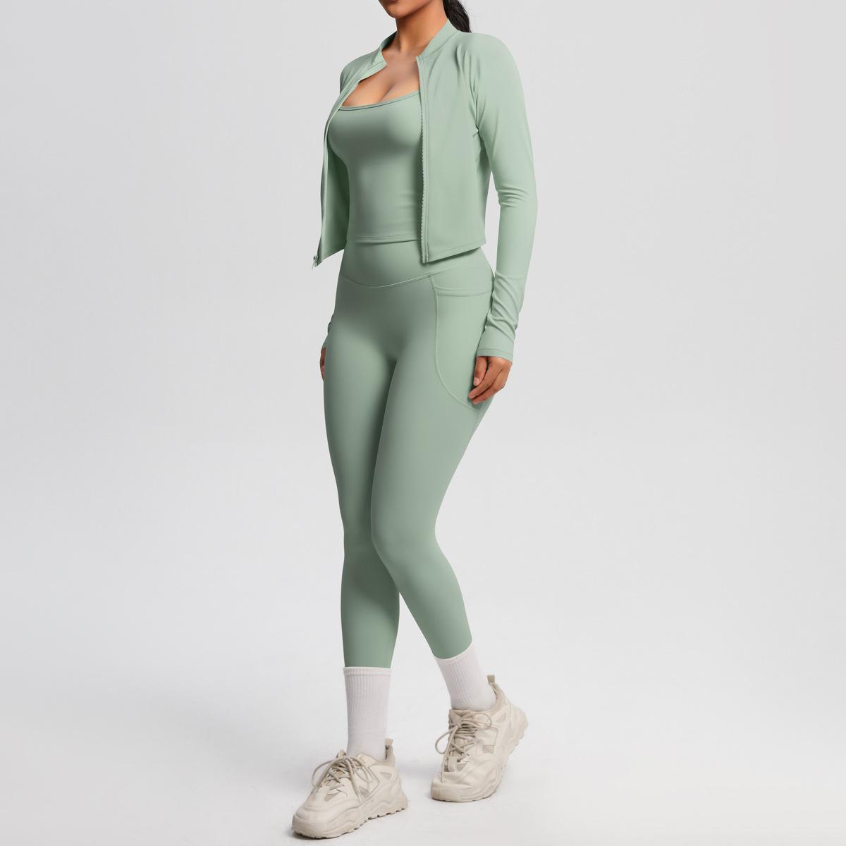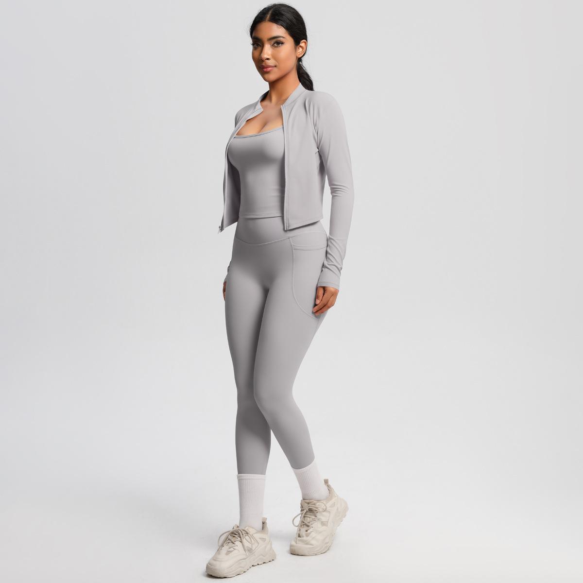 Traje de Yoga Ajustado Casual para Exterior Europeo y Americano con Bolsillo Secado Rápido Cintura Alta Adelgazante Fitness Sensación Nube Set Deportivo de Tres Piezas