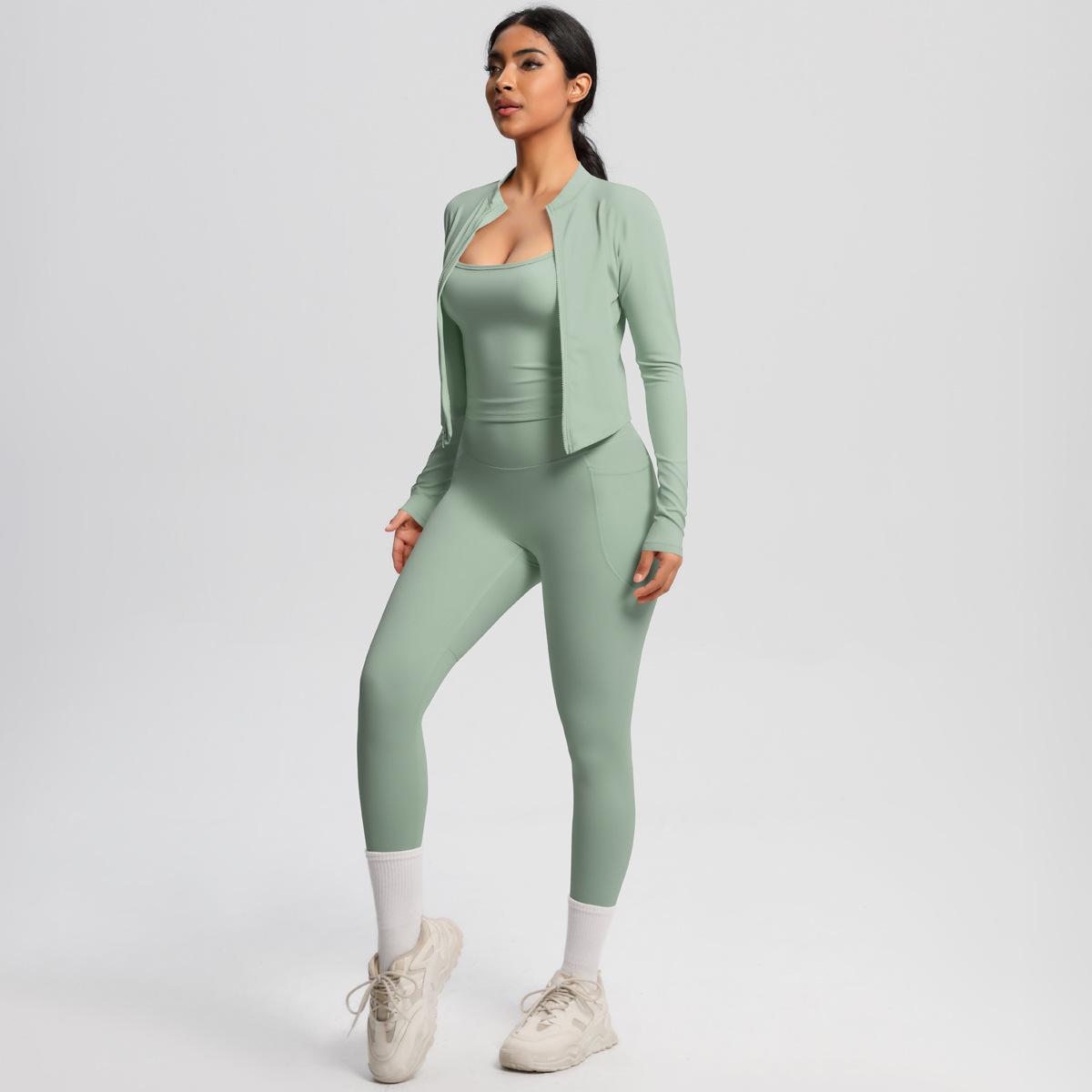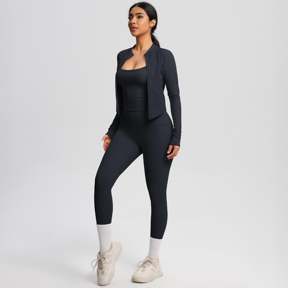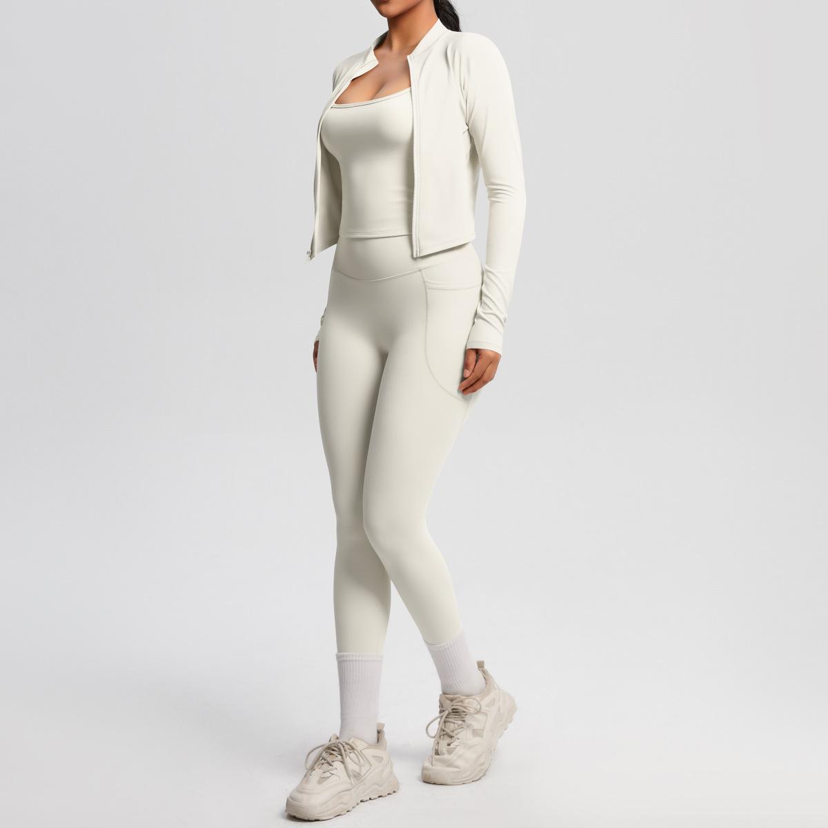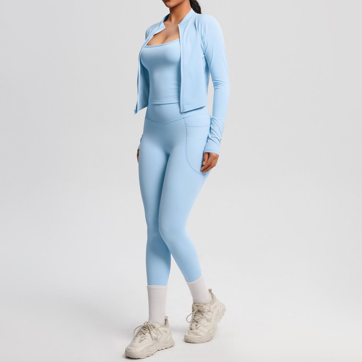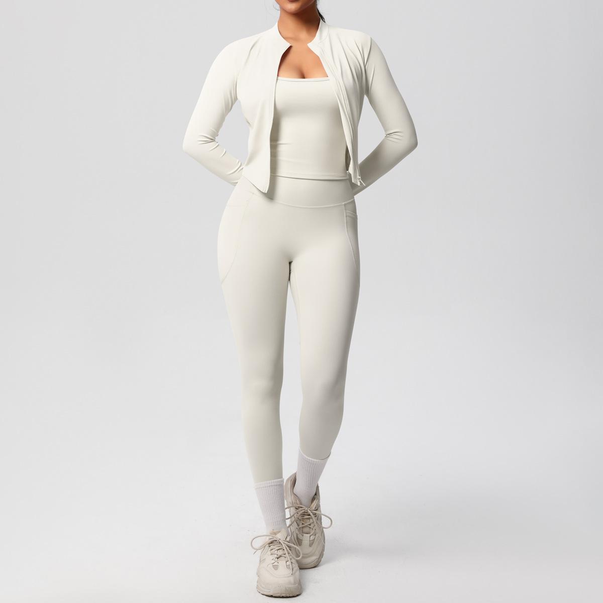 Traje de Yoga Ajustado Casual para Exterior Europeo y Americano con Bolsillo Secado Rápido Cintura Alta Adelgazante Fitness Sensación Nube Set Deportivo de Tres Piezas