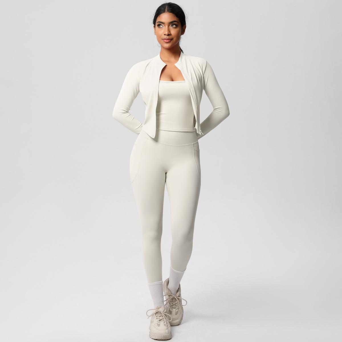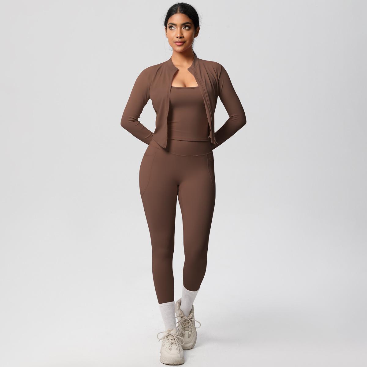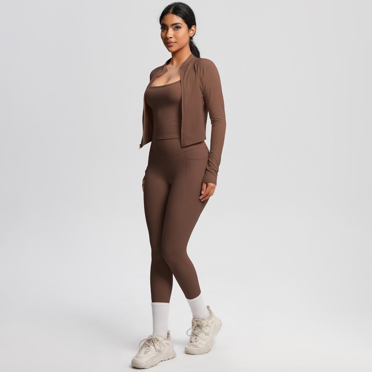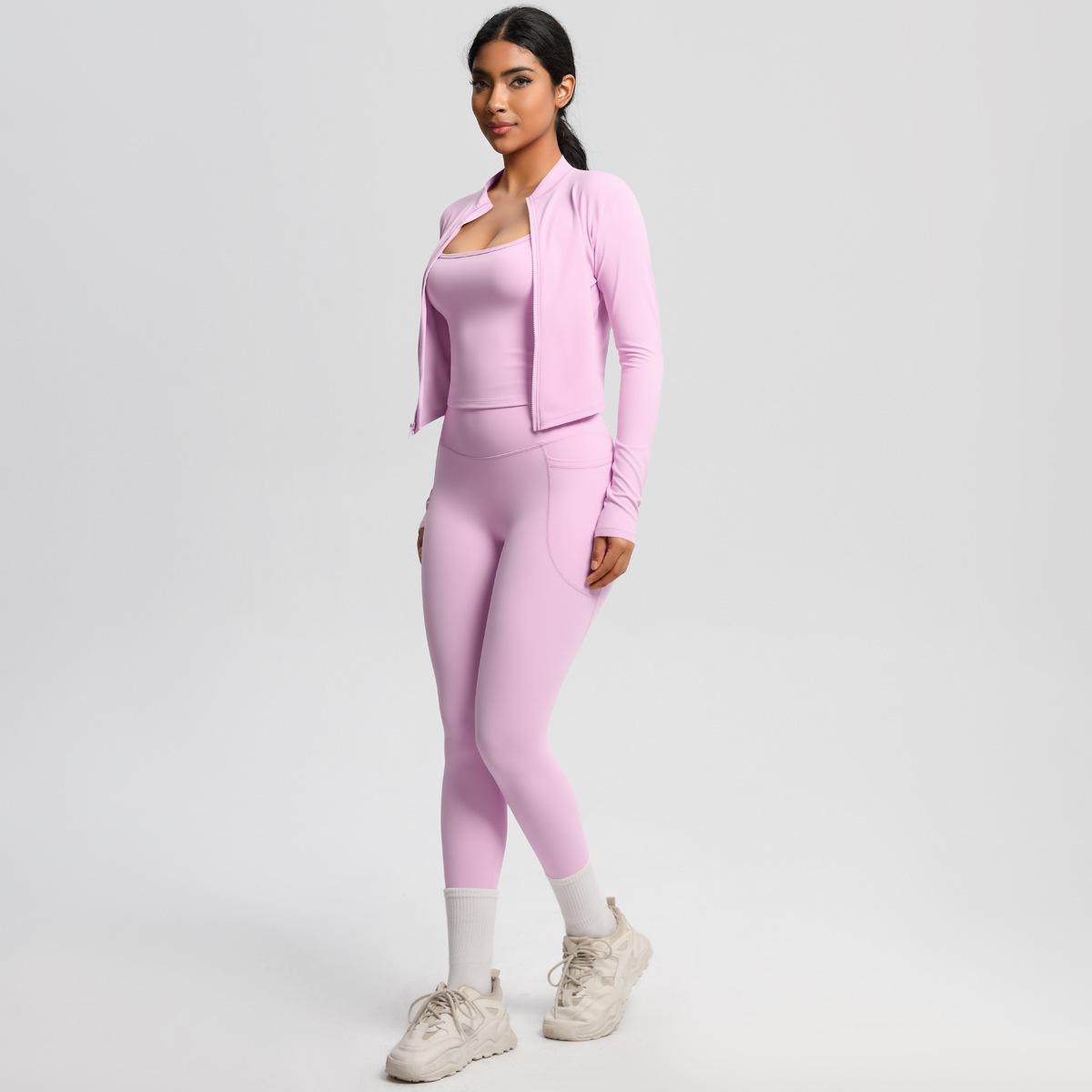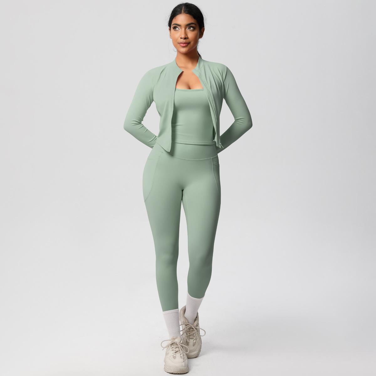Traje de Yoga Ajustado Casual para Exterior Europeo y Americano con Bolsillo Secado Rápido Cintura Alta Adelgazante Fitness Sensación Nube Set Deportivo de Tres Piezas