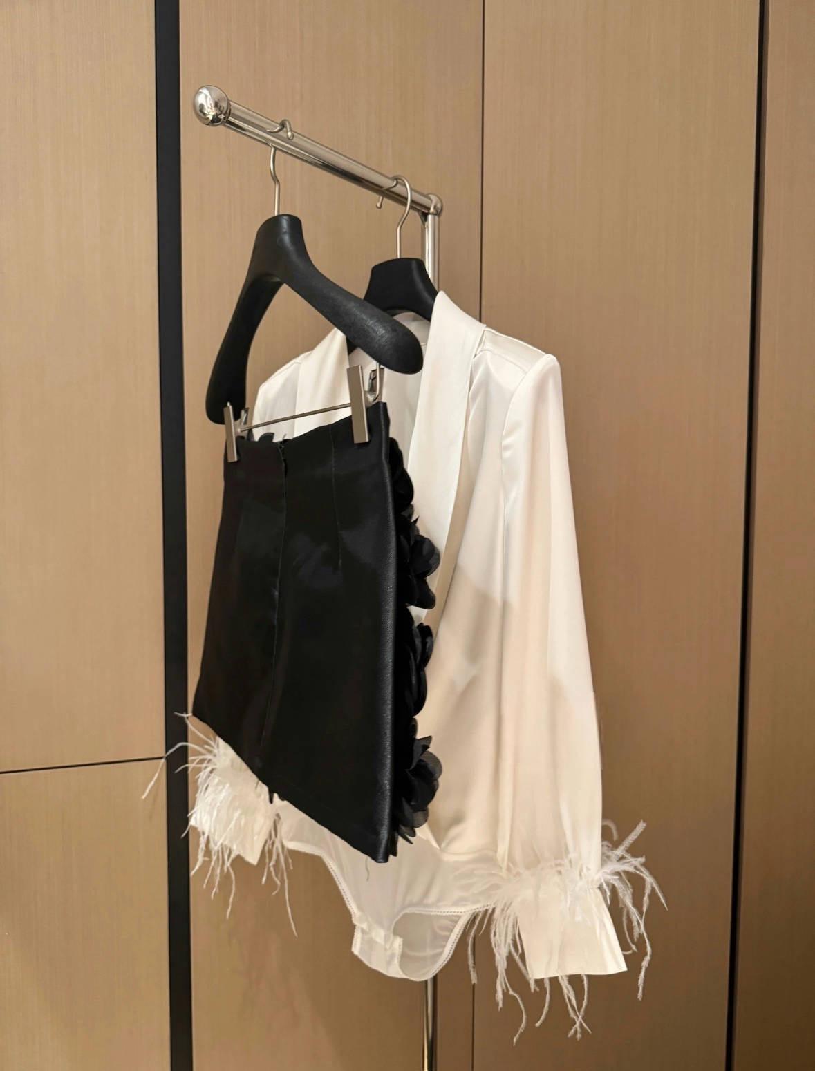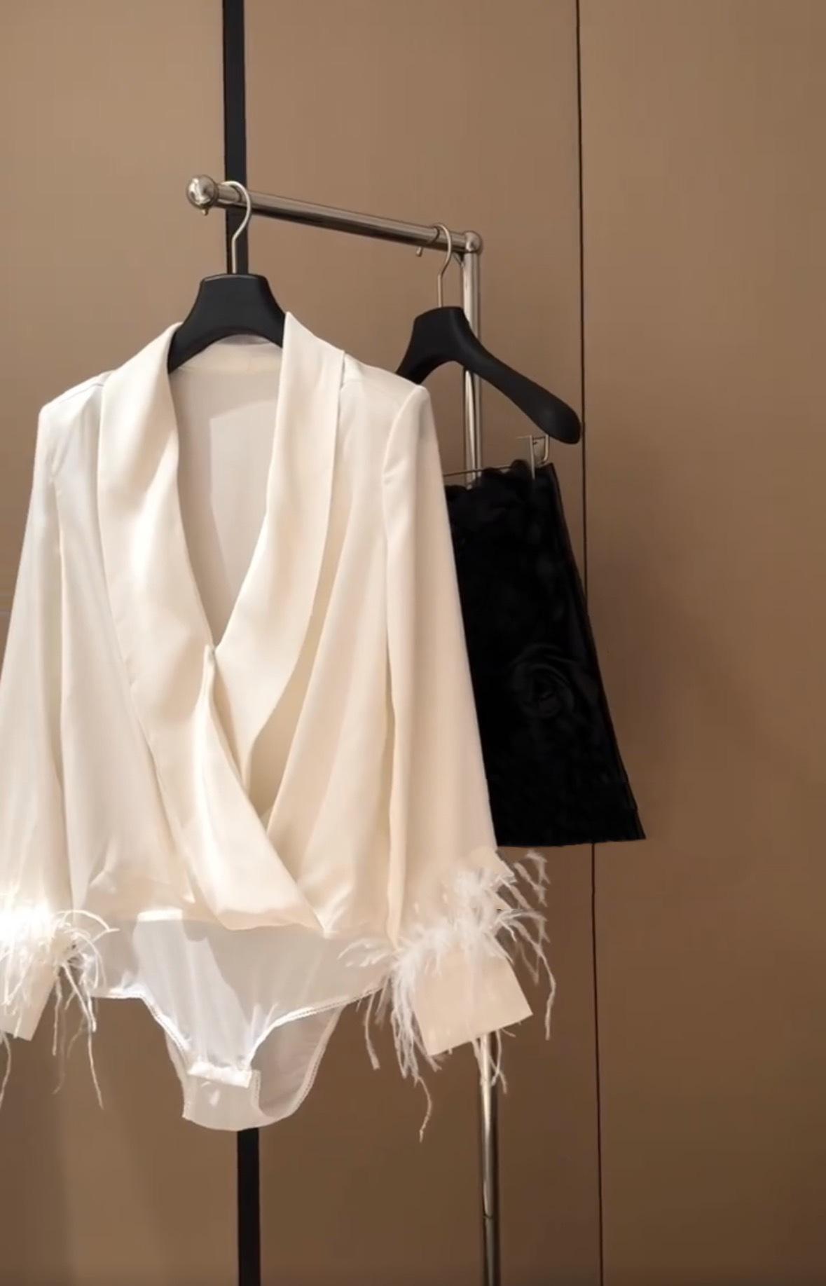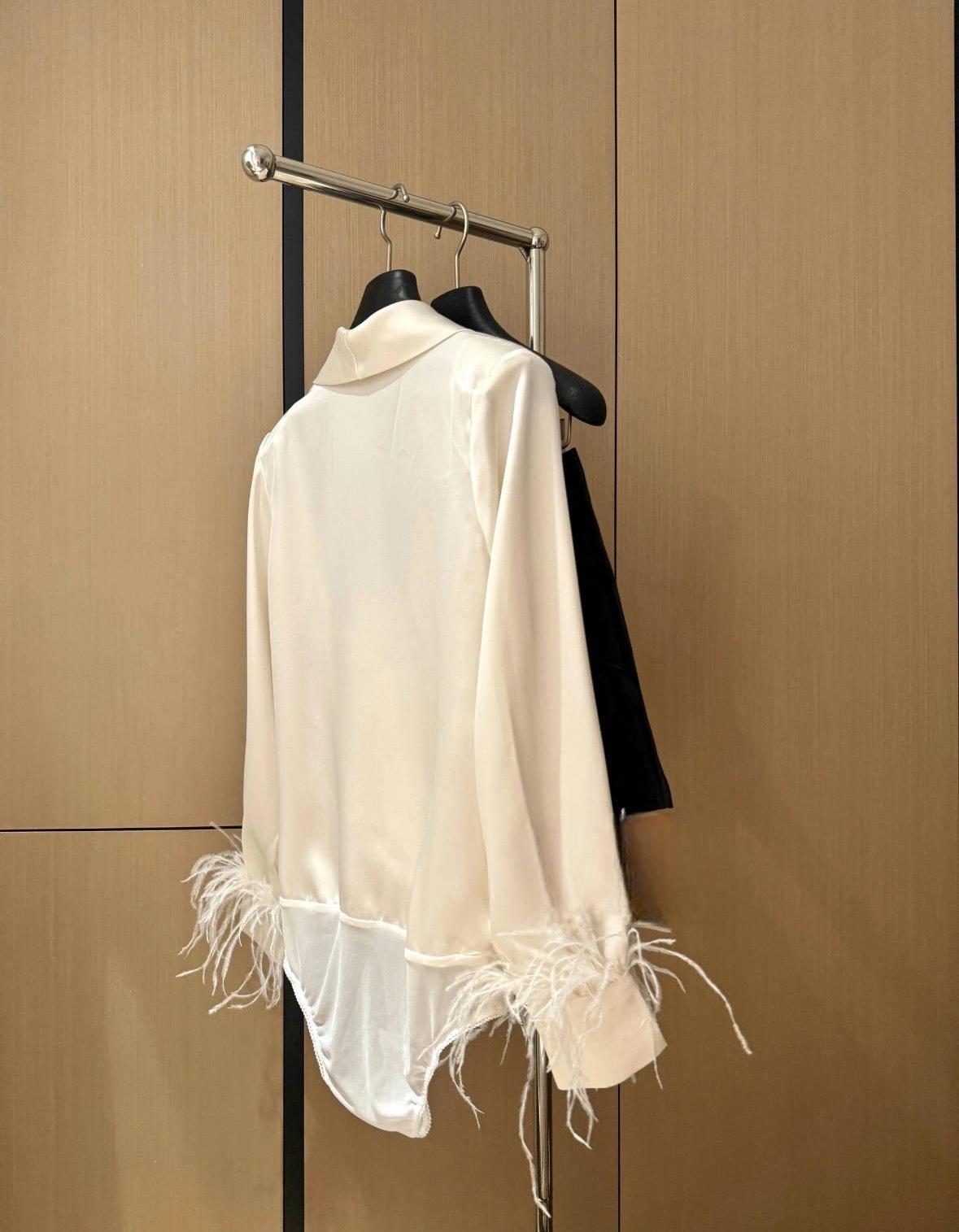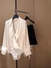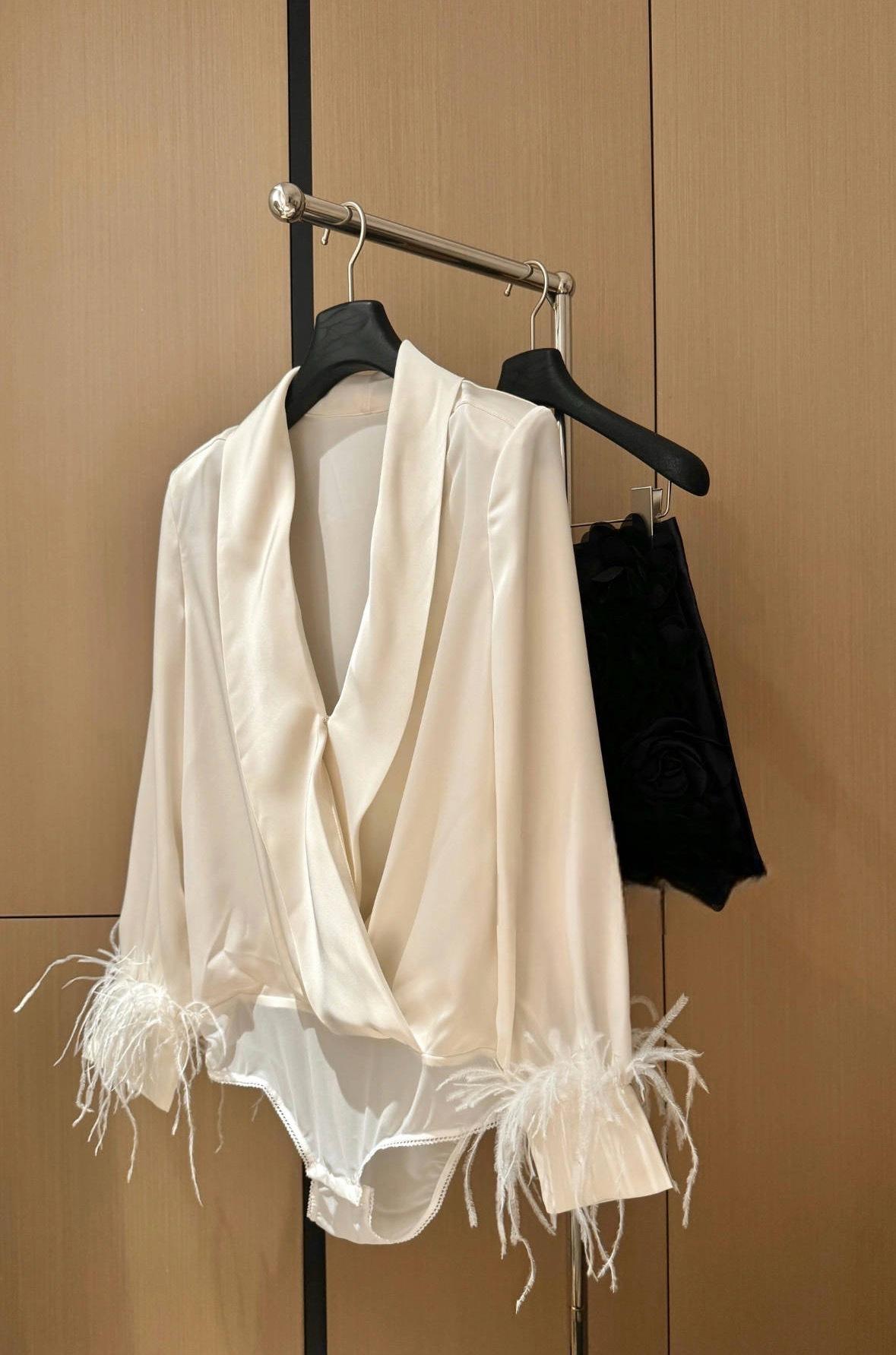 25 Primavera Estilo Francés Elegante Satén Cuello en V Super Hada Dama Suave Pluma Manga Larga Camisa de Mujer Lujo Ligero Combinable Forro