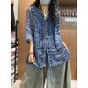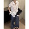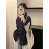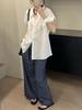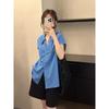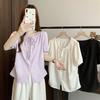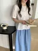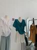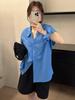 Camisa de Manga Corta Mmc para Mujer Verano Azul Cuello en V Camisa Estilo Occidental con Diseño Encaje Empalmado Top con Lazo para el Cabello de Intestino Grueso