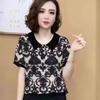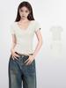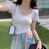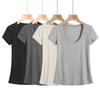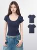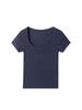 Azul marino cuello en U Grande Cuello Hombro Manga Corta Camiseta de Verano para Mujer Corta Ajustada Delgada Adelgazante Pequeña Top