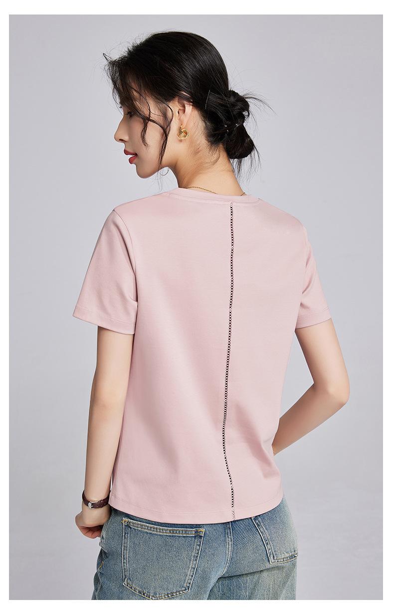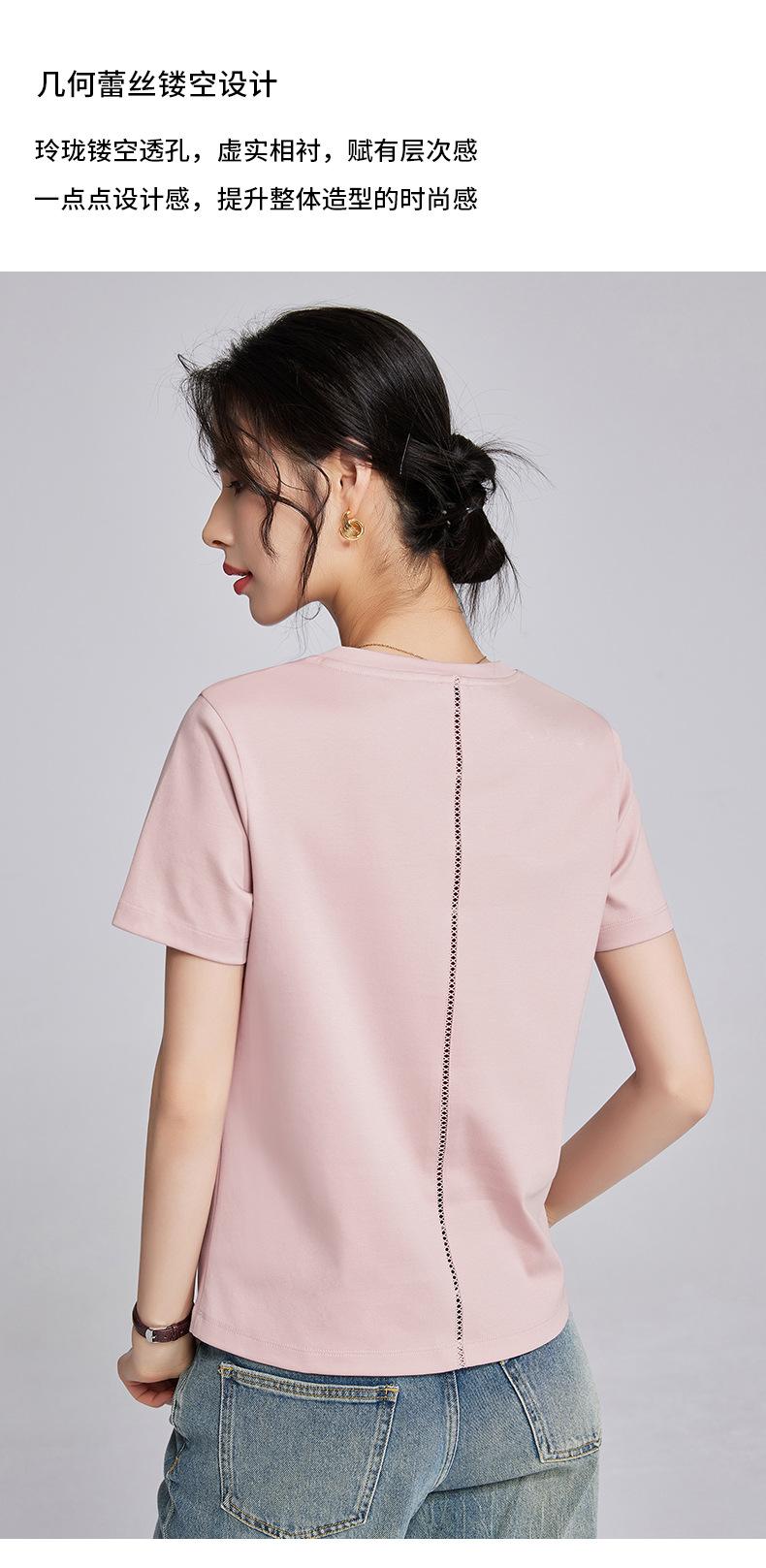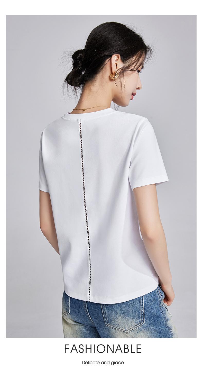 Camiseta de Hombro Manga Corta para Mujer Diseño de Agujas de Flores en la Espalda Verano 2025 Encaje Calado Cinta Algodón Mercerizado Sensación Fresca