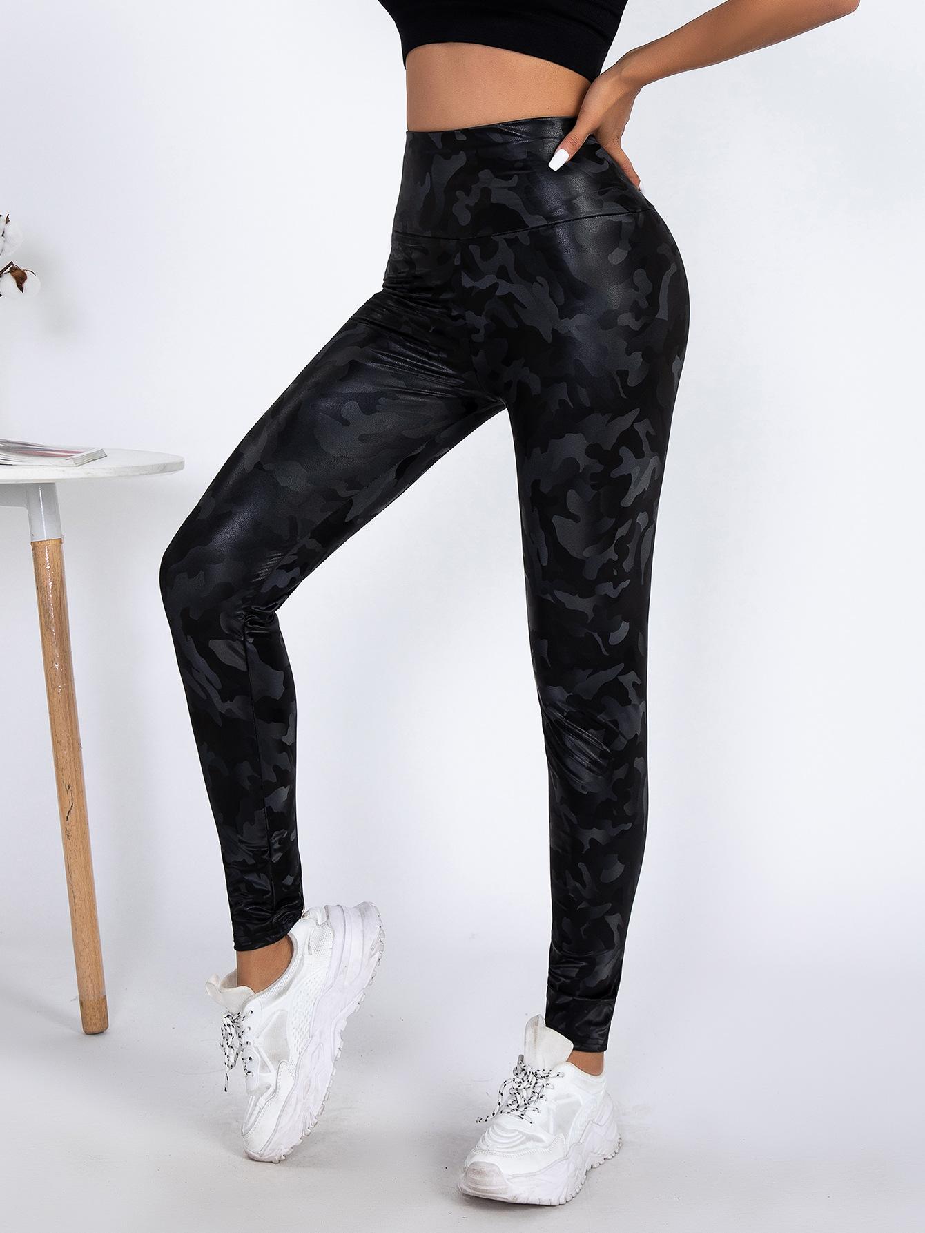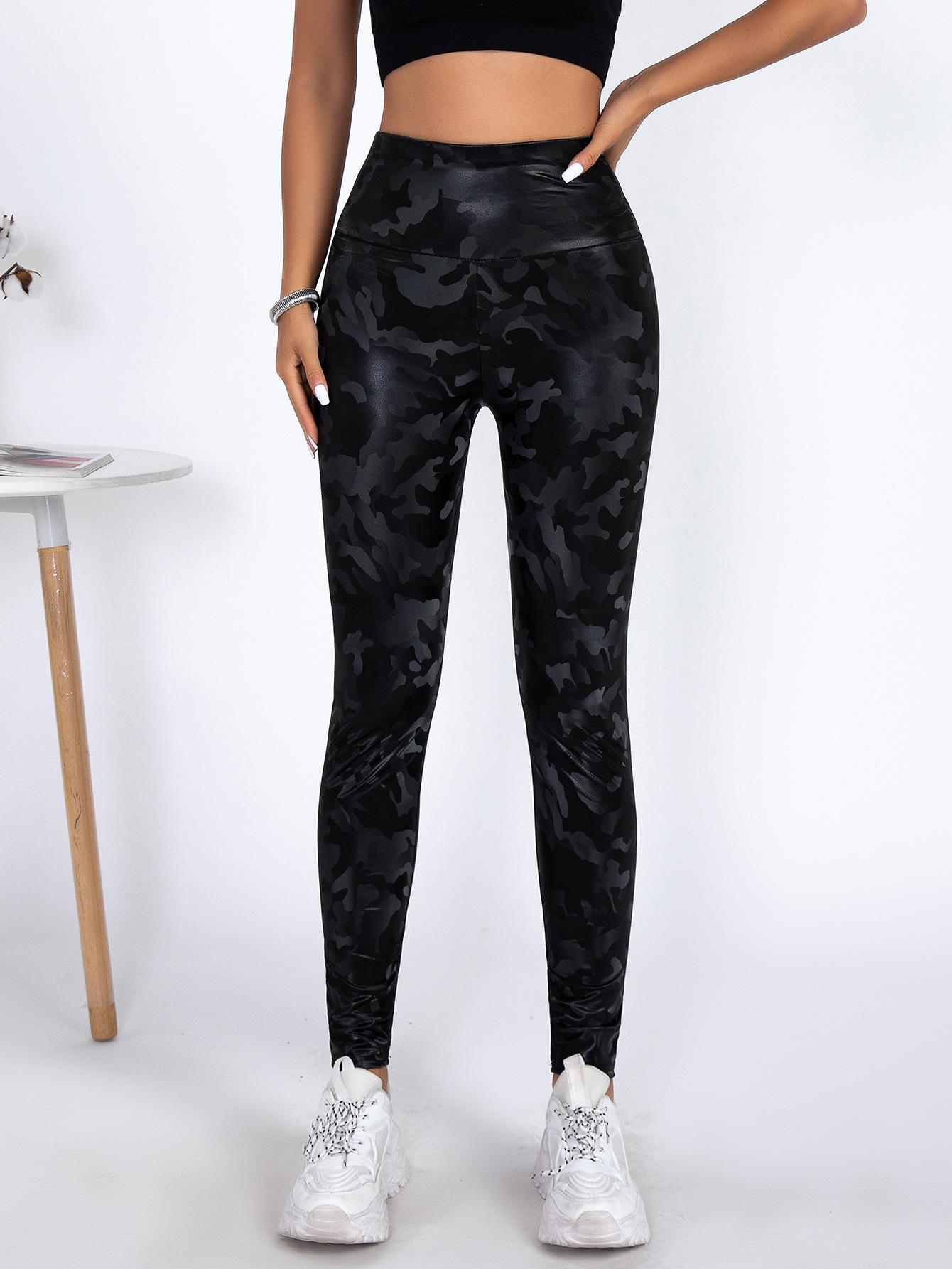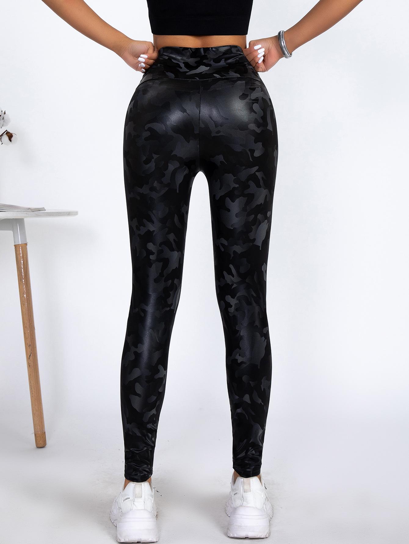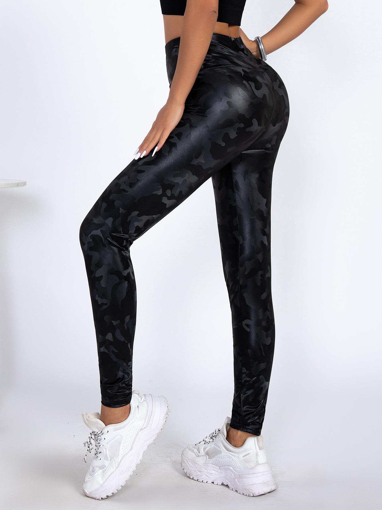 TEMU Pantalones de Cuero PU Ajustados de Cintura Alta de Venta Caliente con Camuflaje para Mujer Europeos y Americanos Sexy Ajustados Deportivos Yoga Leggings Recortados