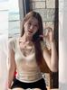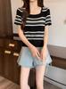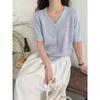 Camiseta Minimalista de Cuello en V Tejido de Punto Vertical de Canalé para Mujer Diseño con Sentido Primavera y Verano Combinación Total Top Puro de Manga Corta