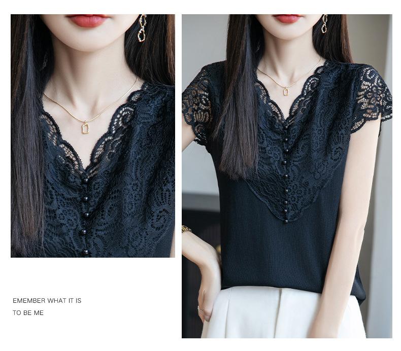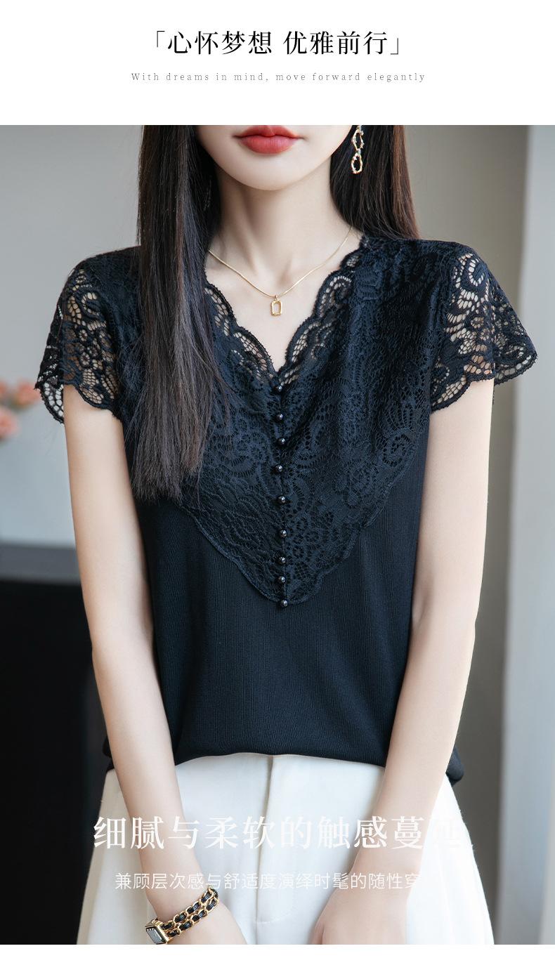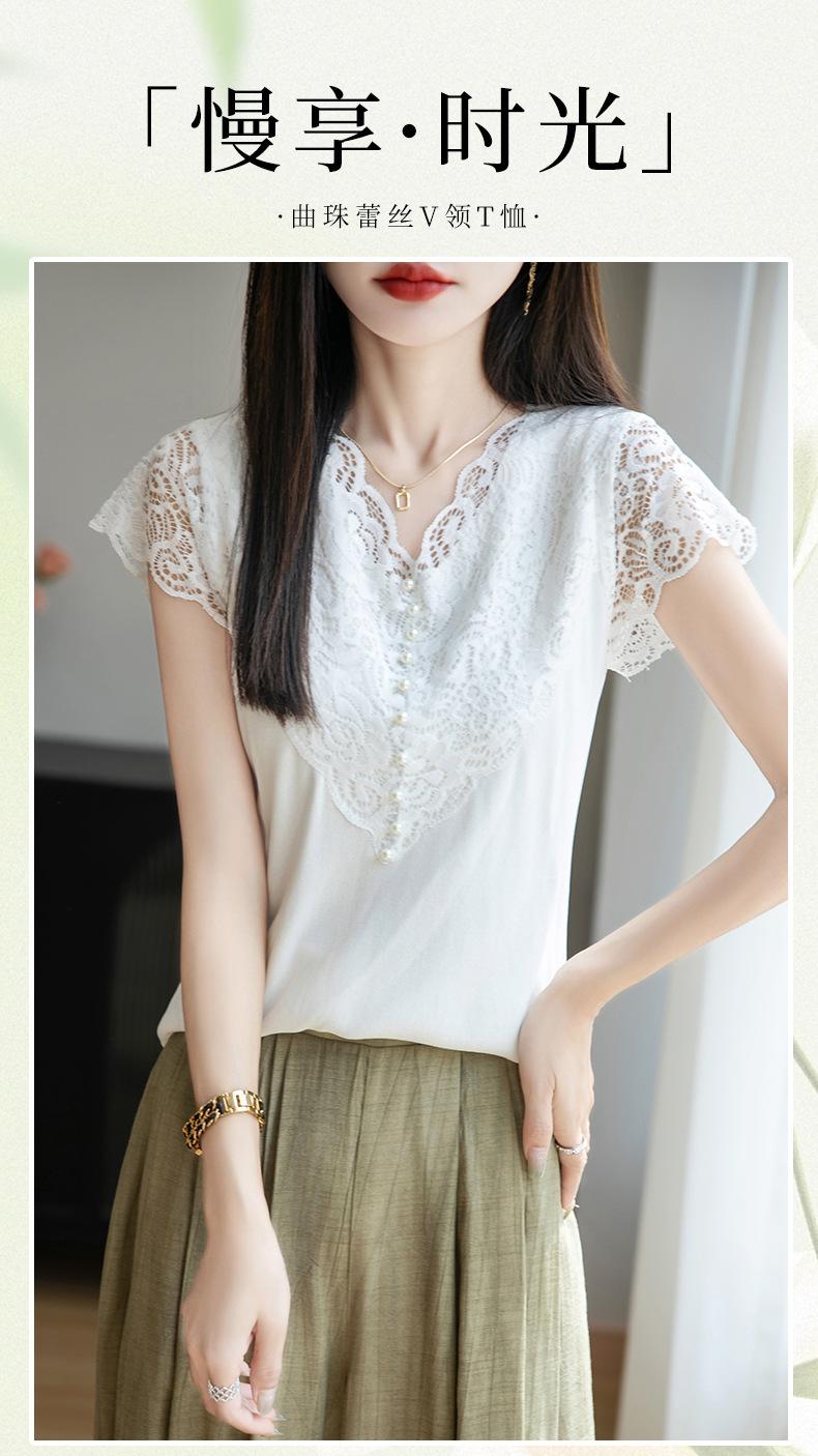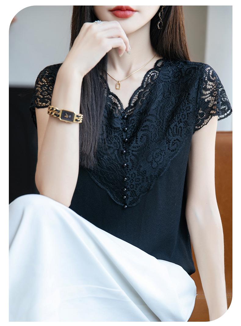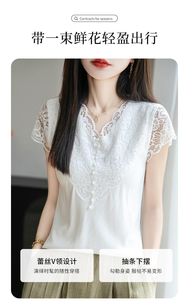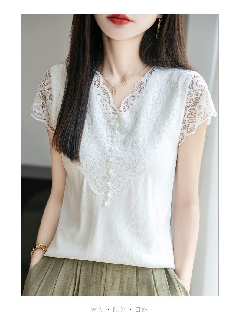 Top Base de Mujer Elegante Versátil con Encaje de Cuello en V de Manga Corta Calado con Cuentas de Color Sólido Verano Adelgazante para Viaje