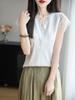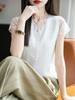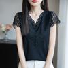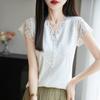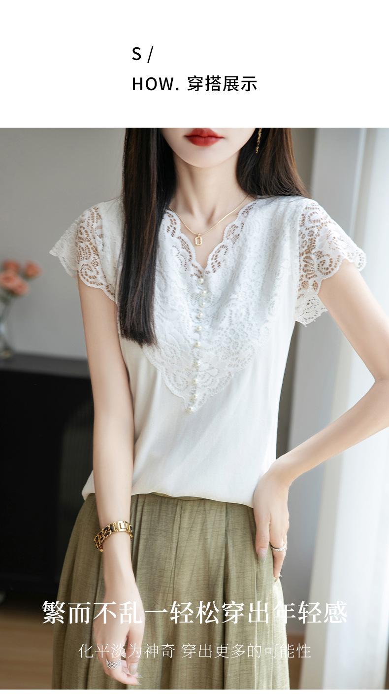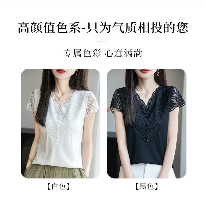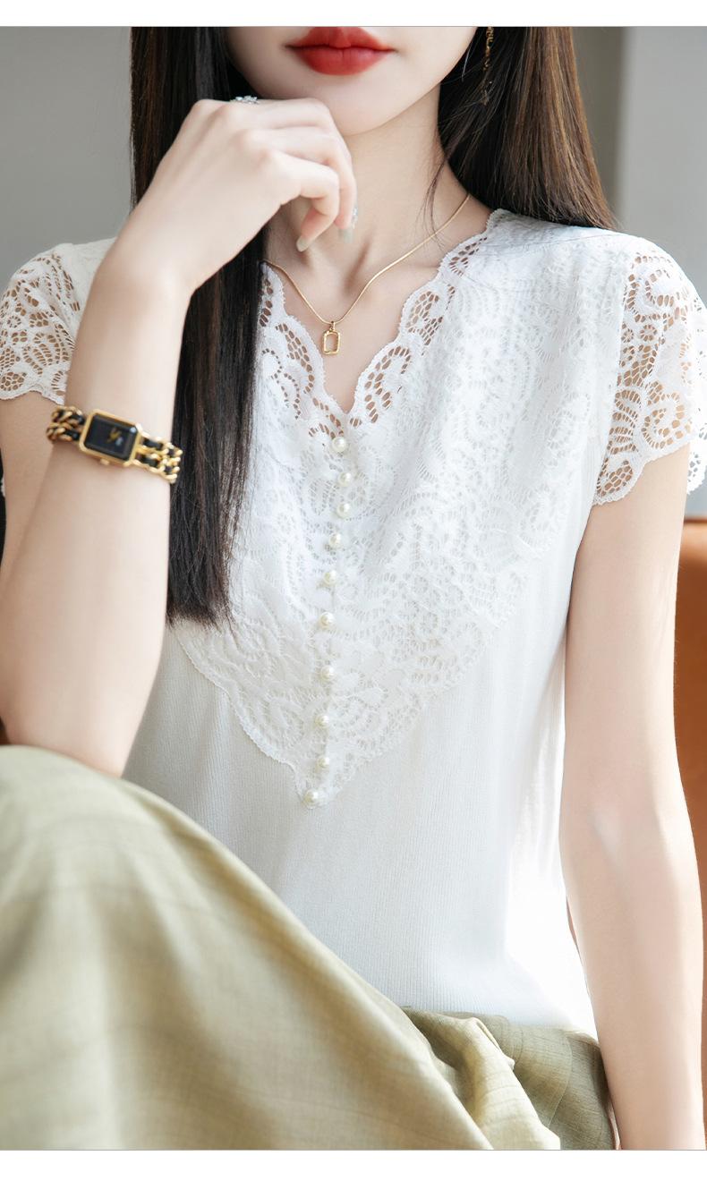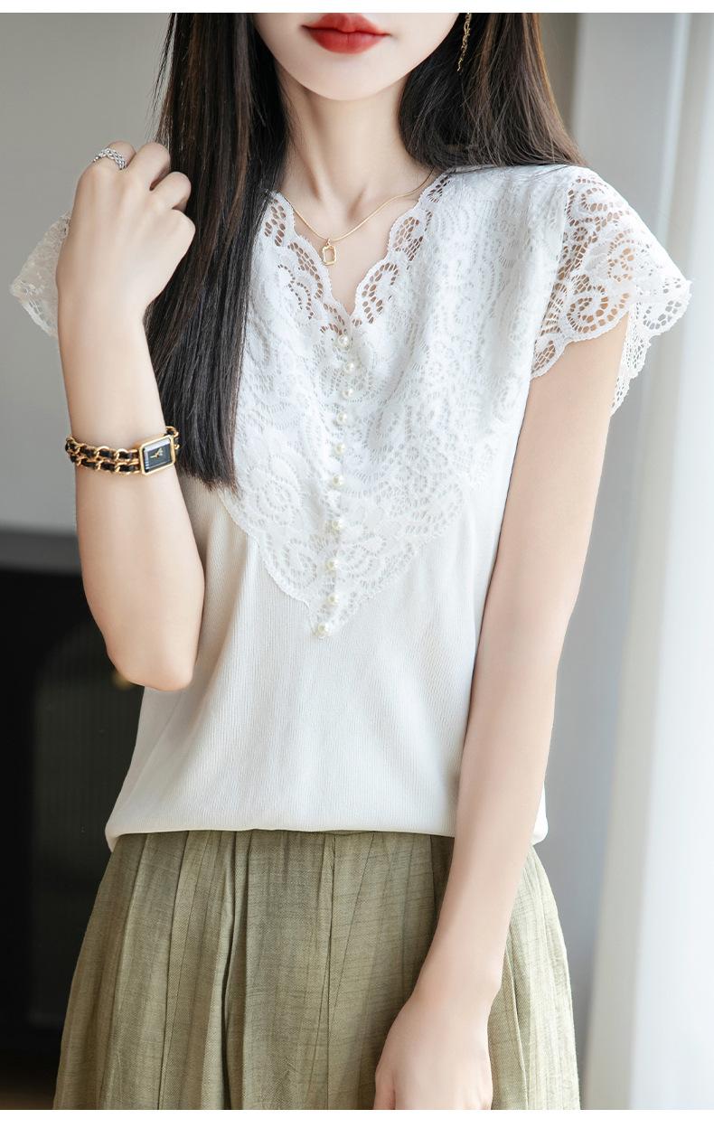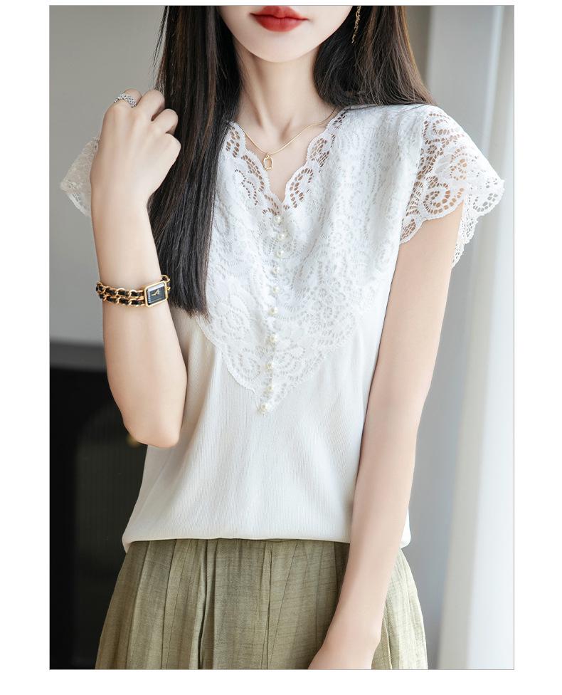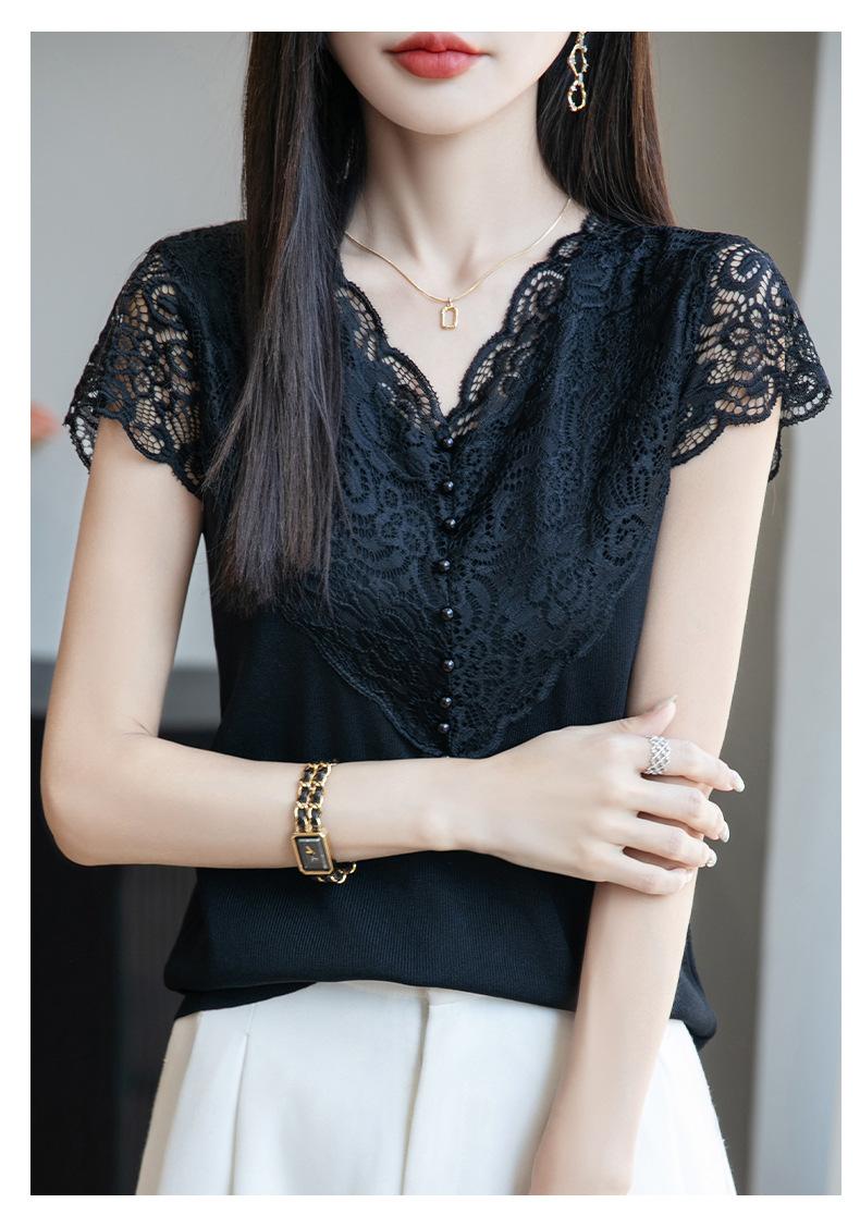 Top Base de Mujer Elegante Versátil con Encaje de Cuello en V de Manga Corta Calado con Cuentas de Color Sólido Verano Adelgazante para Viaje