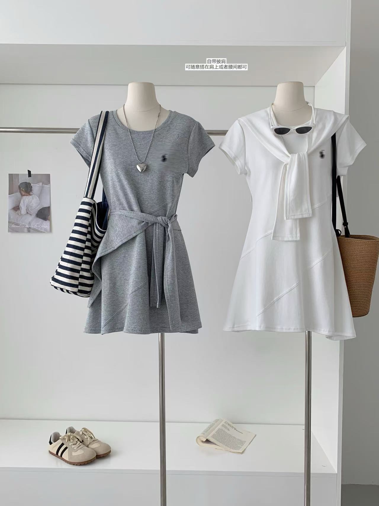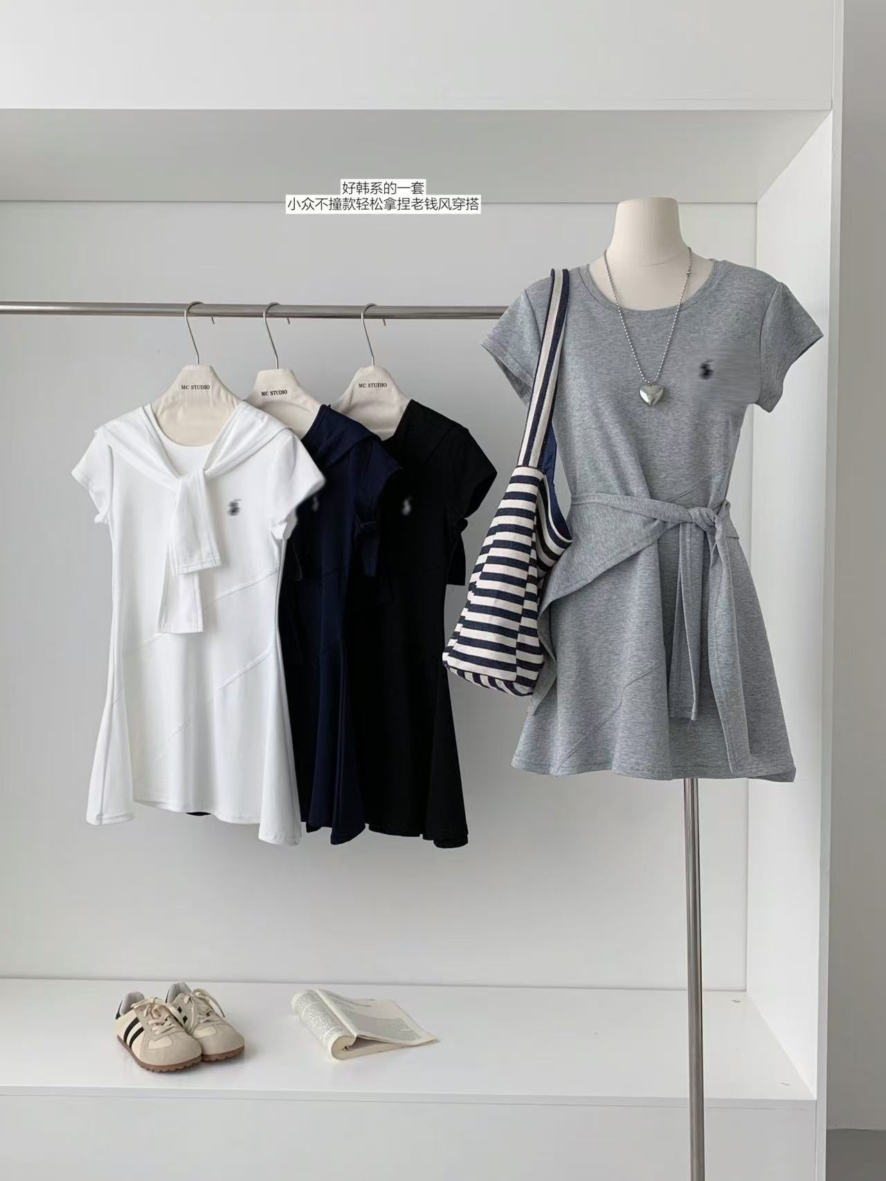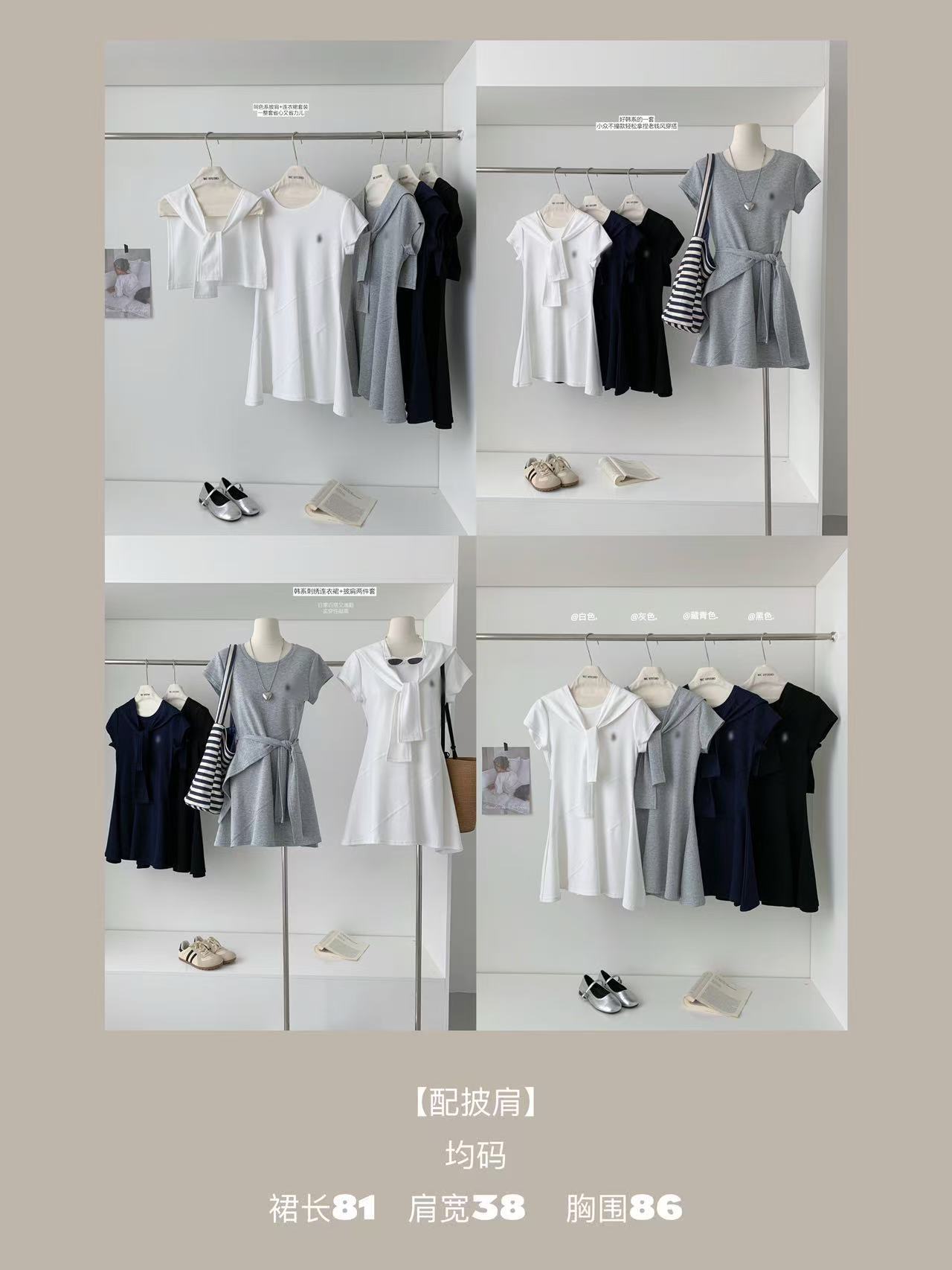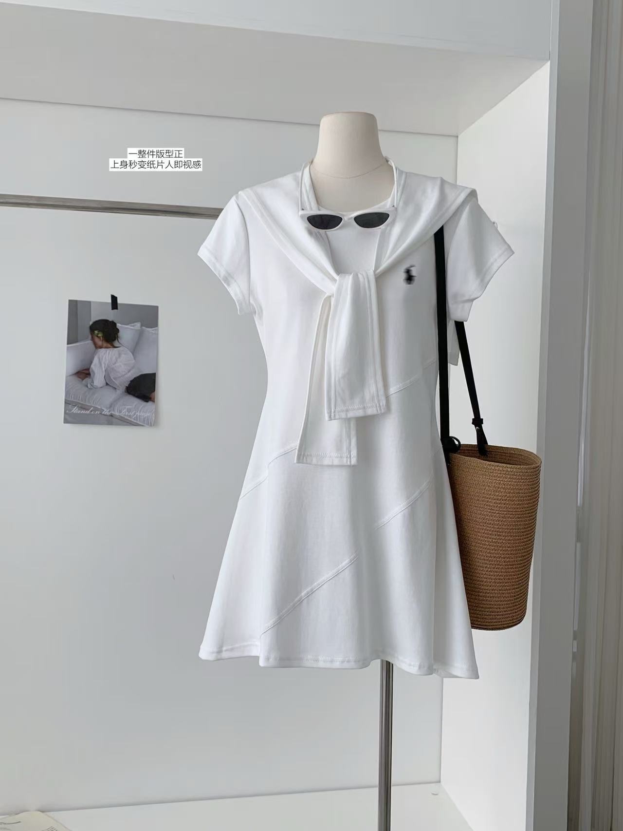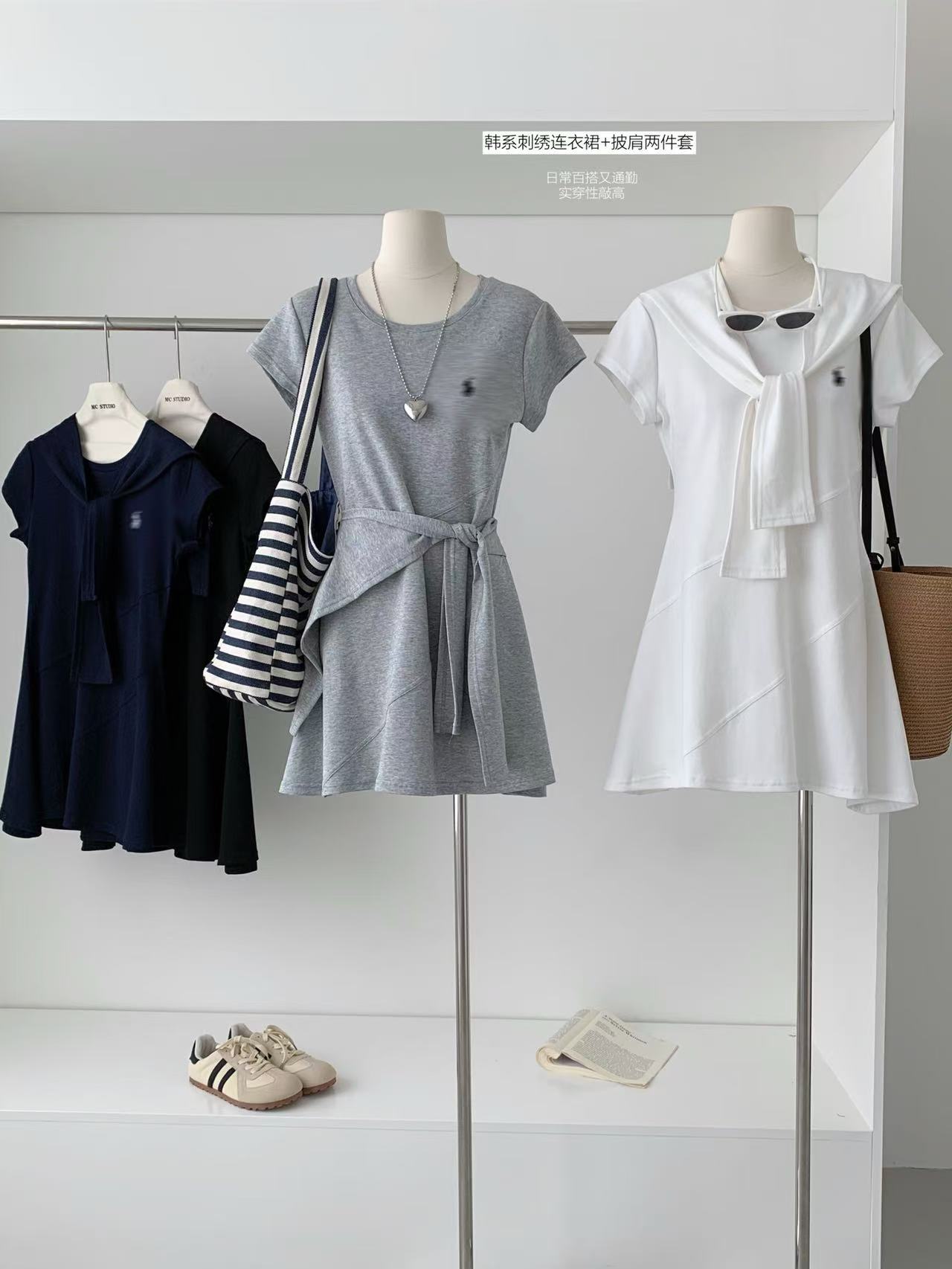 Verano Coreano Nuevo Estilo Sencillo y Versátil Vestido Bordado de Pony + Chal Set de Dos Piezas