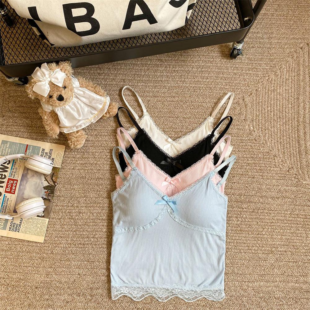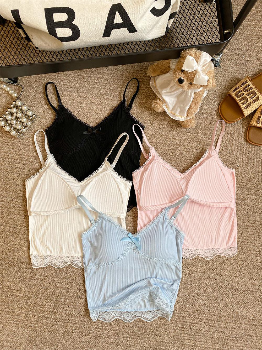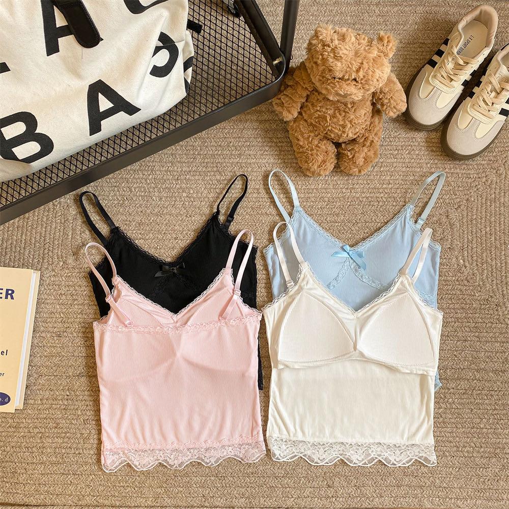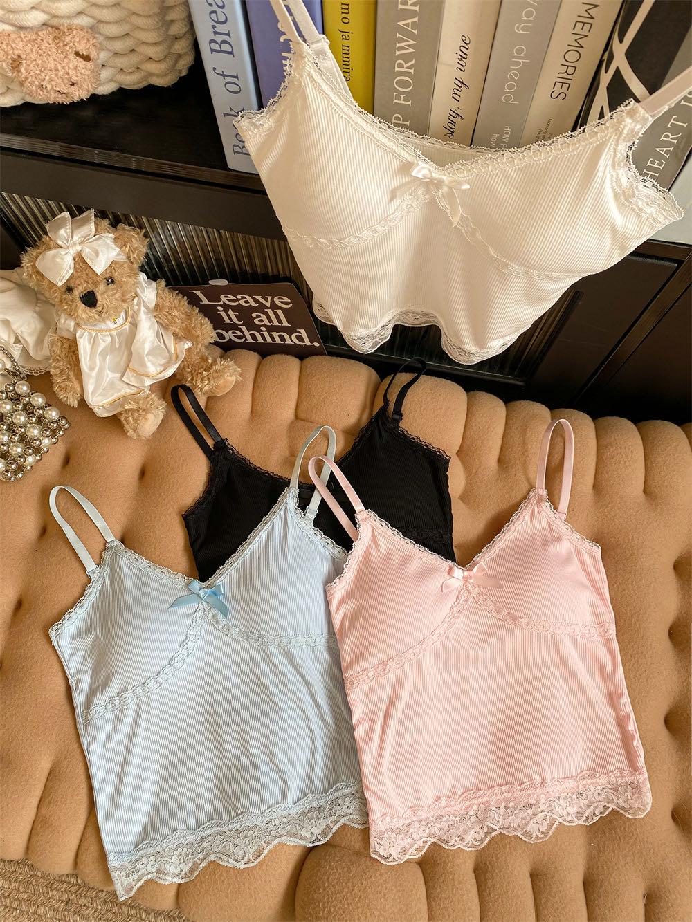 Compra Top Corto Puro de Verano para Combinar con Todo con Almohadilla en el Pecho Camiseta Interior Básica Camisola para Mujer con Costuras de Encaje de Lazo al por mayor en Joom.pro