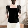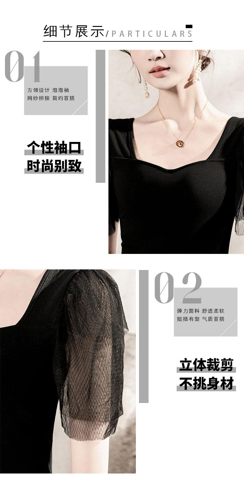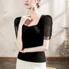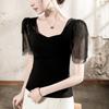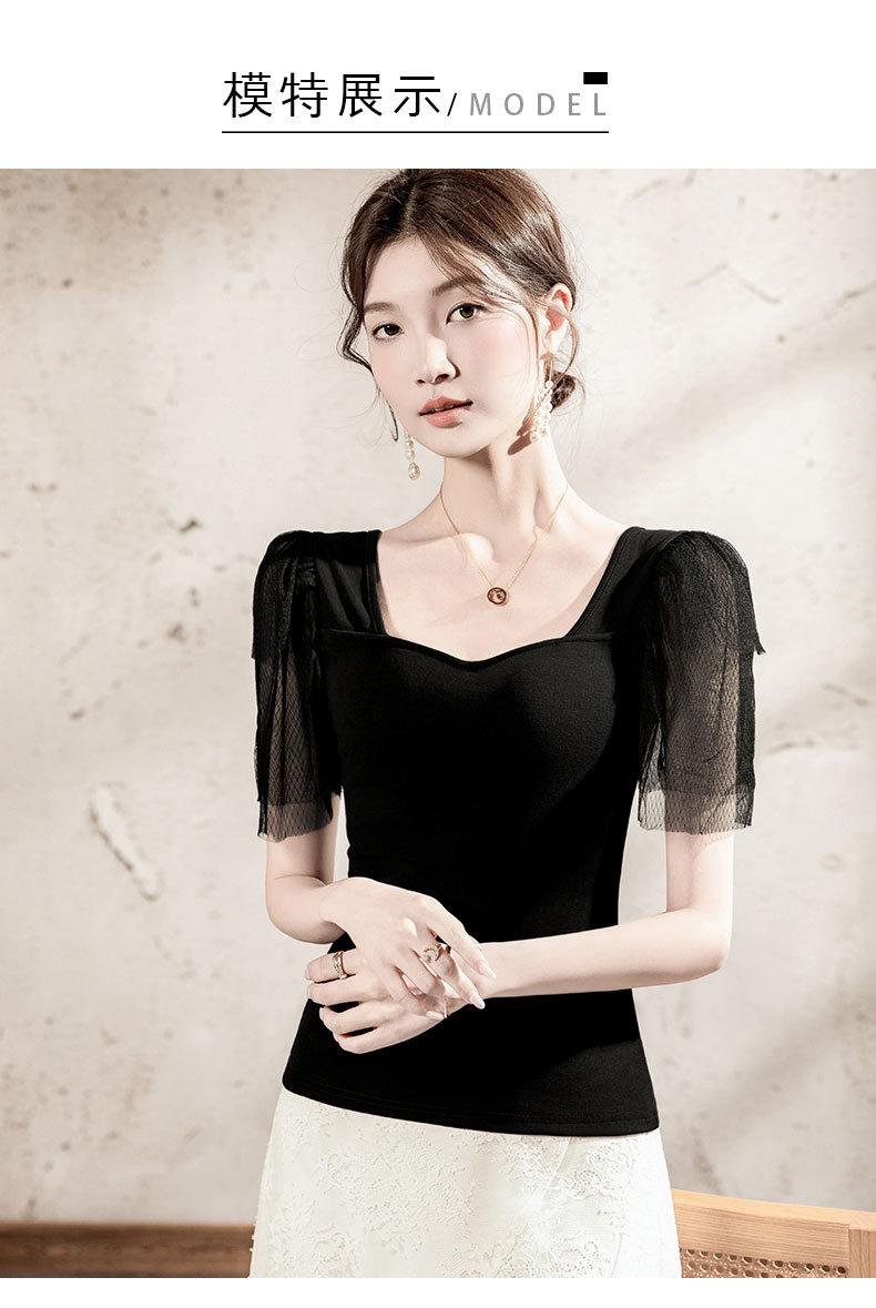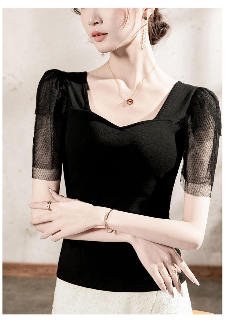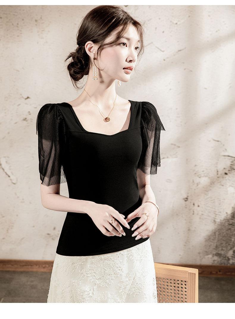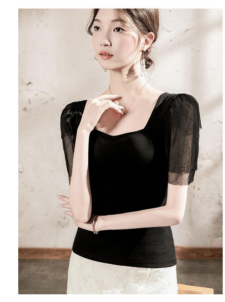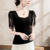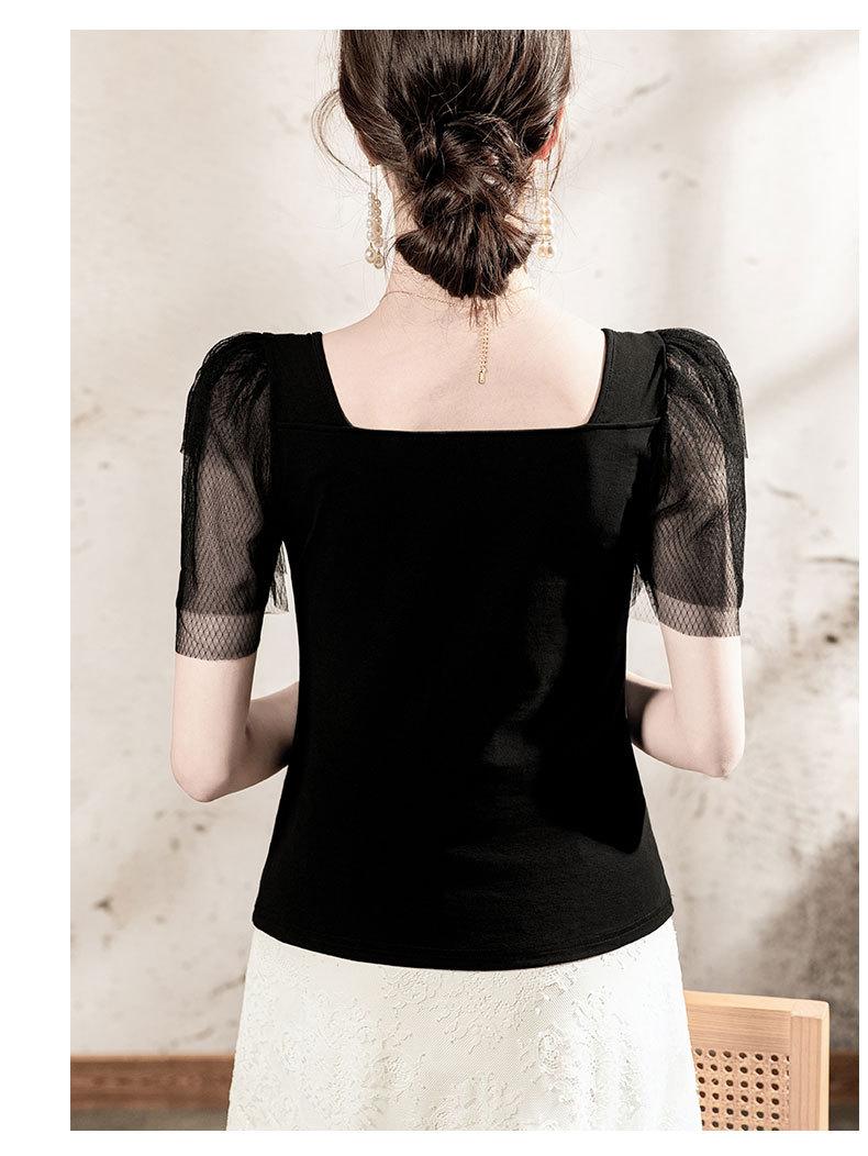 Compra Playera de algodón de cuello cuadrado para mujer, manga corta, costuras de malla, manga abullonada, verano 2025, nueva, para mujer, negra, manga media, top pequeño al por mayor en Joom.pro