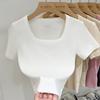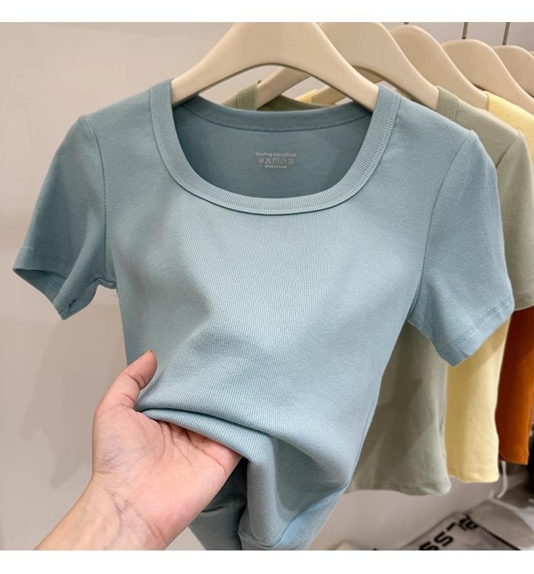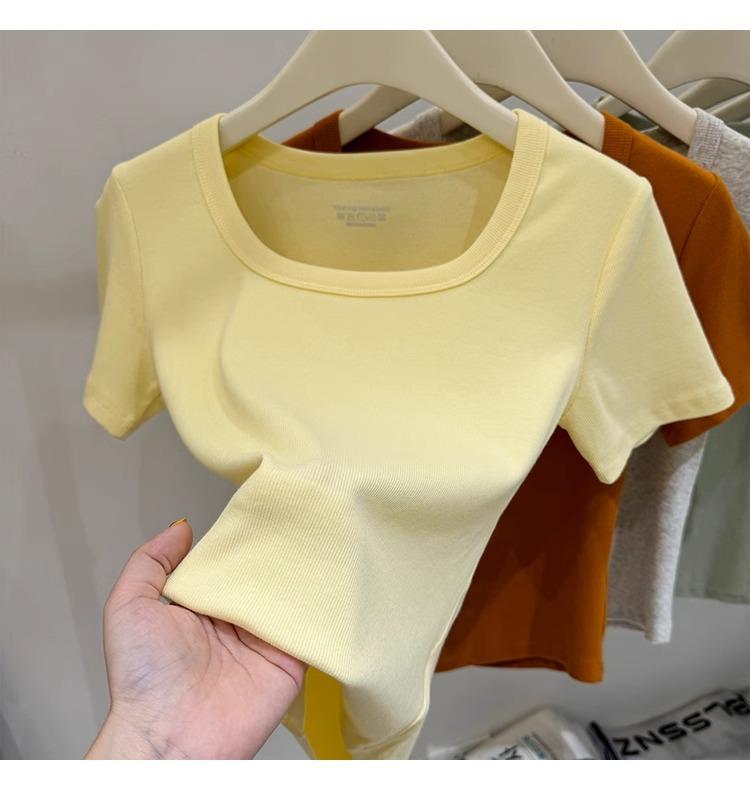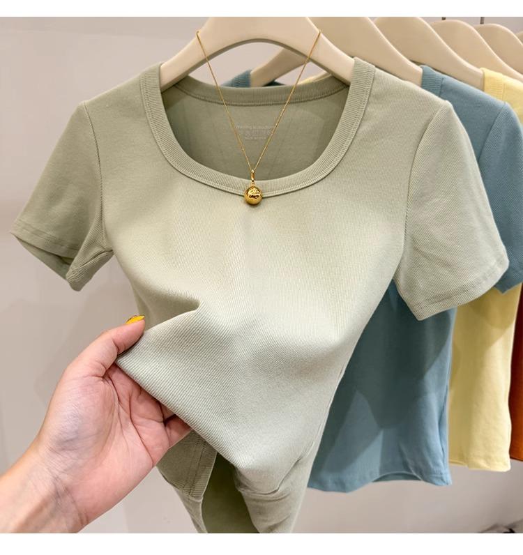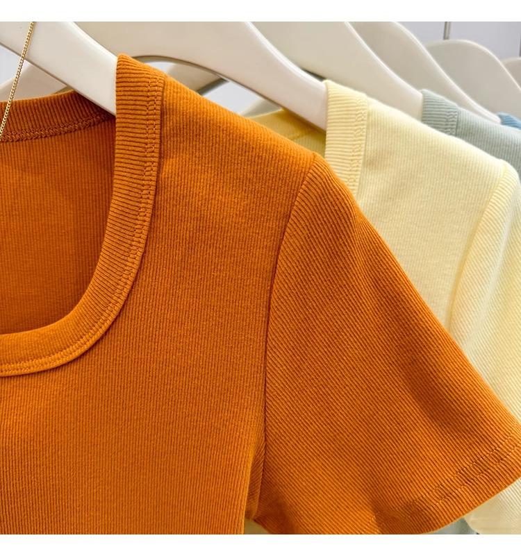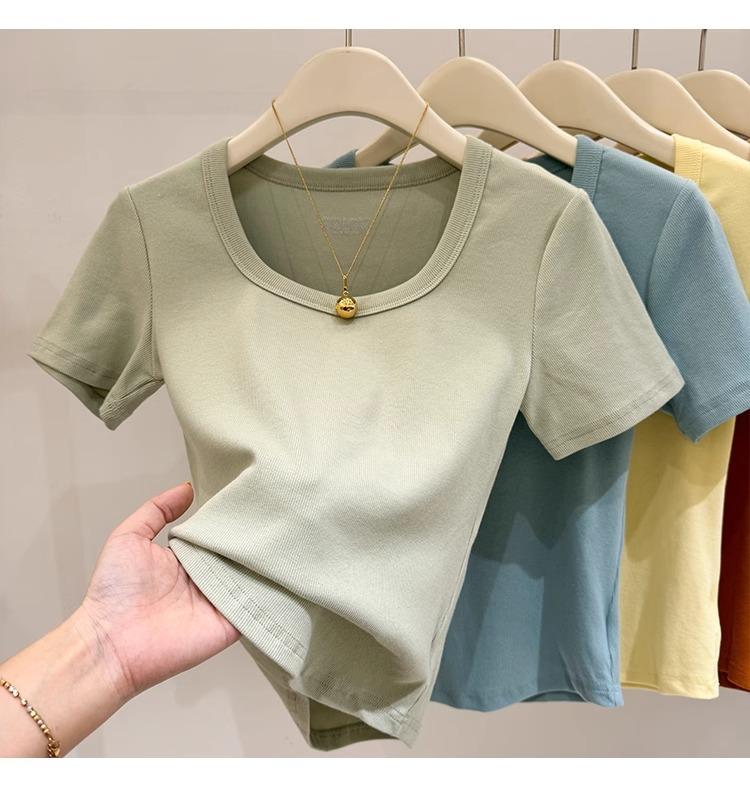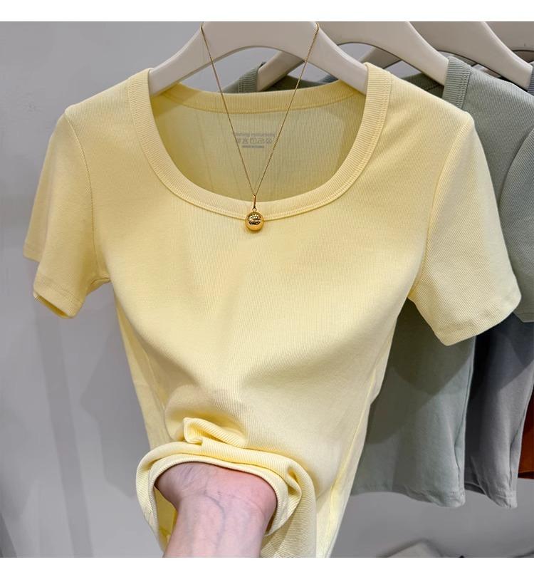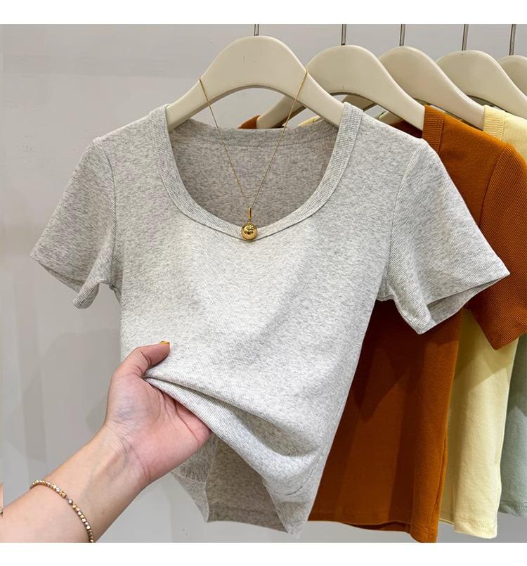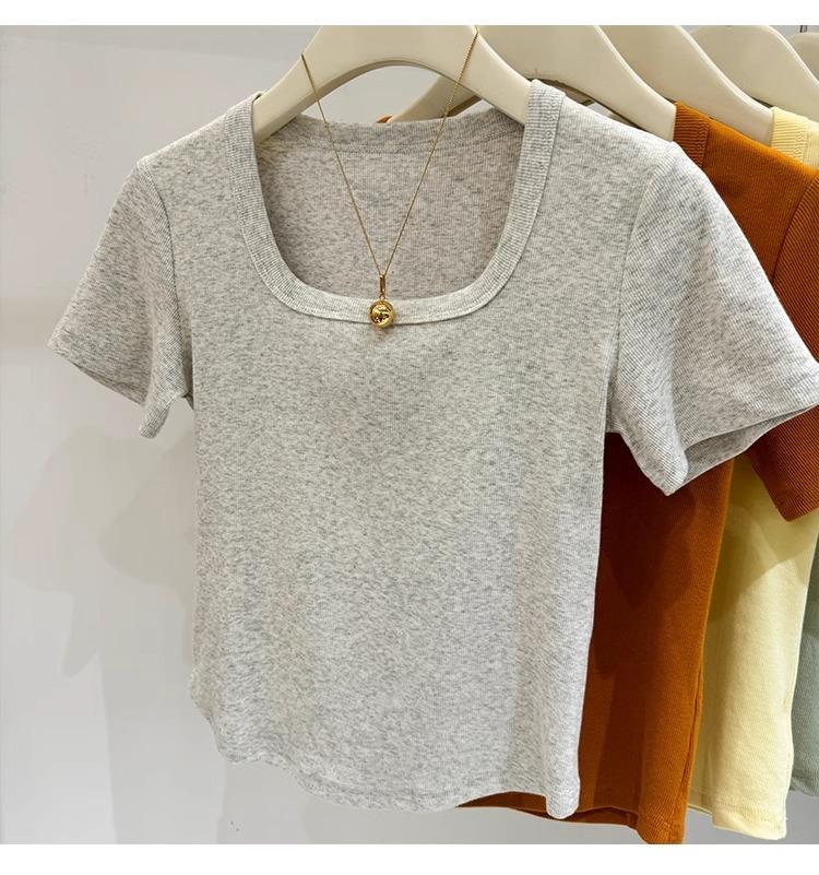 Playera Europea de Cuello Redondo Hombro Derecho para Mujer 2025 Nueva Ajustada Top Corto Manga Corta Manga Corta Trendy A3417