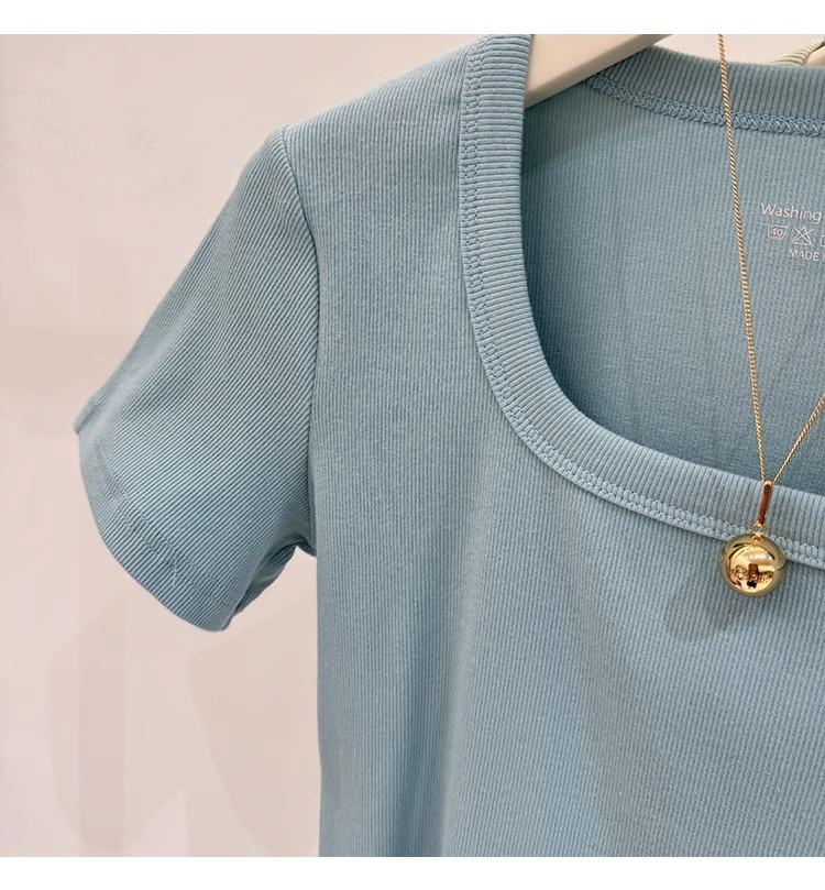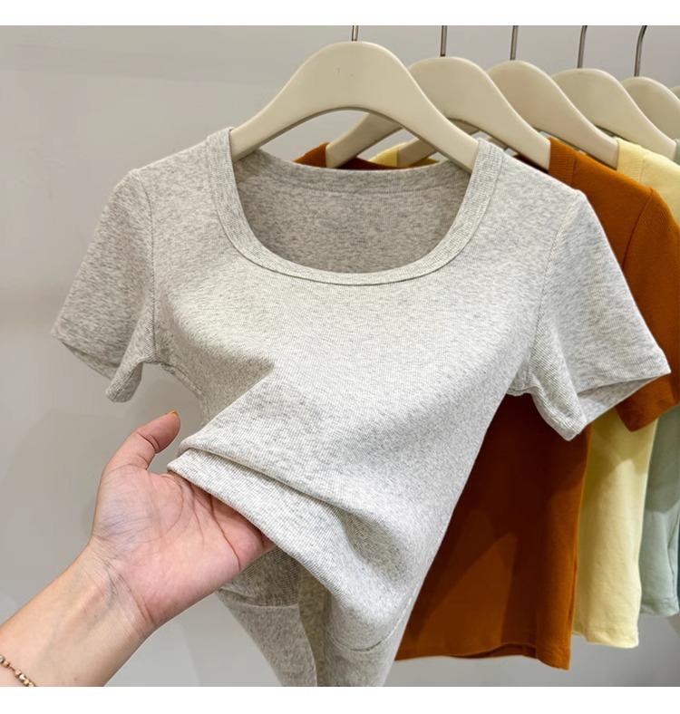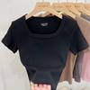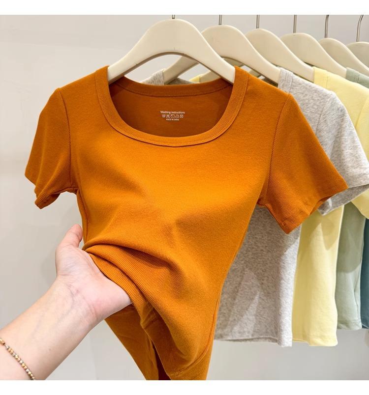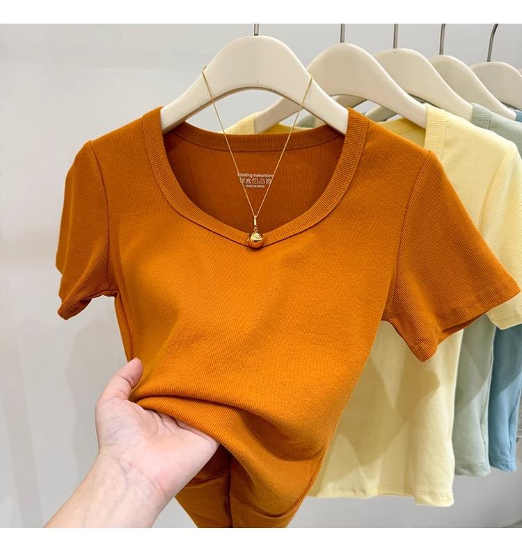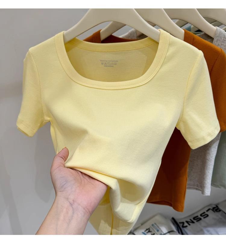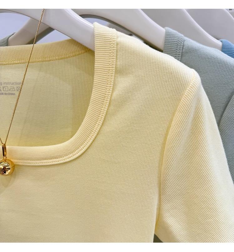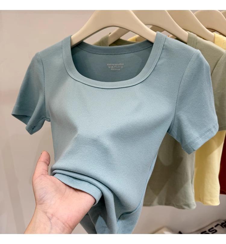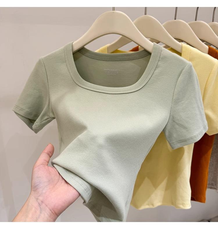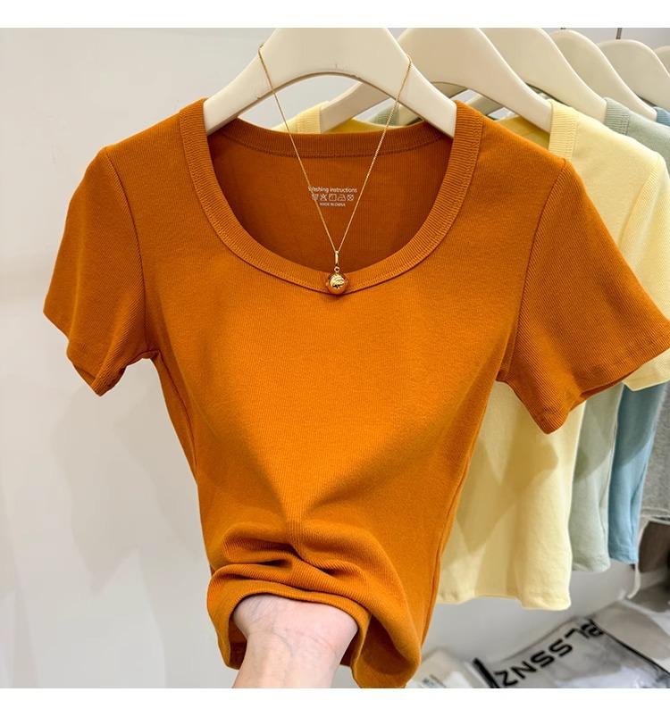Playera Europea de Cuello Redondo Hombro Derecho para Mujer 2025 Nueva Ajustada Top Corto Manga Corta Manga Corta Trendy A3417