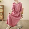 2025 Primavera y Verano Nuevo Lino Estampado Artístico Cuello de Camisa Temperamento Vestido Midi