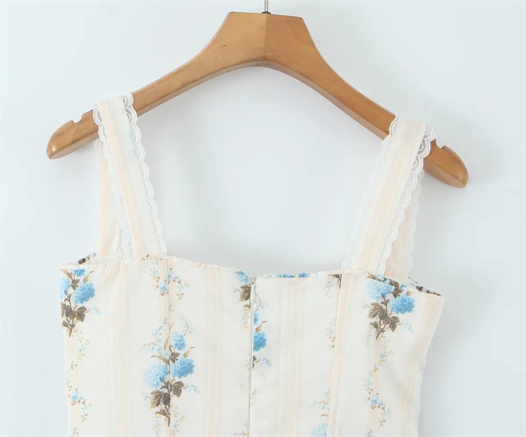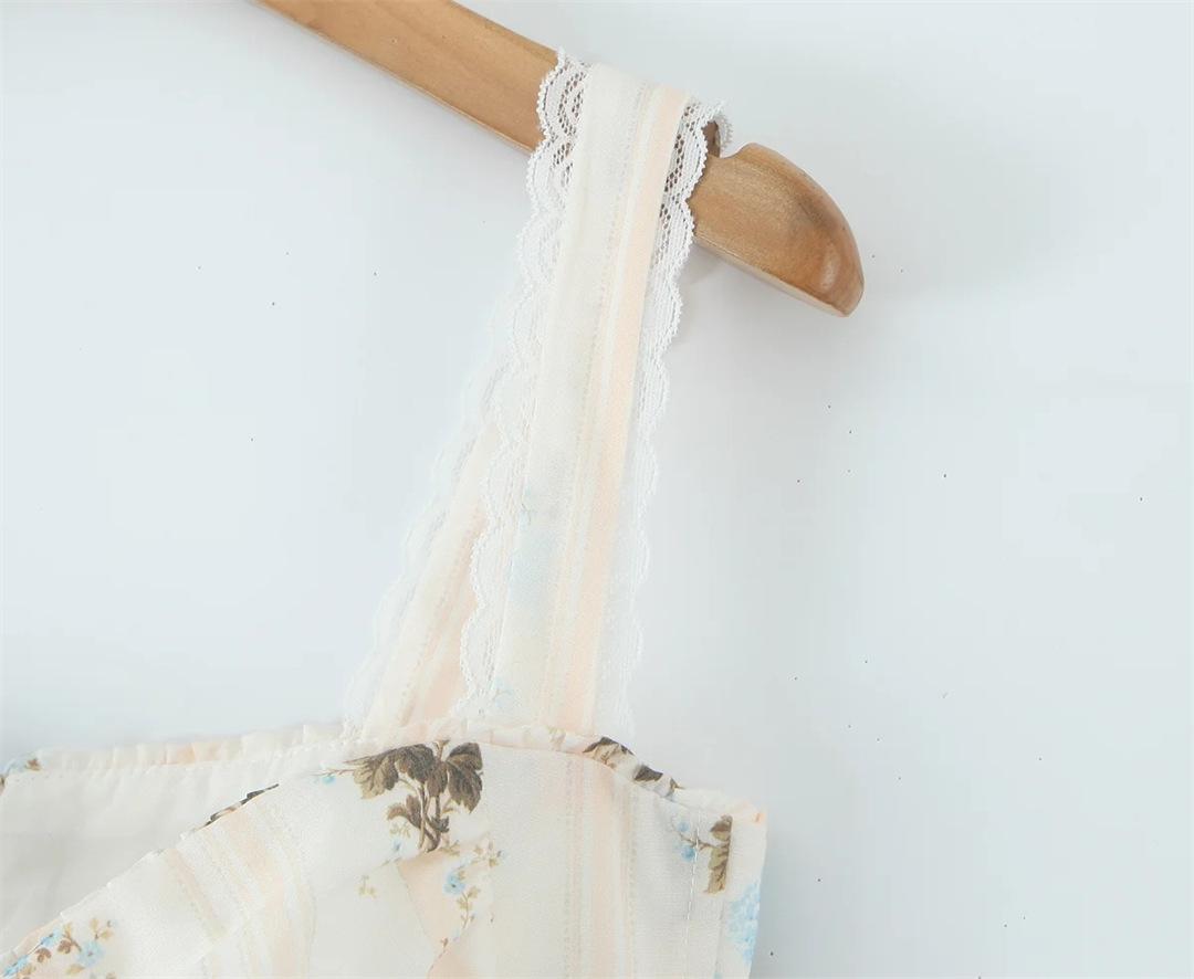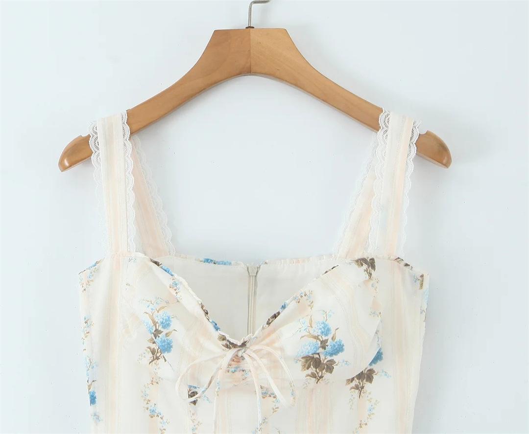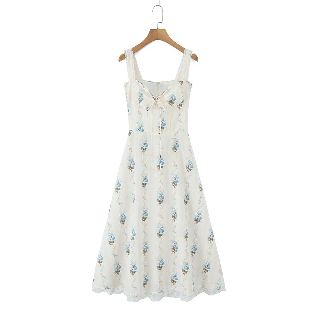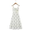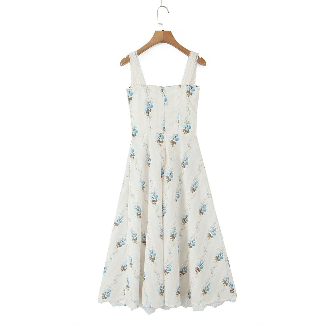 Compra Vestido de Cuello en V sin Tirantes con Espagueti, Cintura Estampada y Ribete de Encaje, Vestido Acampanado de Largo Medio al por mayor en Joom.pro