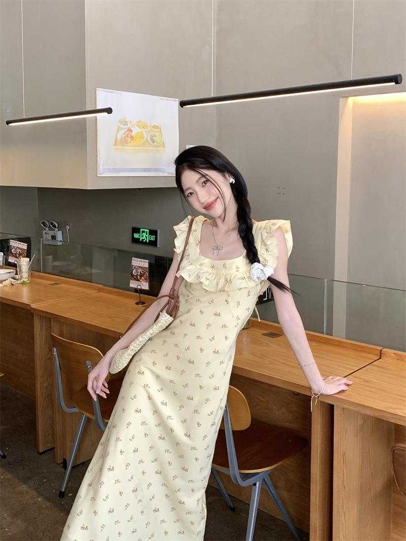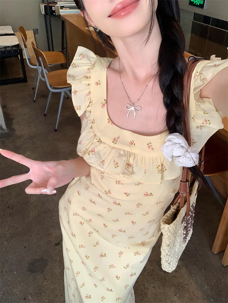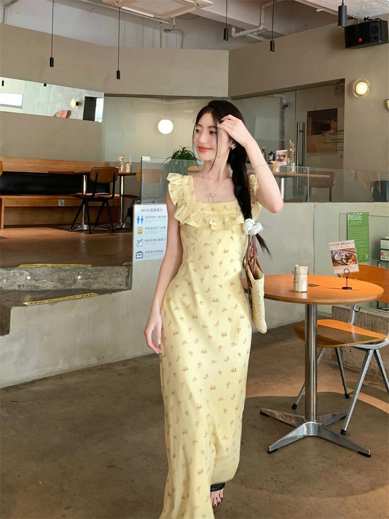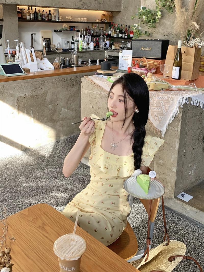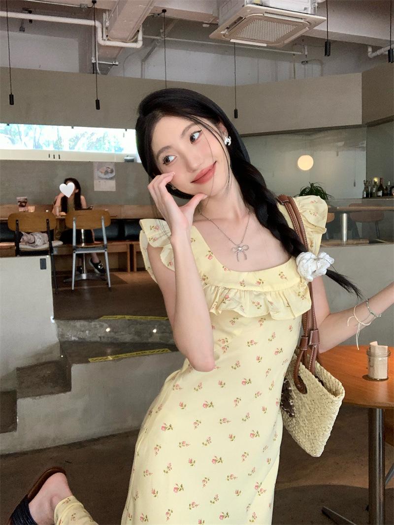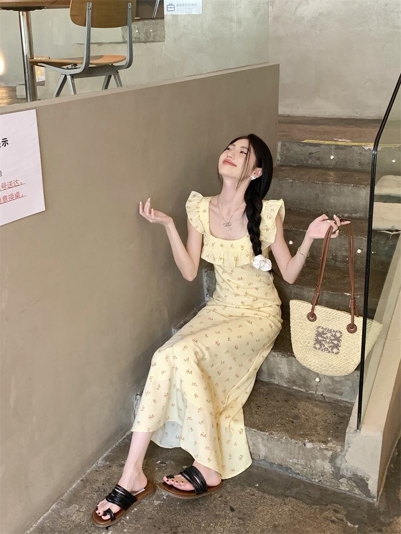 Compra Foto Real 2025 Verano Nuevo Elegante Francés Ajustado Adelgazante Floral Cintura Cuello Cuadrado Vestido Vestido de Vacaciones al por mayor en Joom.pro