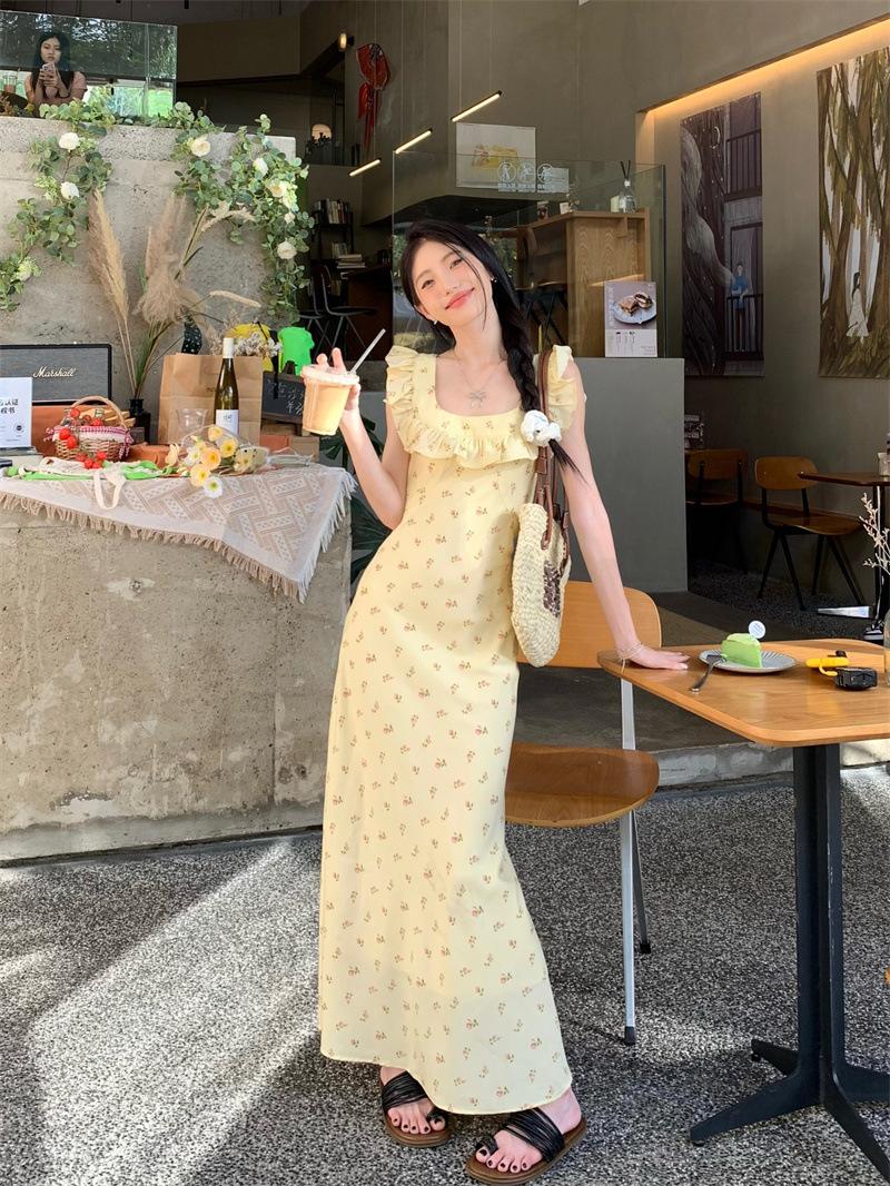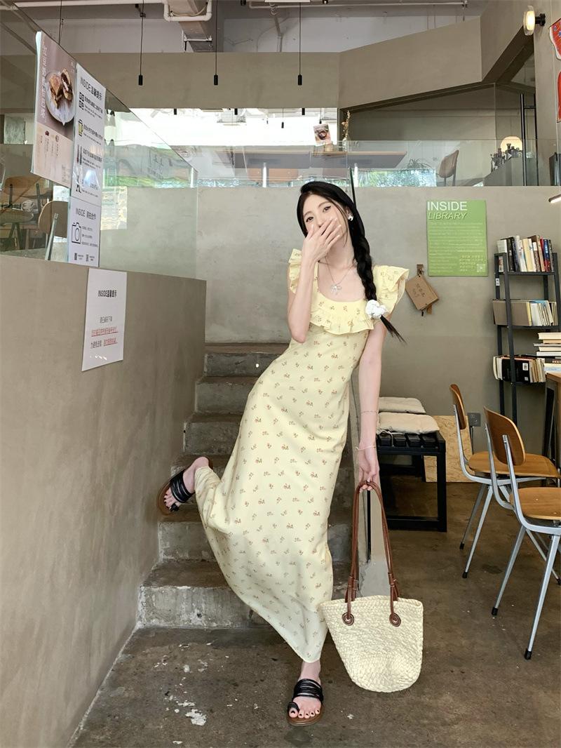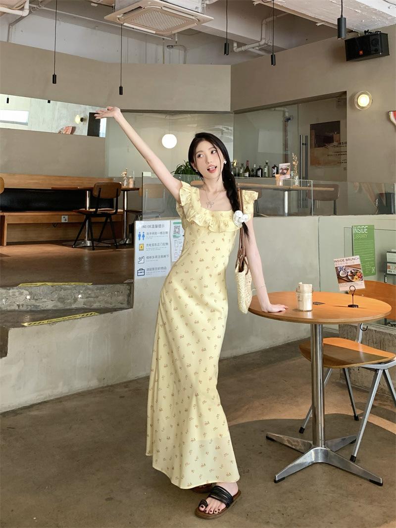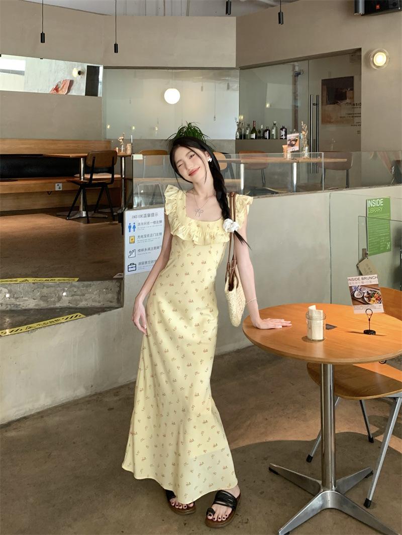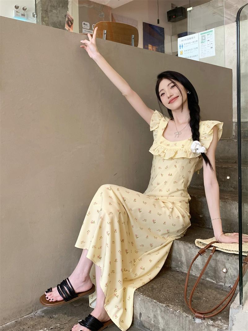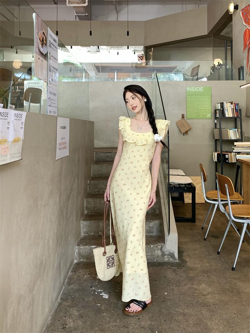 Compra Foto Real 2025 Verano Nuevo Elegante Francés Ajustado Adelgazante Floral Cintura Cuello Cuadrado Vestido Vestido de Vacaciones al por mayor en Joom.pro