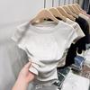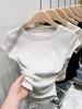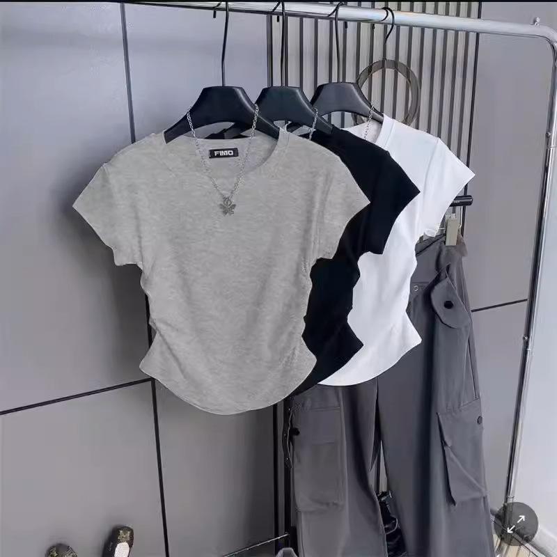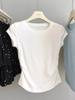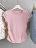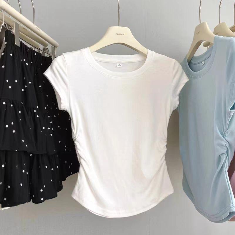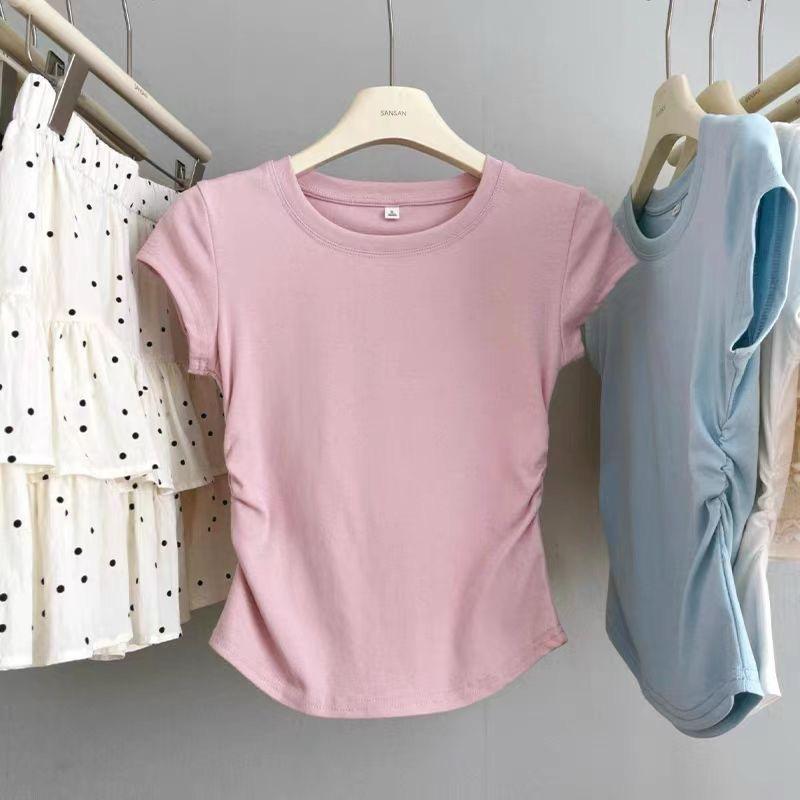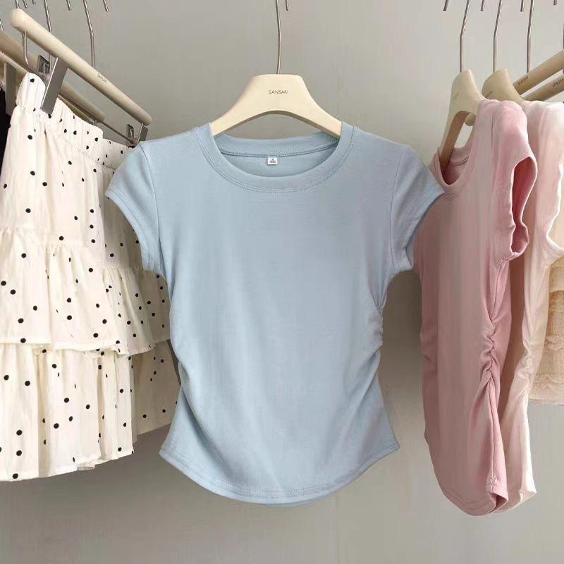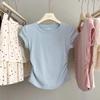 Compra Camiseta Azul Bebé de Hombro Manga Corta para Mujer Verano 2024 Nueva Color Sólido Ajuste Slim Entallado Cintura Plisada Top Corto al por mayor en Joom.pro