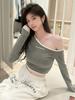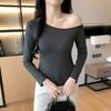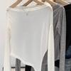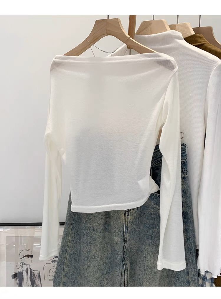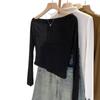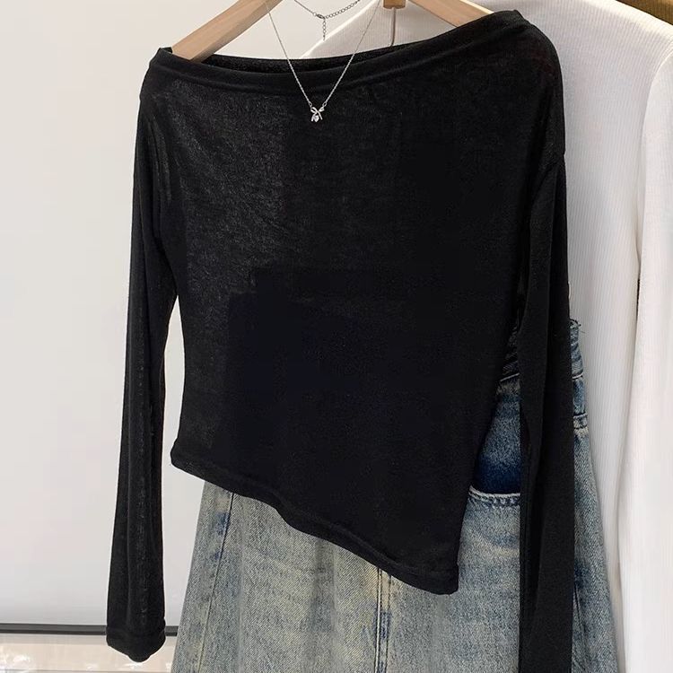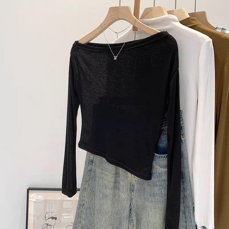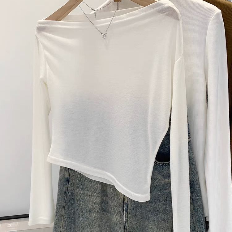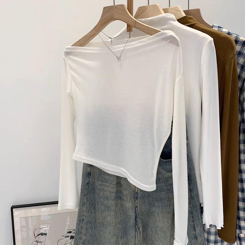 2025 Blusa Holgada de Hombro Inclinado Blanco Fino para Mujer Verano de Alta Gama Hombro Puro Camiseta de Manga Larga Top con Hombros Descubiertos
