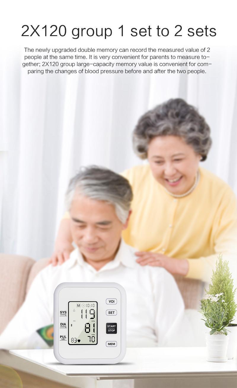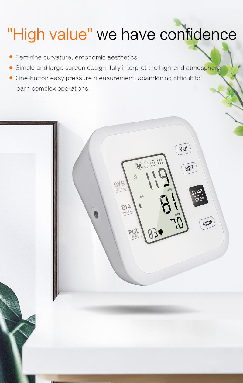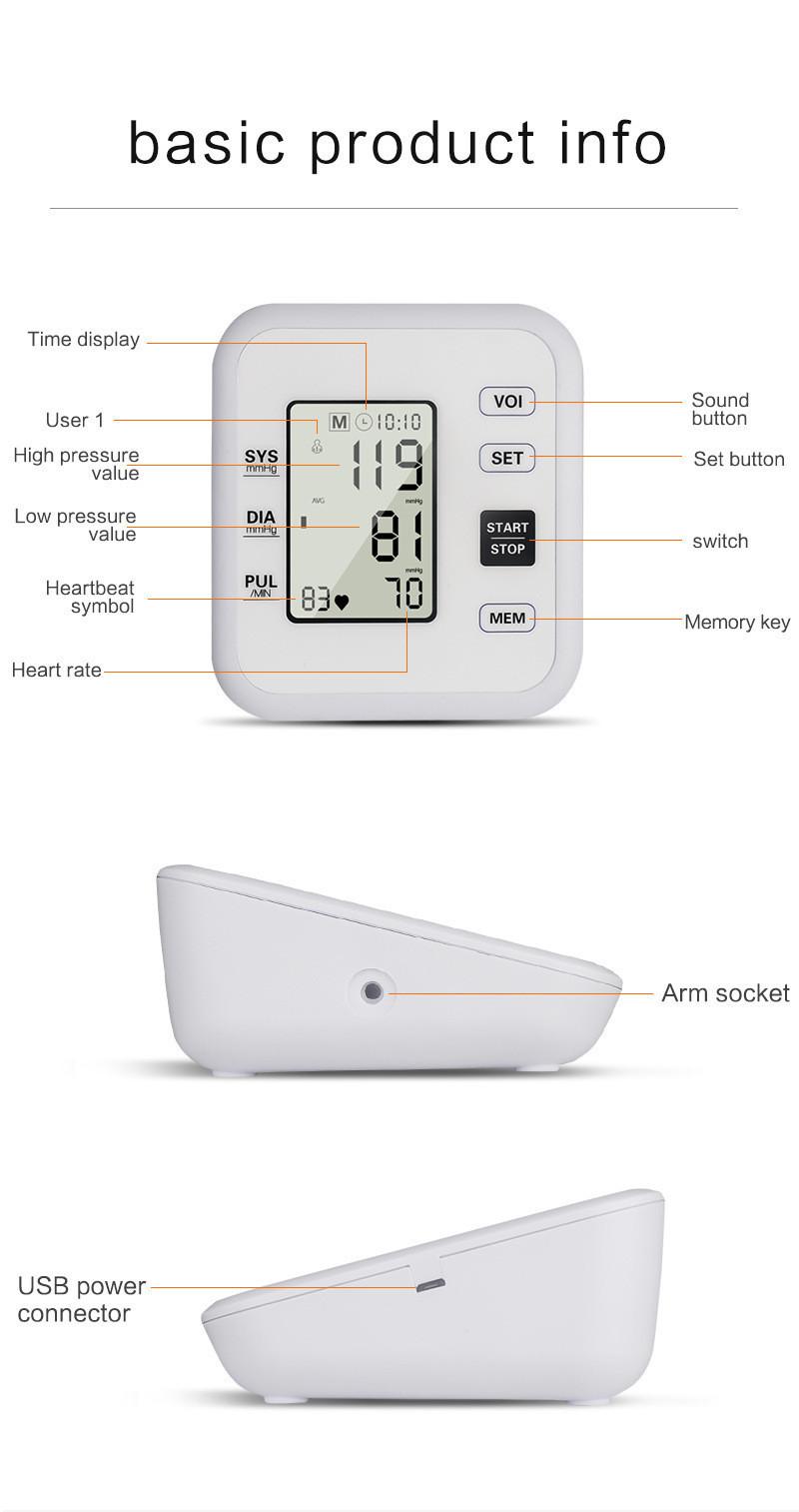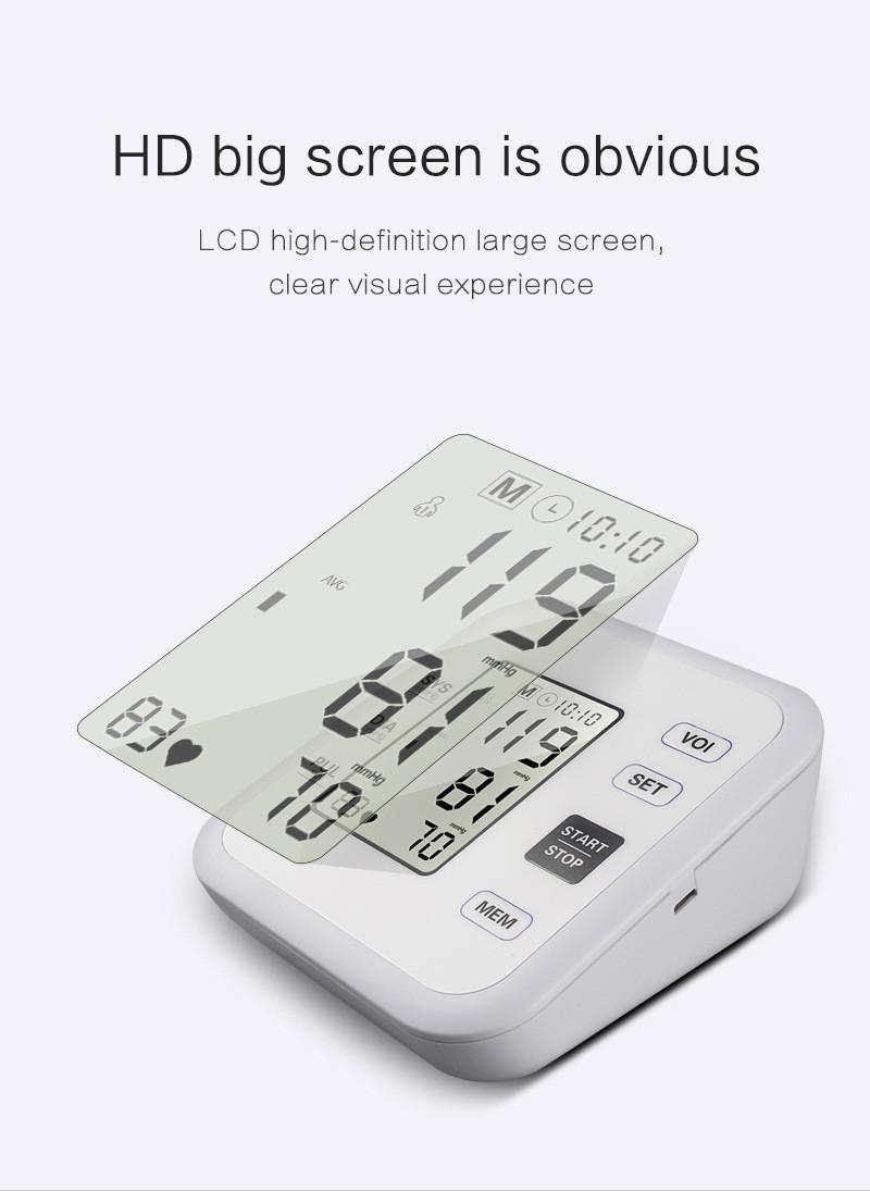 1)Pantalla digital LCD, el resultado muestra alta presión/baja presión/pulso, pantalla grande y caracteres grandes, la lectura es clara. 2)La clasificación del esfigmomanómetro de la OMS indica el estado de salud de la presión arterial, lo que permite a los usuarios determinar con precisión si la presión arterial es normal. 3)Presurización y descompresión inteligente totalmente automática, detección de arritmia IHB 4)Configuración de año, mes, día, hora y minutos 5)Memoria de resultados de medición de 99 grupos para dos personas, que puede mostrar la lectura promedio de los últimos tres resultados de medición, lo que hace que sea conveniente para los usuarios recuperar datos para comparar. 6)Apagado manual o apagado automático después de 1 minuto sin operación, operación simple y conveniente 7)Conversión de unidades de valor de presión arterial entre unidades de visualización Kpa y mmHg (la unidad predeterminada al inicio es mmHg) 8)Función de protección contra sobrepresión,Cuando la presión del aire supera los 295 mmHg-20 ms, se agotará de forma automática y rápida, de forma segura y confiable. 9) Función de aviso de error, que facilita a los usuarios encontrar la causa del error 10)Función de detección de batería baja,Detecta batería baja en cualquier condición de trabajo, la pantalla LCD indicará batería baja 11)Circunferencia de brazo medible: aproximadamente 22~32cm 12) Tamaño de la pantalla LCD:41*61mm |