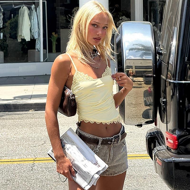Amazon Ropa de Mujer 2025 Verano Nueva Moda Sexy Cuello en V Encaje Camisola Tops Mujer Venta al por Mayor