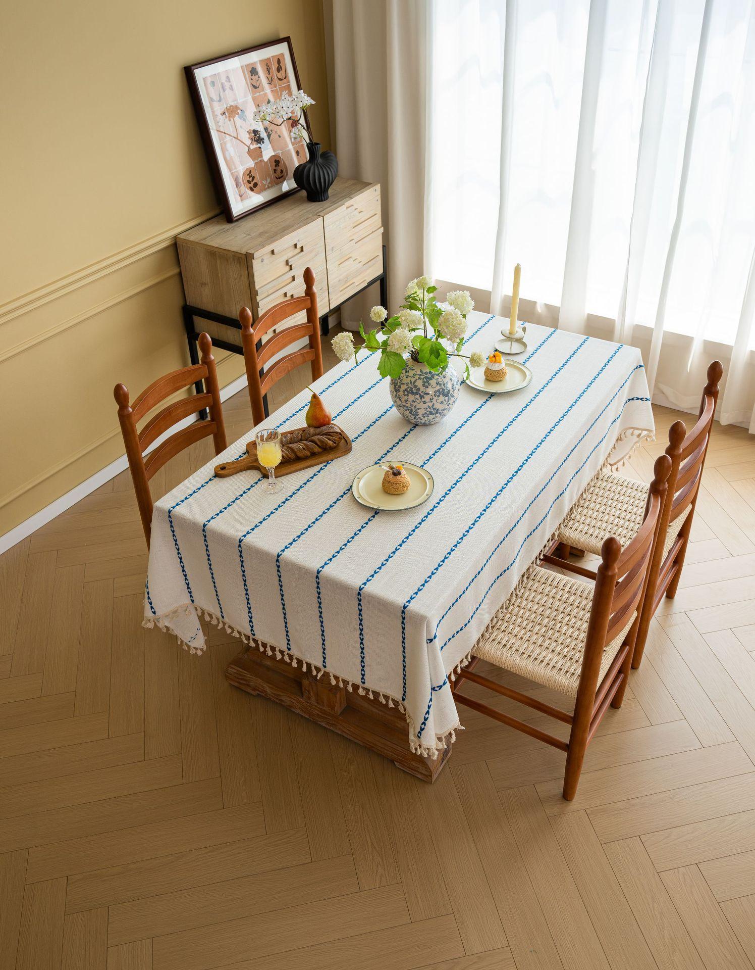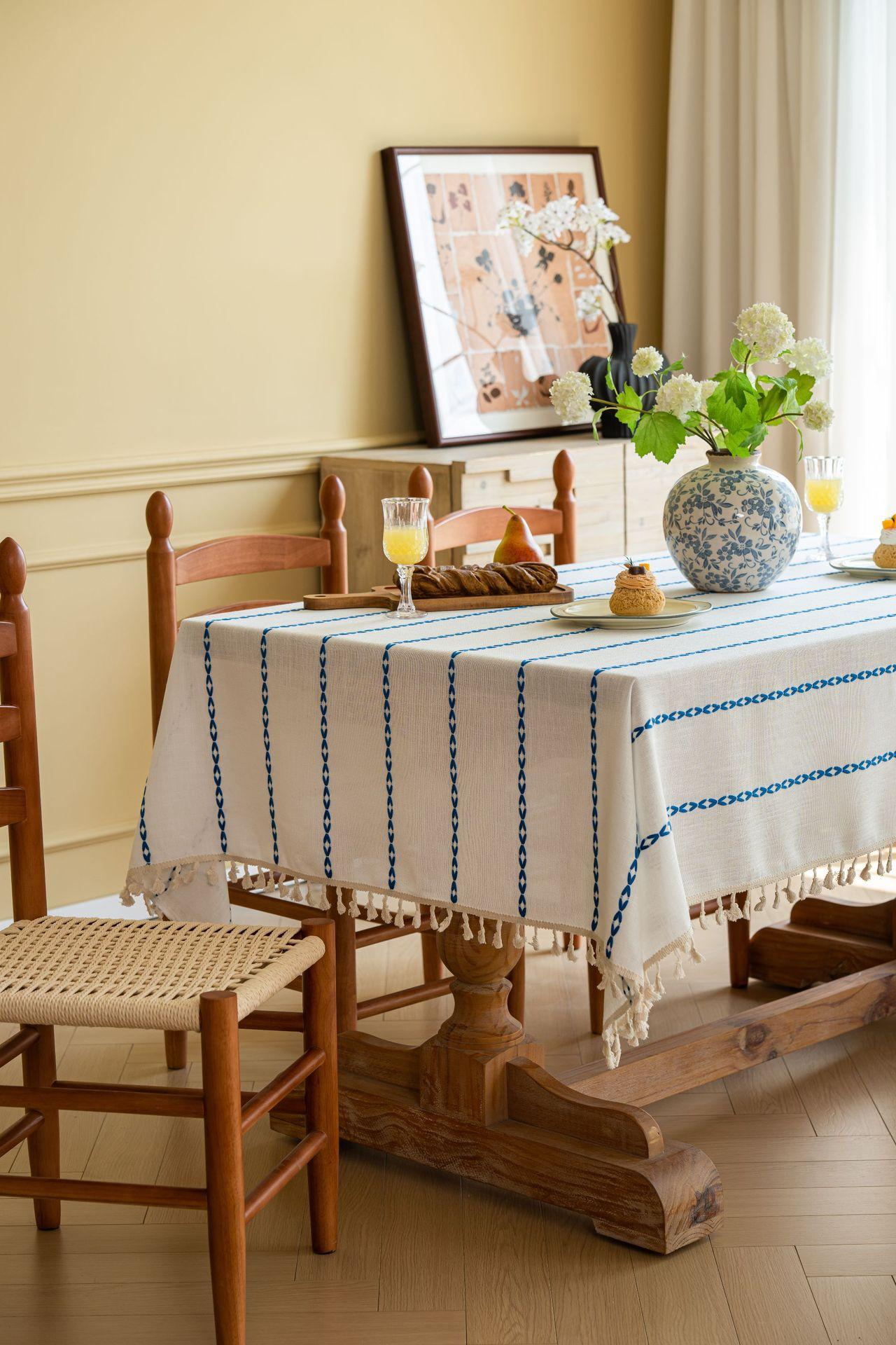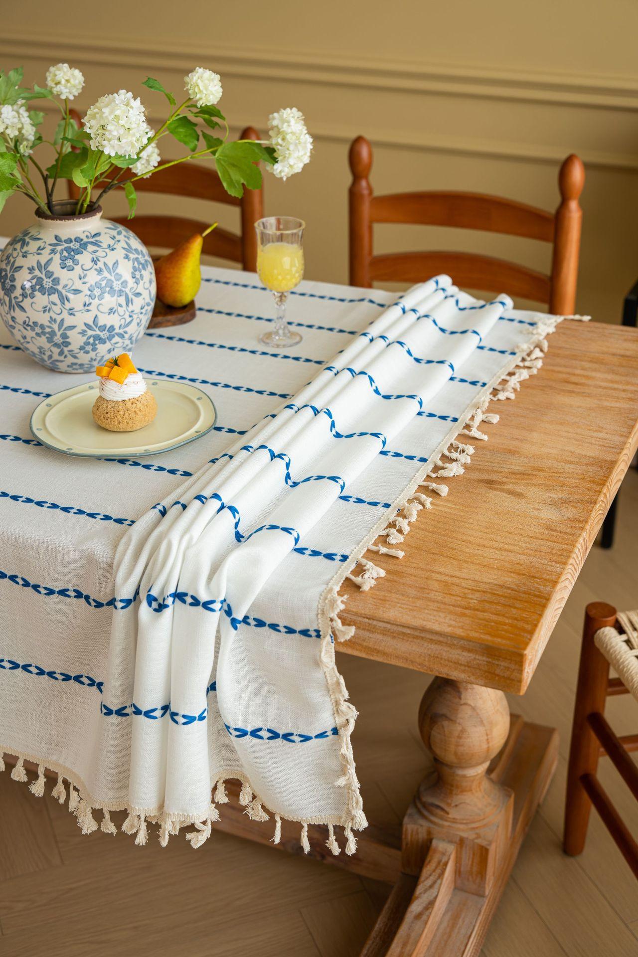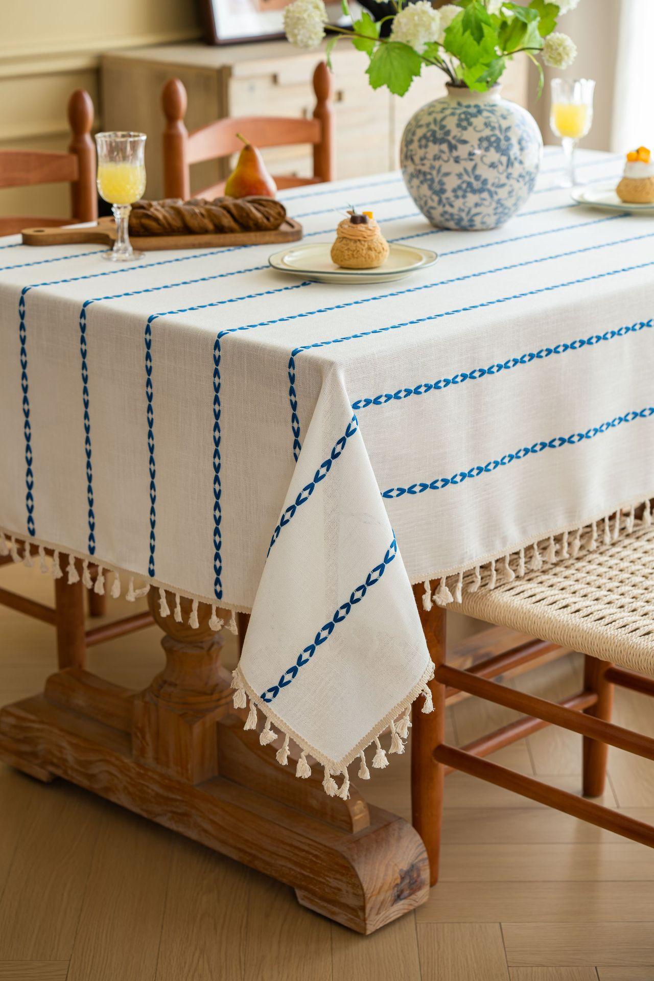 Imanki Rima Mantel Rectangular para Mesa de Comedor Estilo Ins Blanco Fondo Línea Azul Bordado Artístico Cubre Mantel Decoración