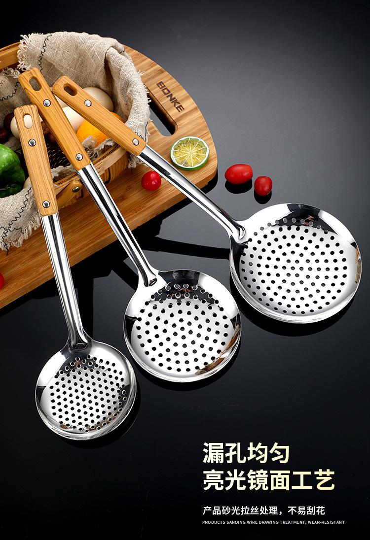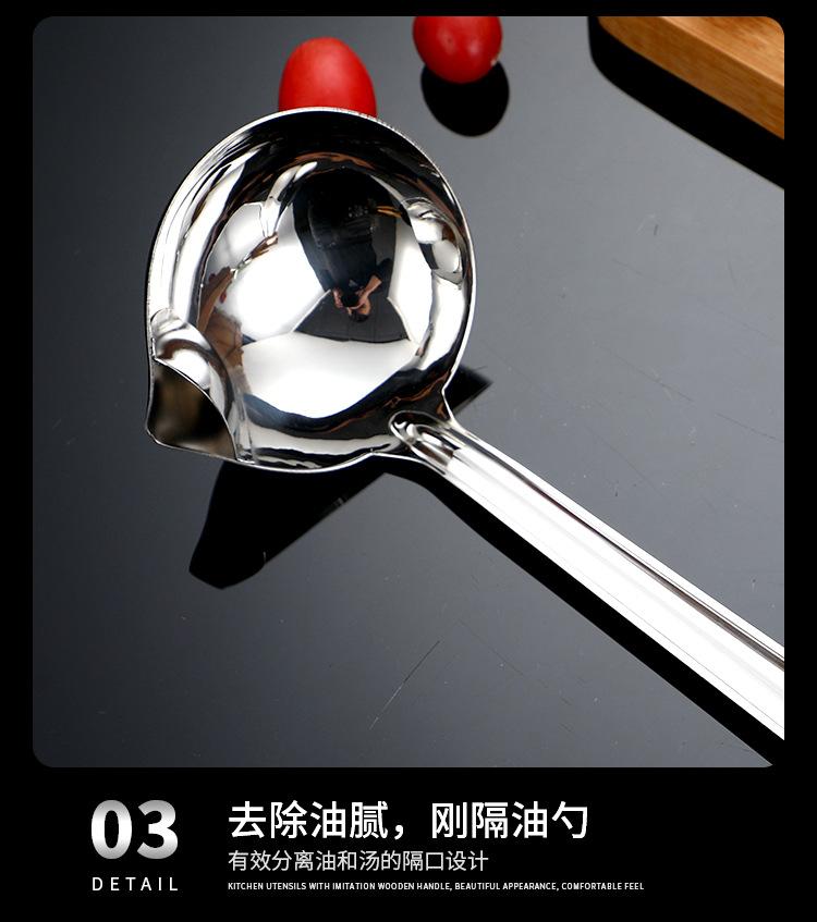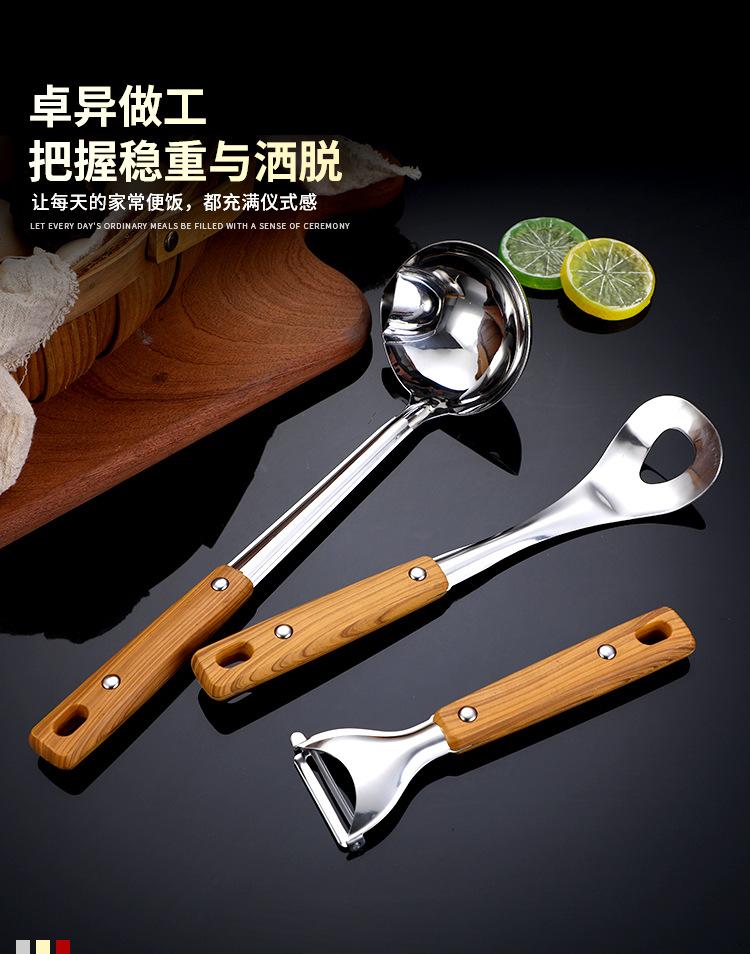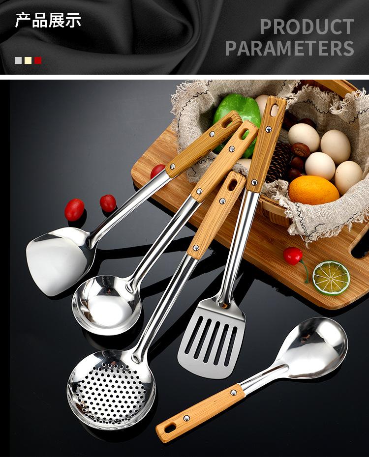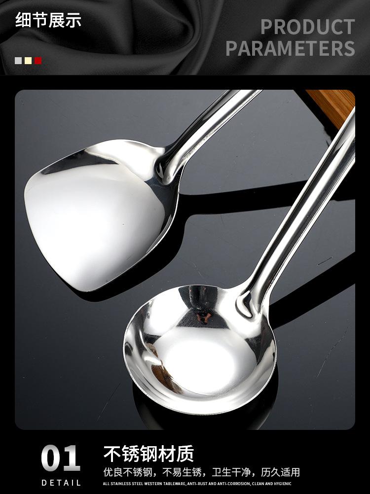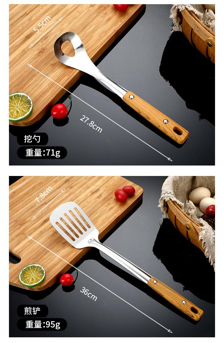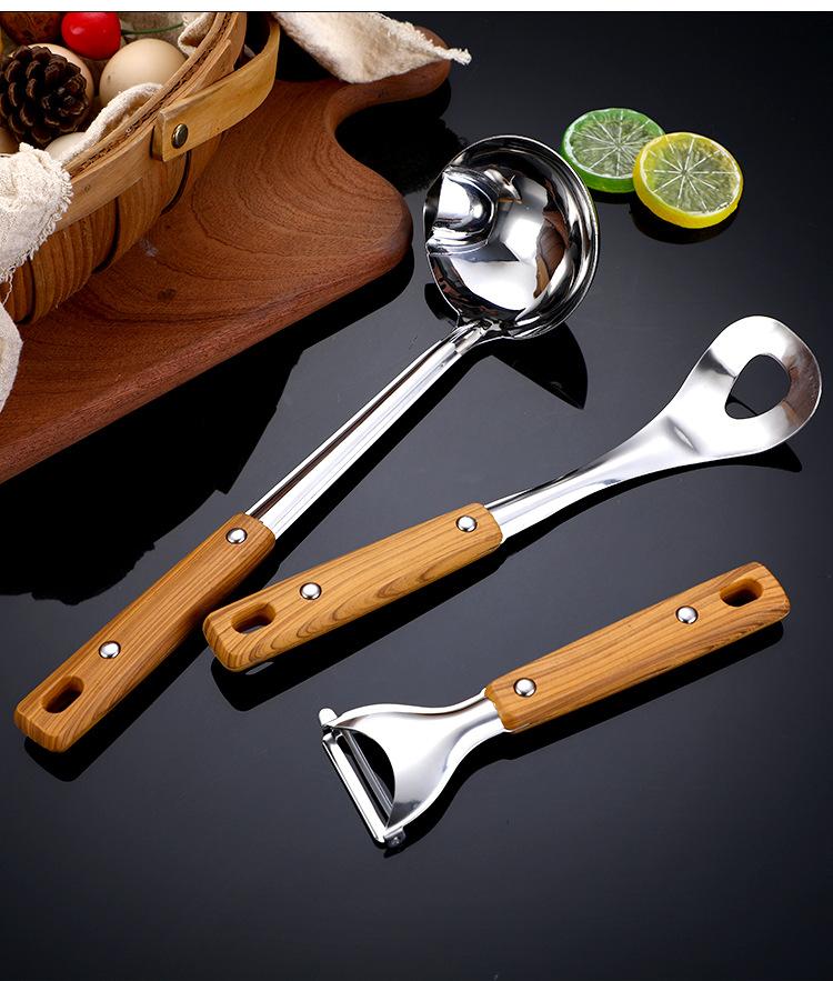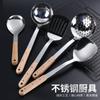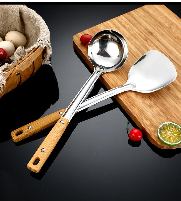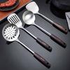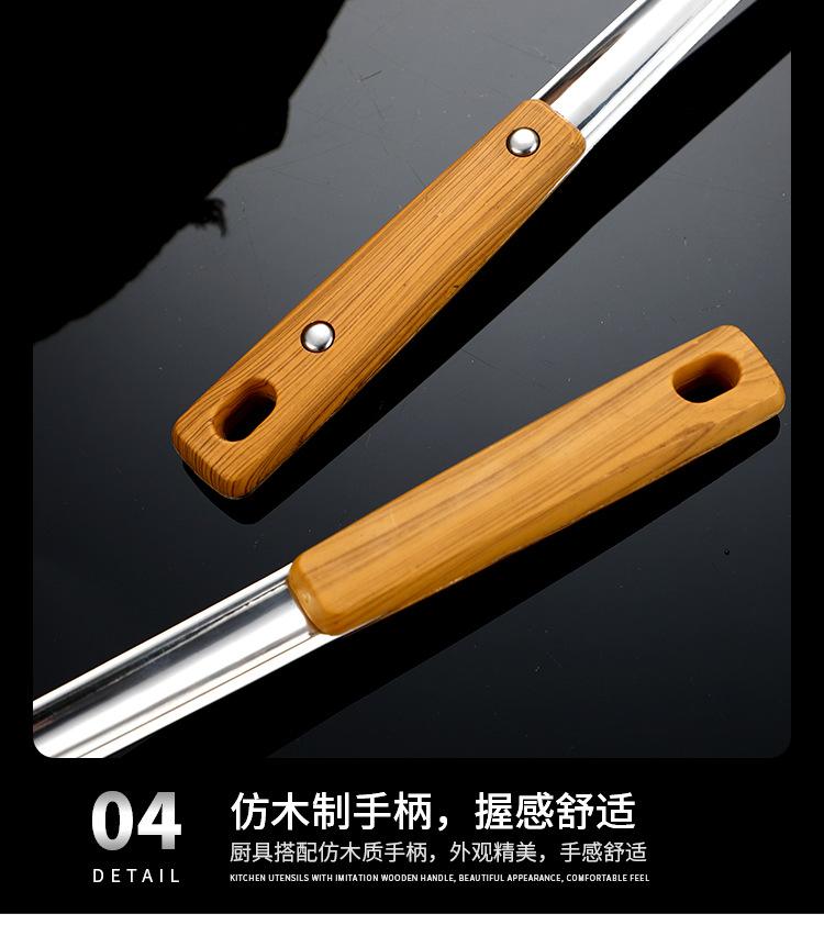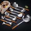 Utensilios de cocina de acero inoxidable espátula colador cuchara para sopa pala para freír cuchara para cocinar doméstica pala mango de madera de imitación juego de utensilios de cocina al por mayor