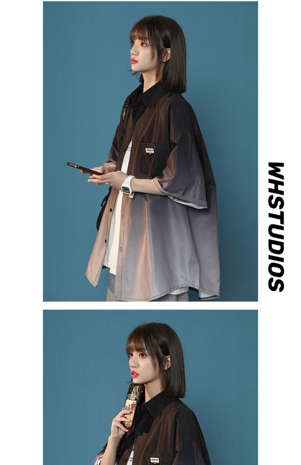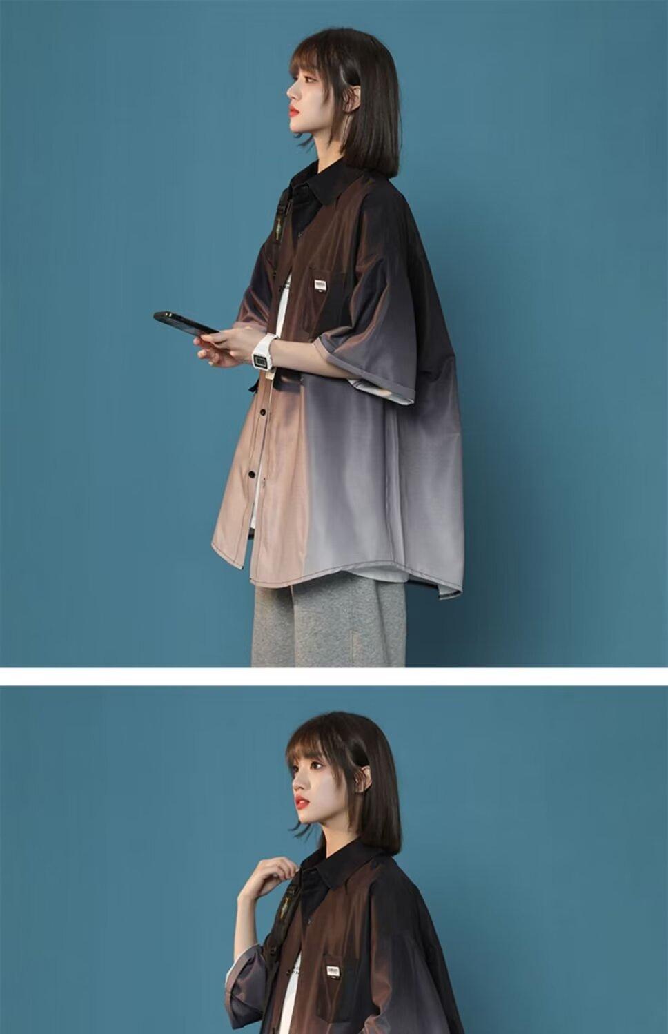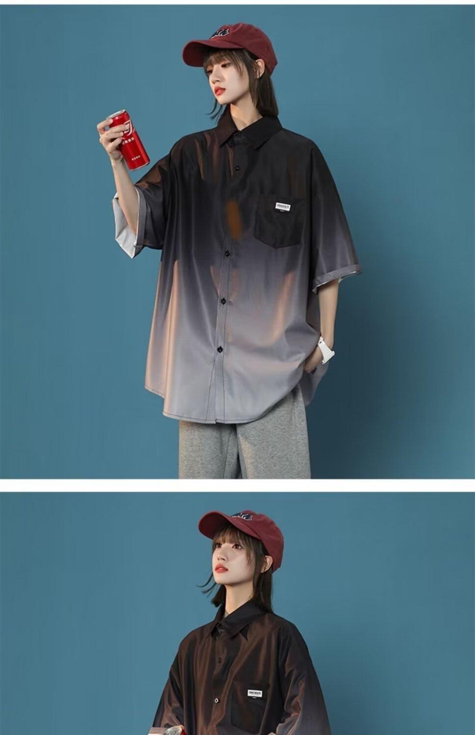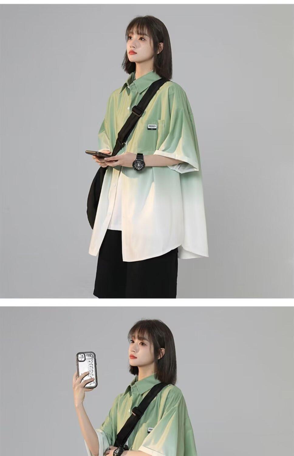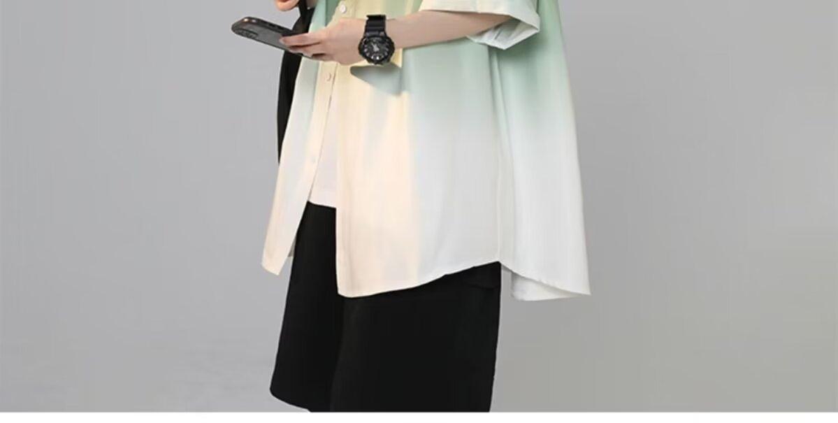 Camisa de Manga Corta con Color Degradado Abrigo para Mujer Seda de Hielo Fresco Dulce Solapa Cárdigan Transpirable Media Manga Camisa de Media Manga
