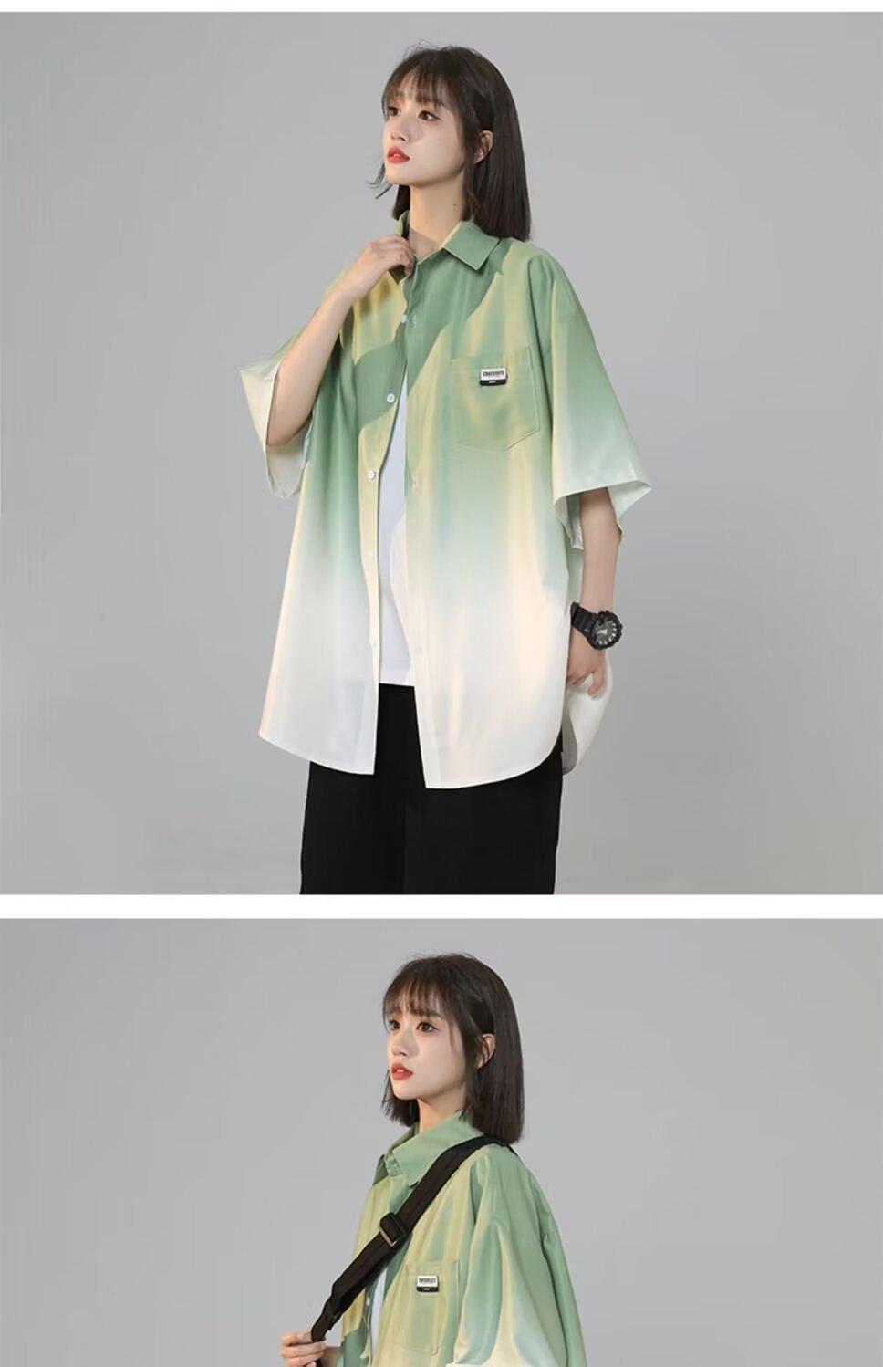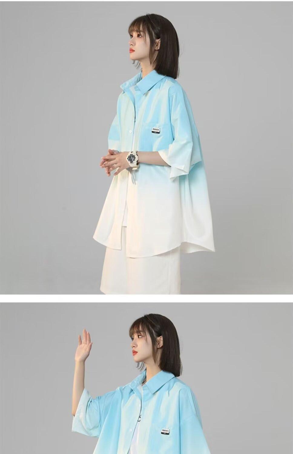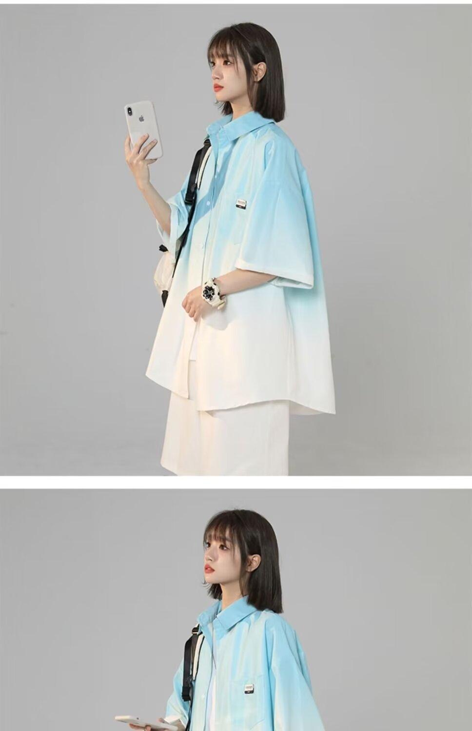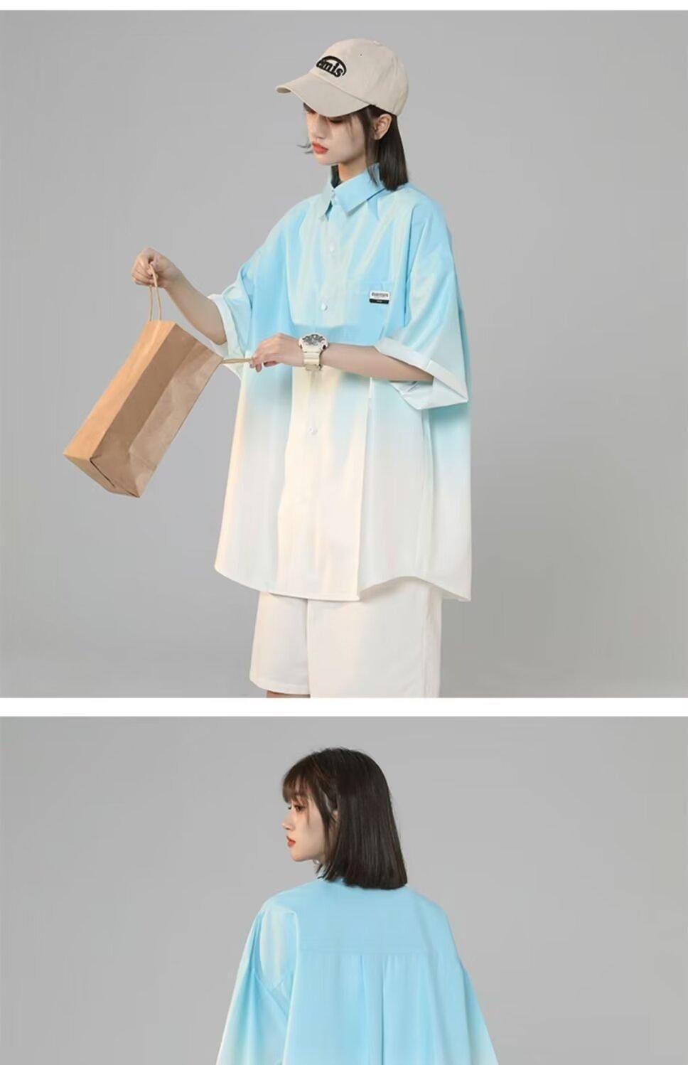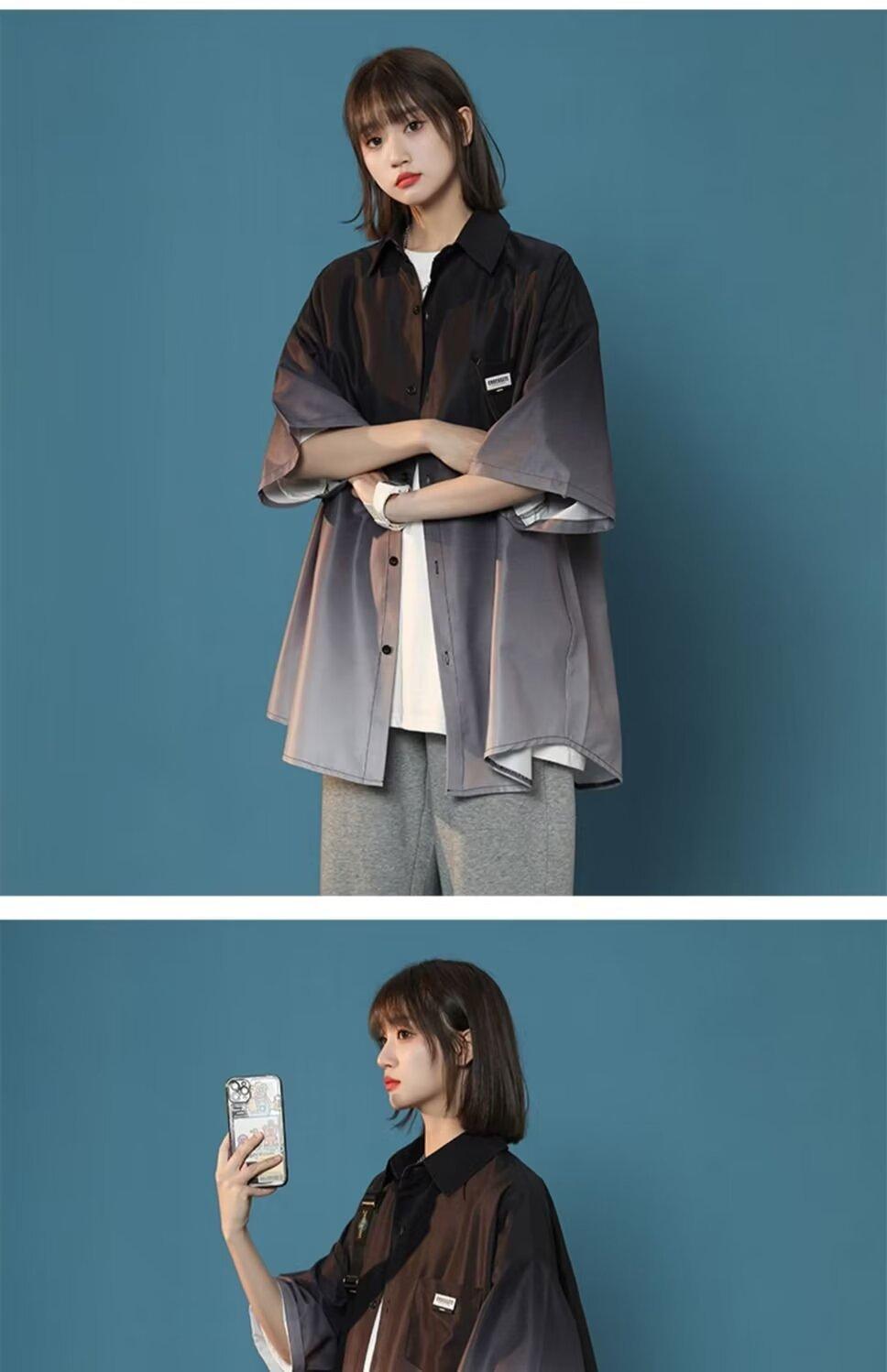 Camisa de Manga Corta con Color Degradado Abrigo para Mujer Seda de Hielo Fresco Dulce Solapa Cárdigan Transpirable Media Manga Camisa de Media Manga