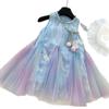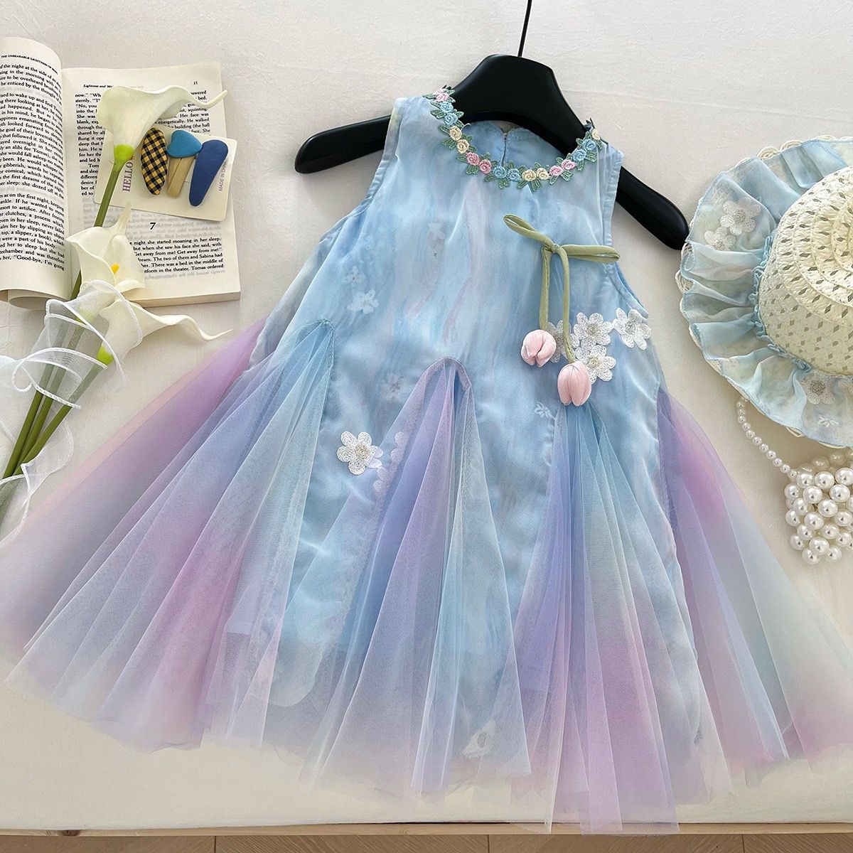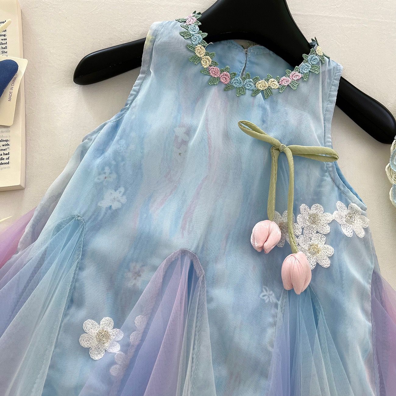 Vestido de Verano para Niñas 2025 Nuevo Vestido de Princesa de Malla con Flores Vestido Chaleco Estilo Vacacional de Encaje para Bebé