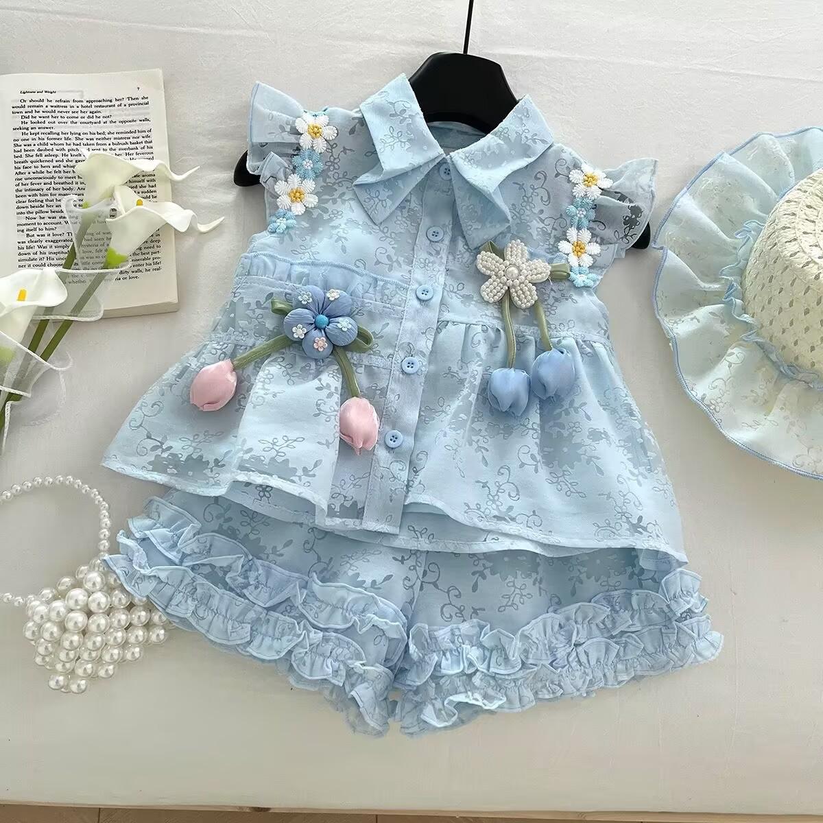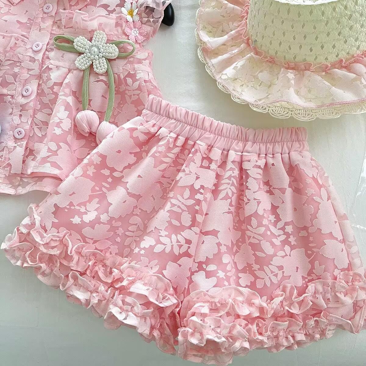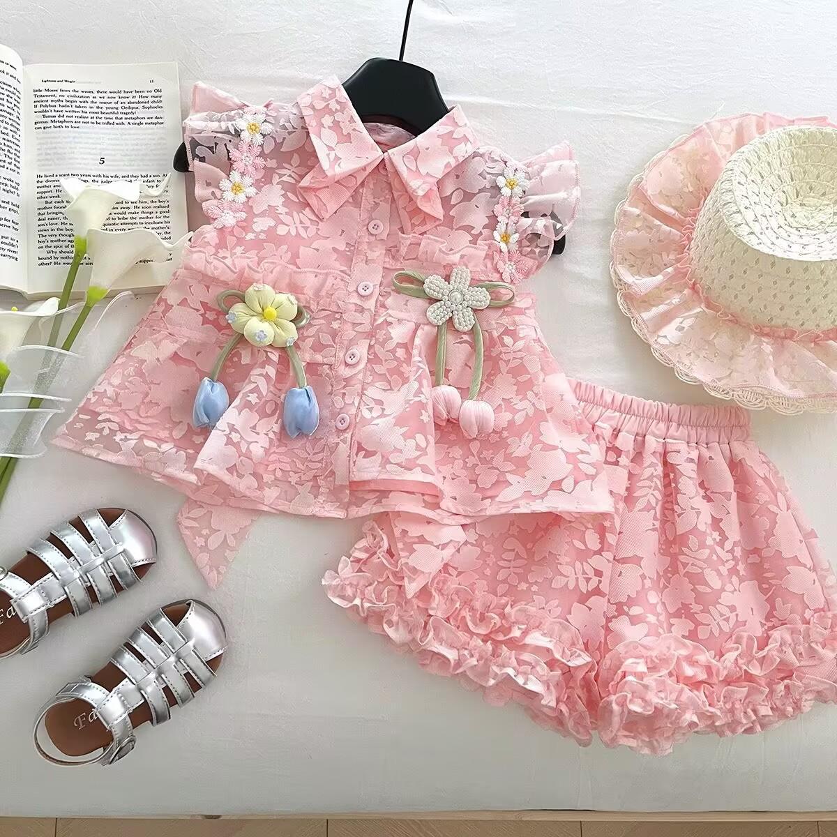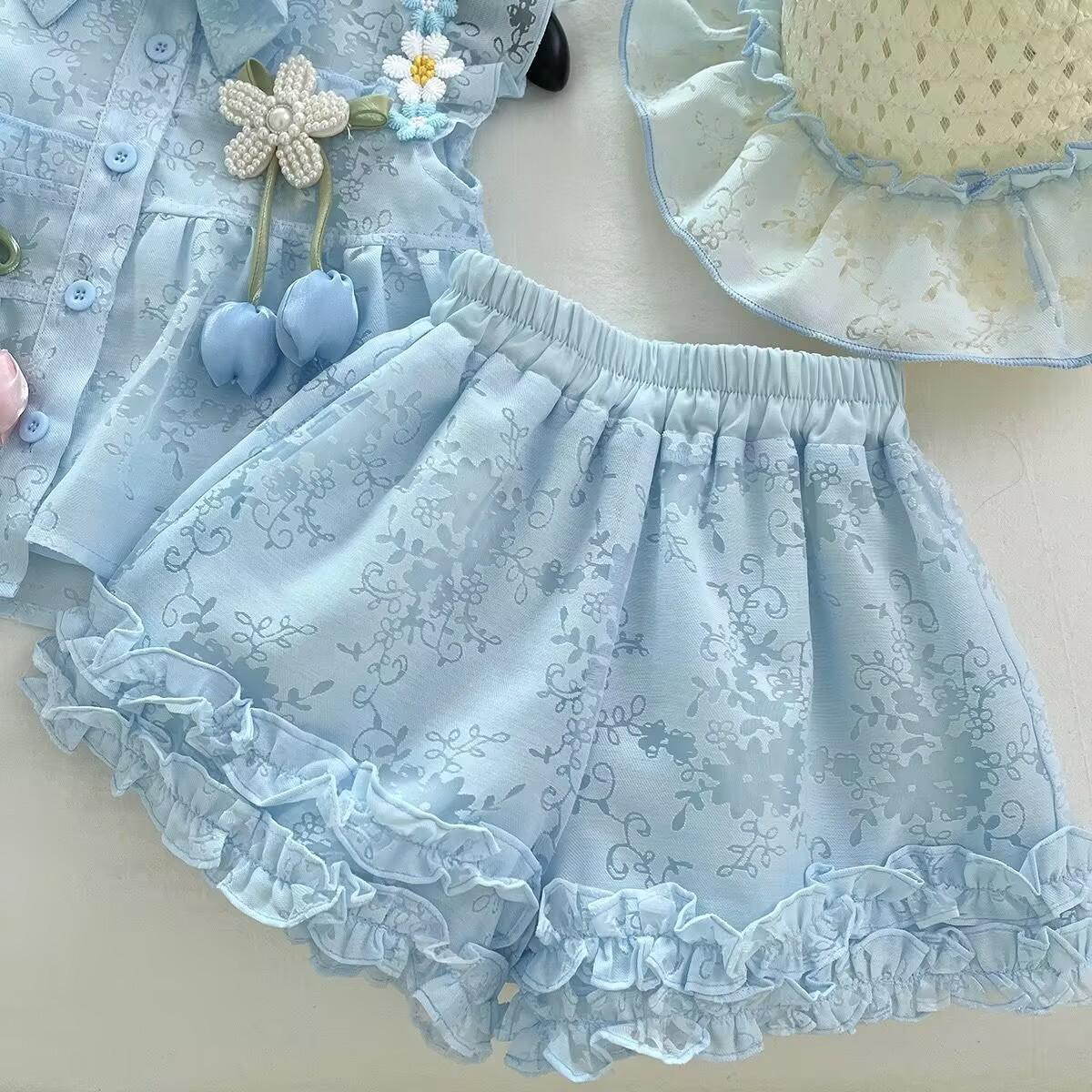 Traje para Niñas 2025 Verano Nuevo Estilo Preppy Manga Volante Camisa de Flores Shorts de Encaje para Niños Conjunto de Dos Piezas de Princesa