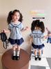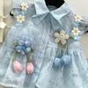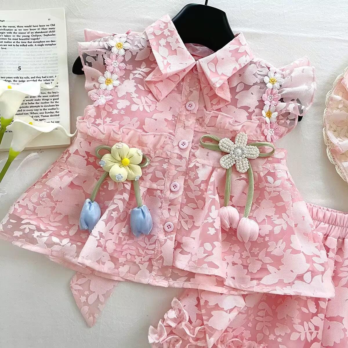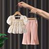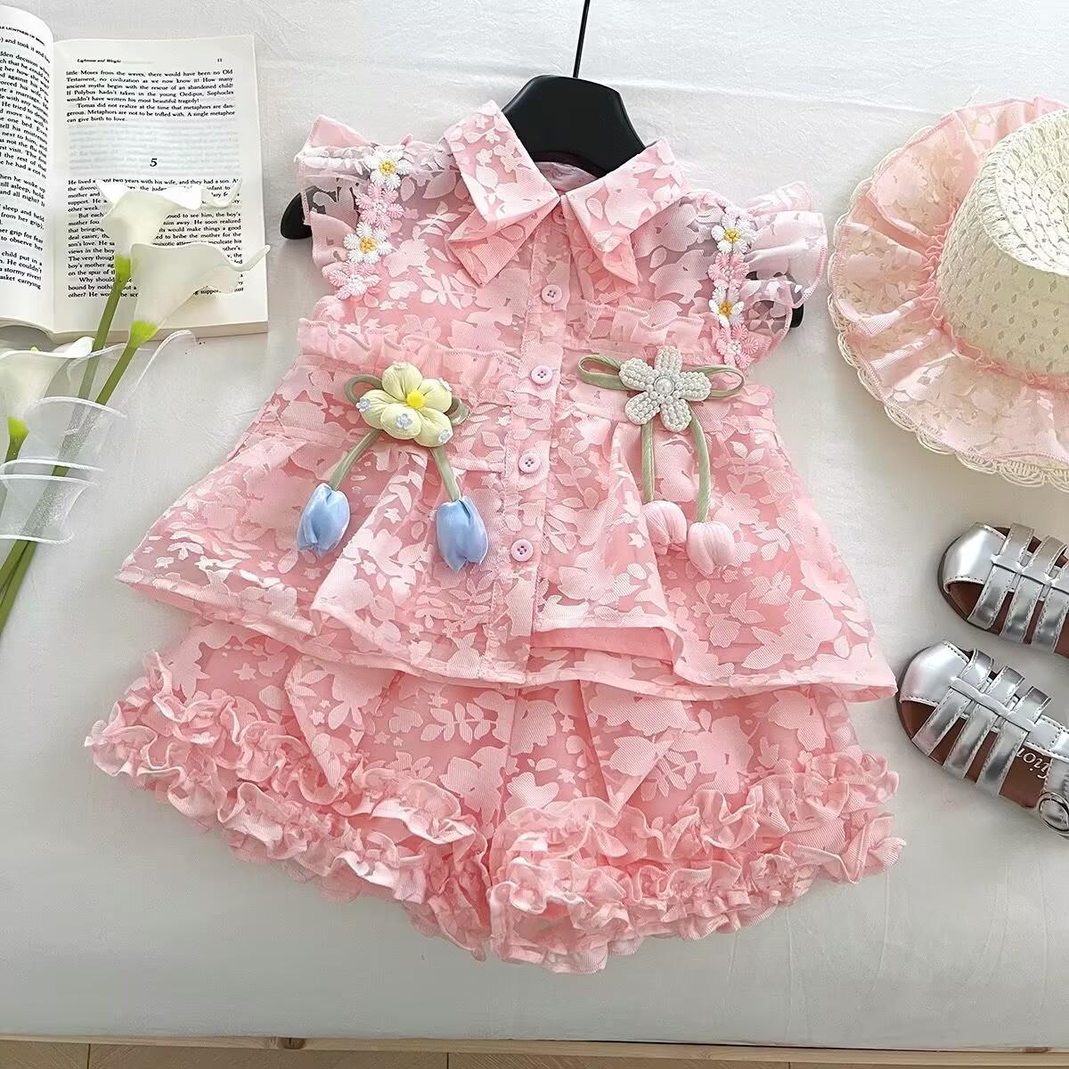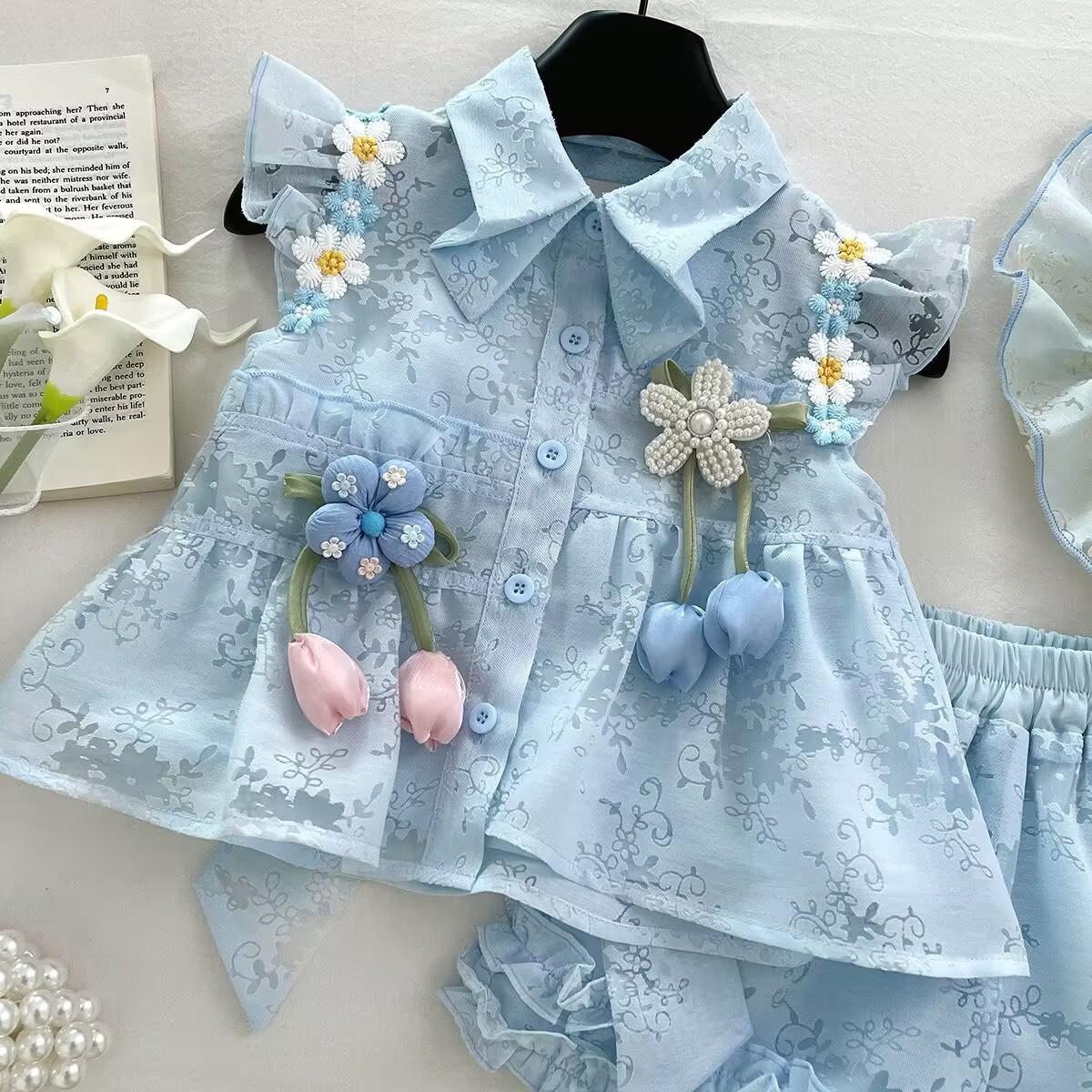Traje para Niñas 2025 Verano Nuevo Estilo Preppy Manga Volante Camisa de Flores Shorts de Encaje para Niños Conjunto de Dos Piezas de Princesa