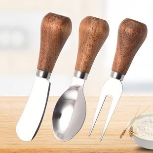 Set creativo de tres piezas de cuchillo para queso de acero inoxidable Mango vertical de madera de acacia Cuchillo para untar mantequilla Venta directa de fábrica
