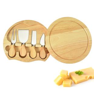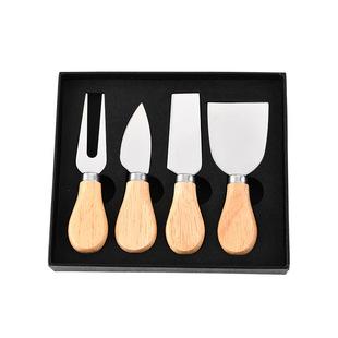 Juego de cuatro piezas de cuchillo para queso de acero inoxidable con mango de madera, juego de caja de madera redonda de goma, herramientas para hornear, venta al por mayor al contado