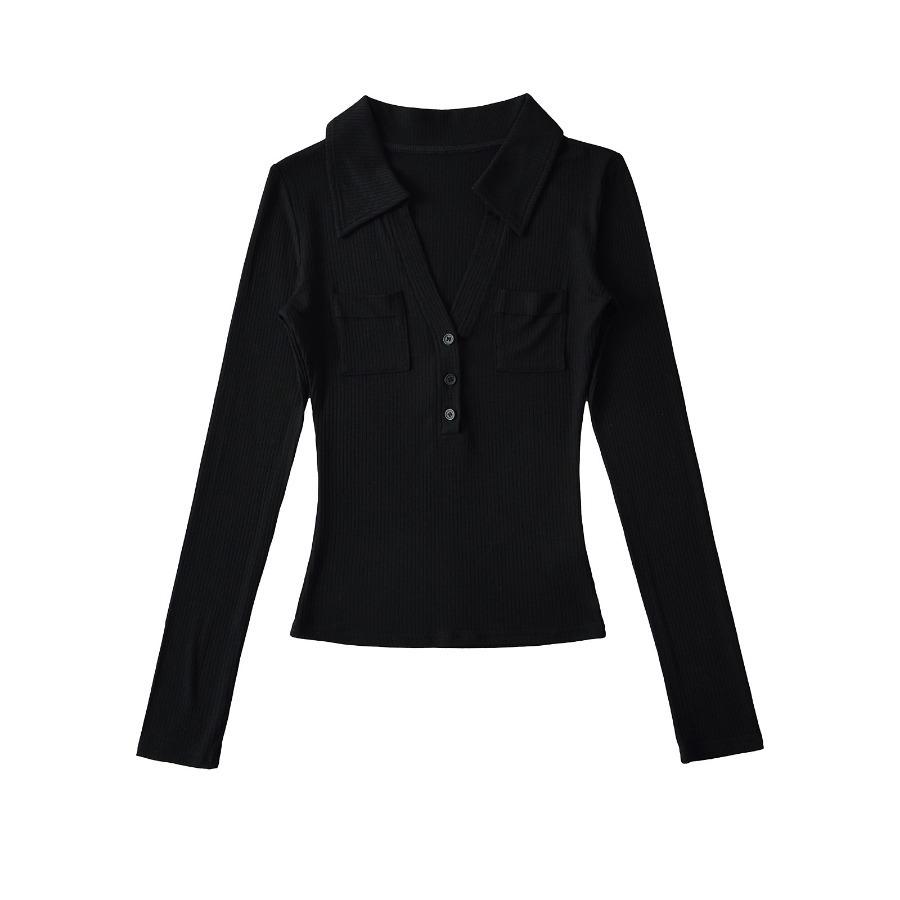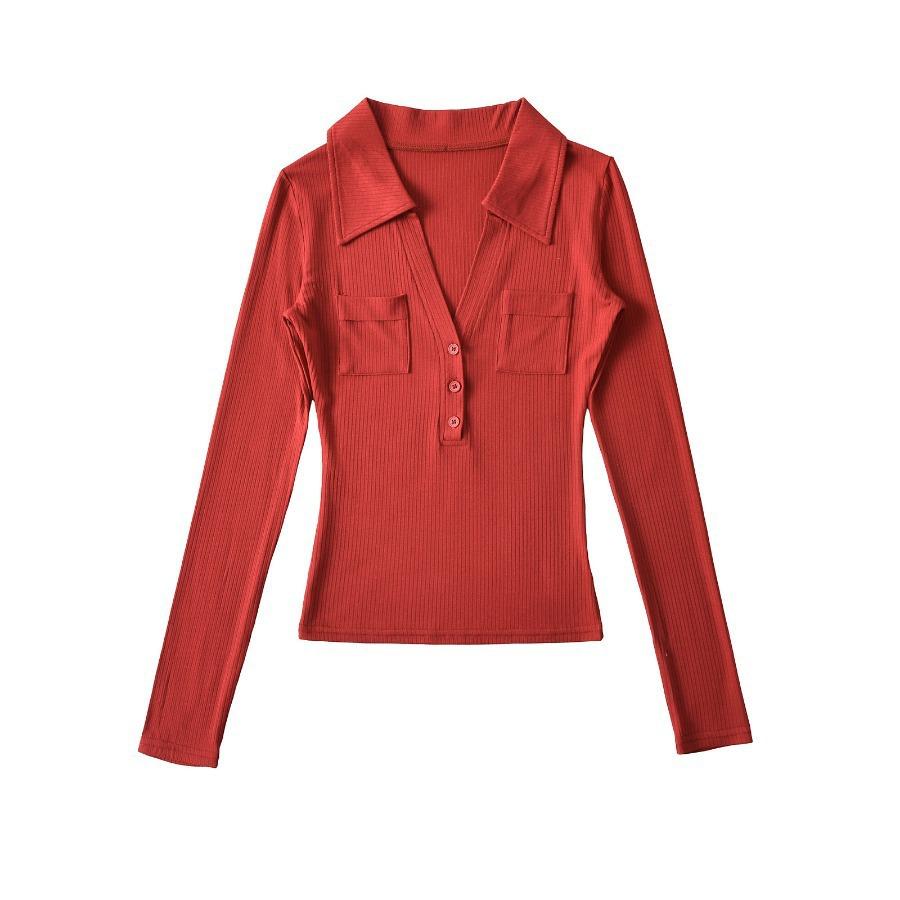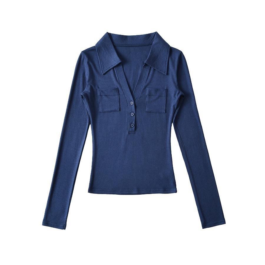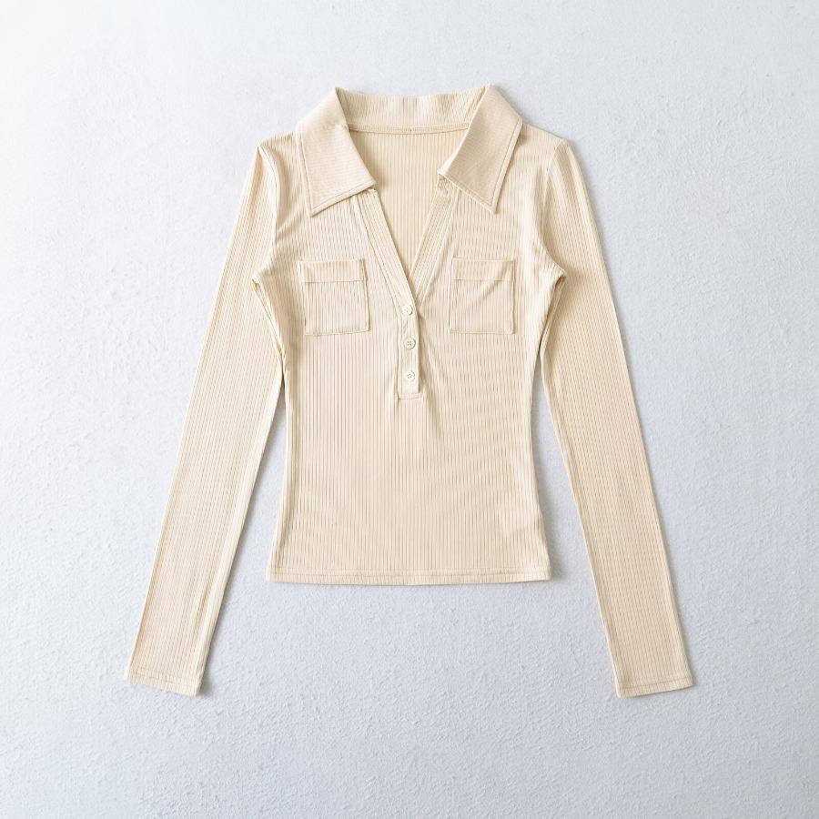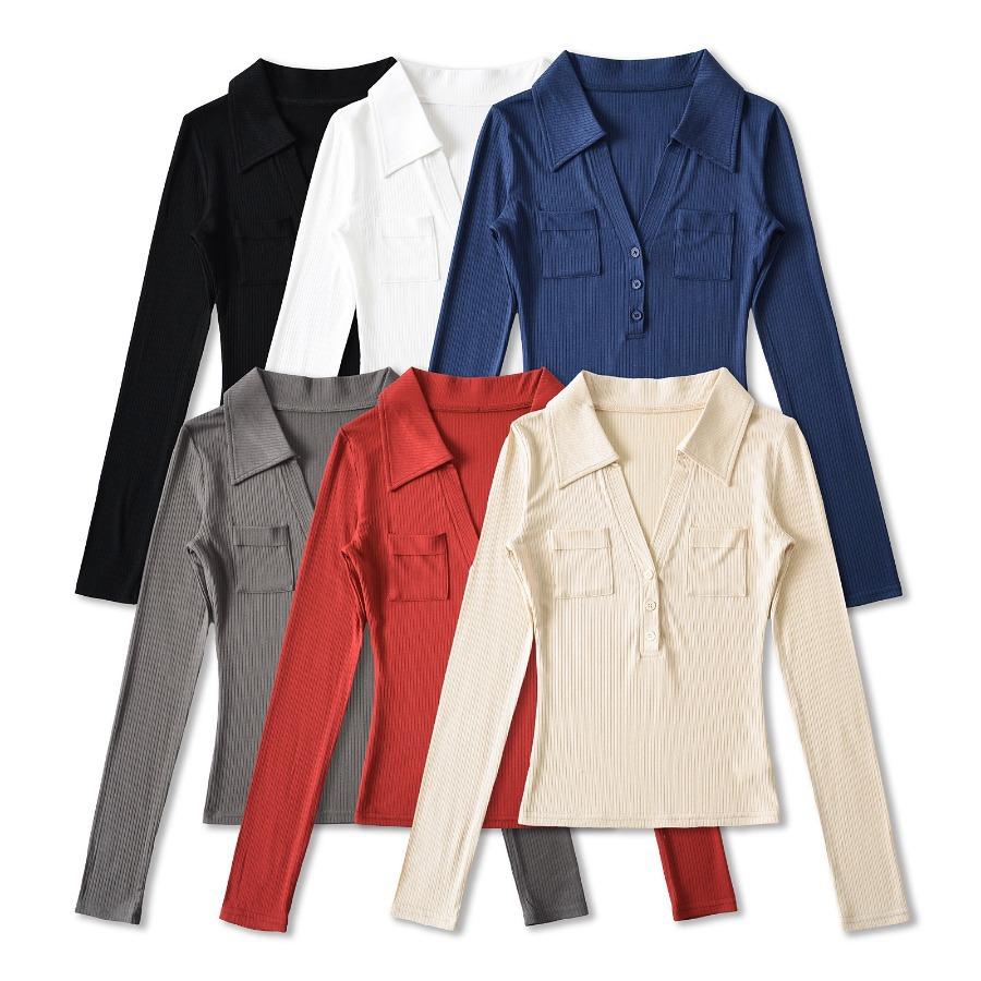 2025 Primavera Nuevo Color Sólido Doble Bolsillo Solapa Tres Botones Manga Larga Slim Camisetas Tops para Mujer al Mayoreo