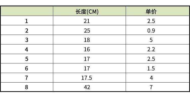 1 length 21cm, 2 length 25cm, 3 length 18cm, 4 length 16cm, 5 length 17 cm, 6 length 17 cm, 7 length 17.5cm, 8 length 42cm