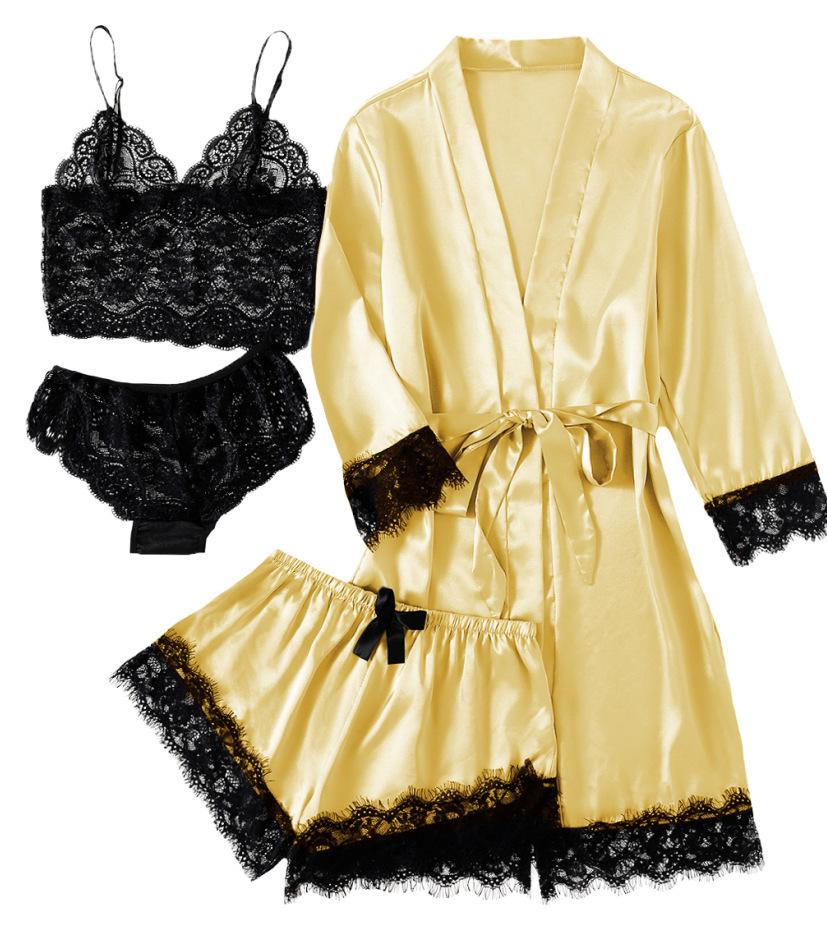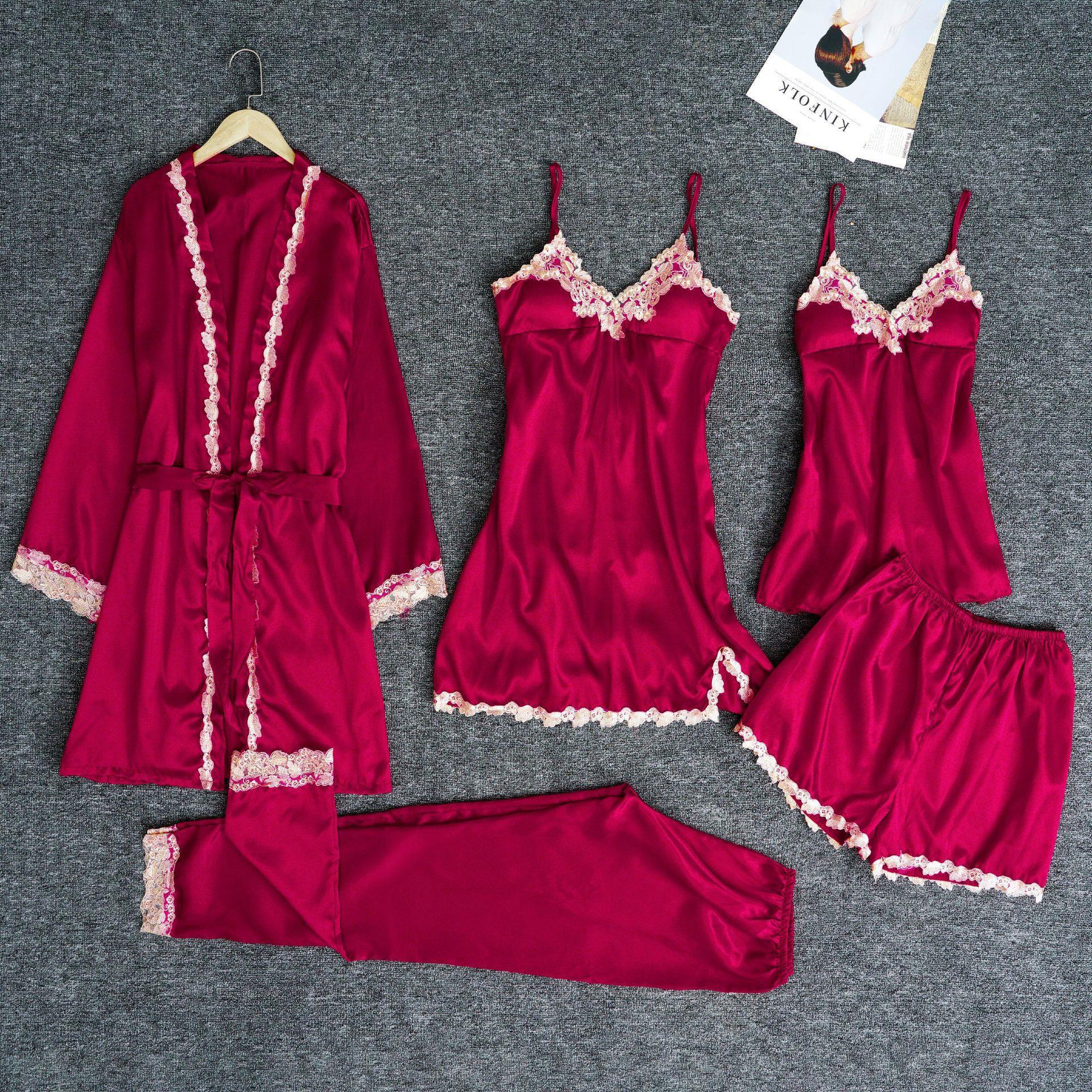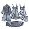 Pijamas de mujer de verano de seda de hielo sexy caliente ropa de casa primavera y otoño manga larga delgada talla grande transfronterizo traje de cinco piezas bata de baño