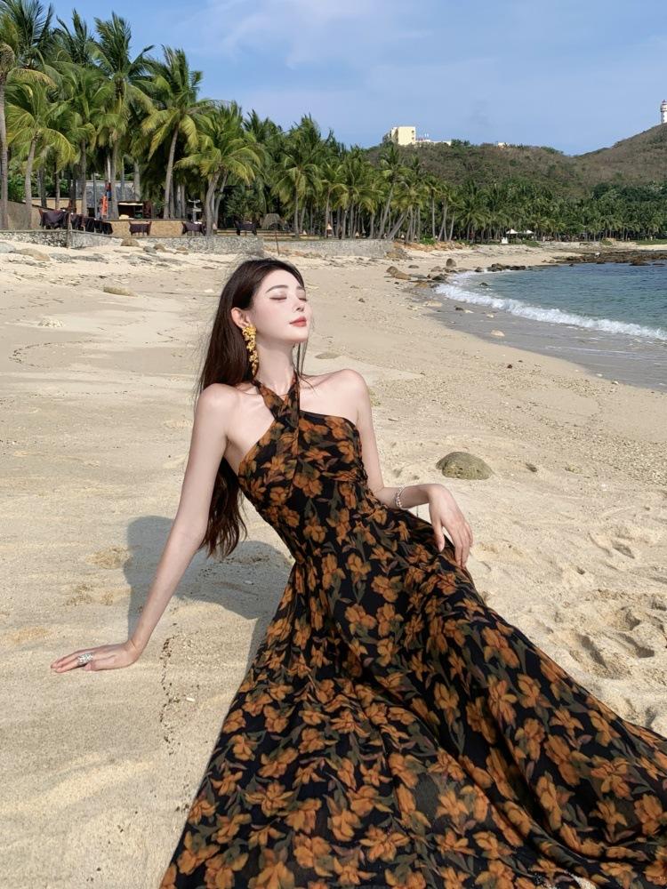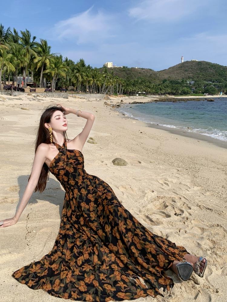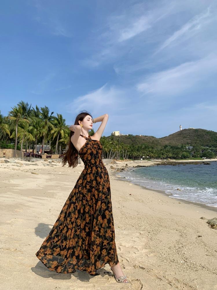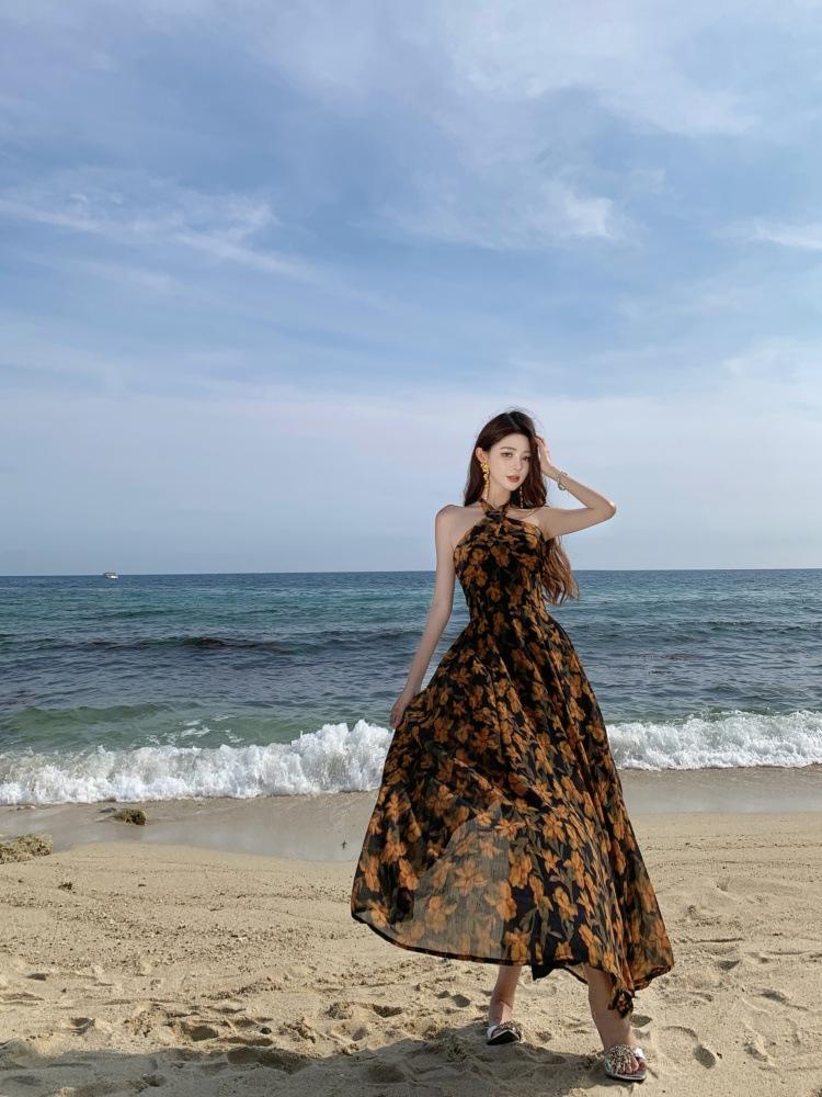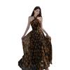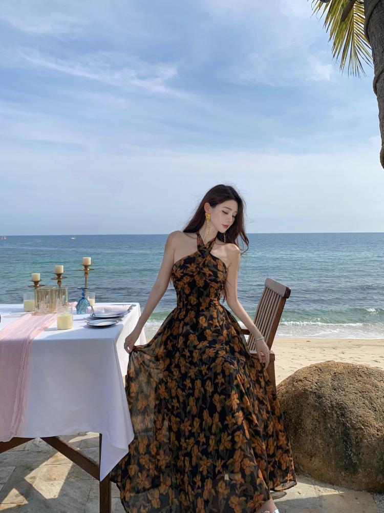Foto Real de Vestido Cruzado con Tirantes de Flores Naranjas sobre Fondo Negro para Mujer 2025 Verano Nuevo Vacaciones en la Costa Playa Falda Larga