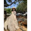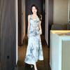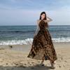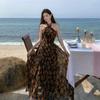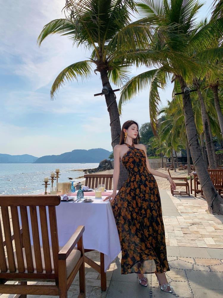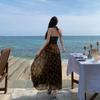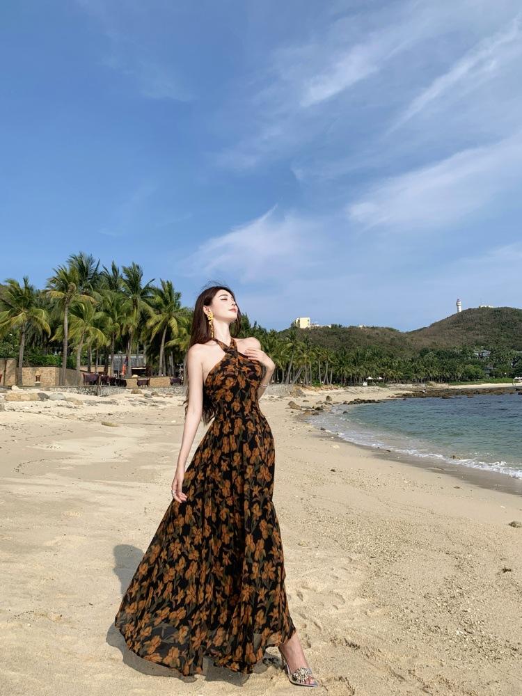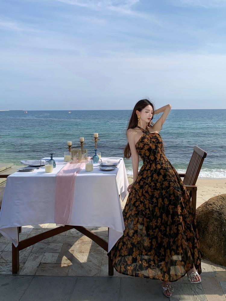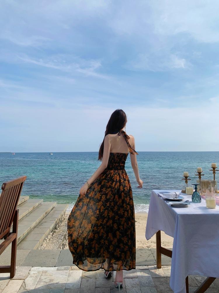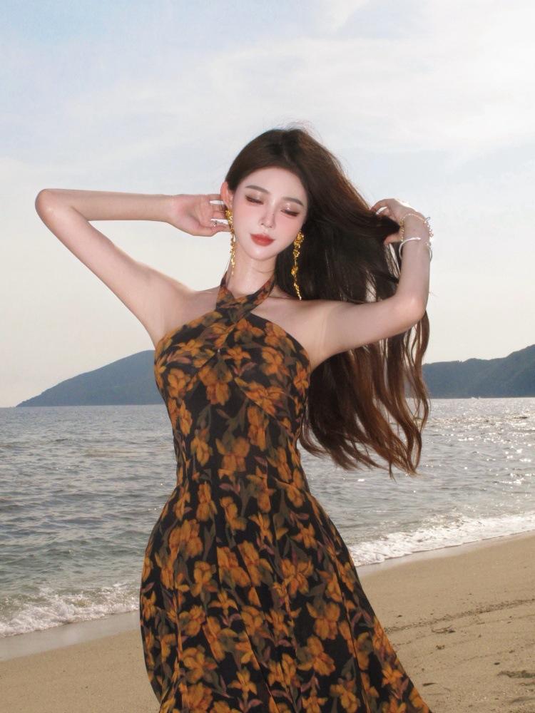 Foto Real de Vestido Cruzado con Tirantes de Flores Naranjas sobre Fondo Negro para Mujer 2025 Verano Nuevo Vacaciones en la Costa Playa Falda Larga