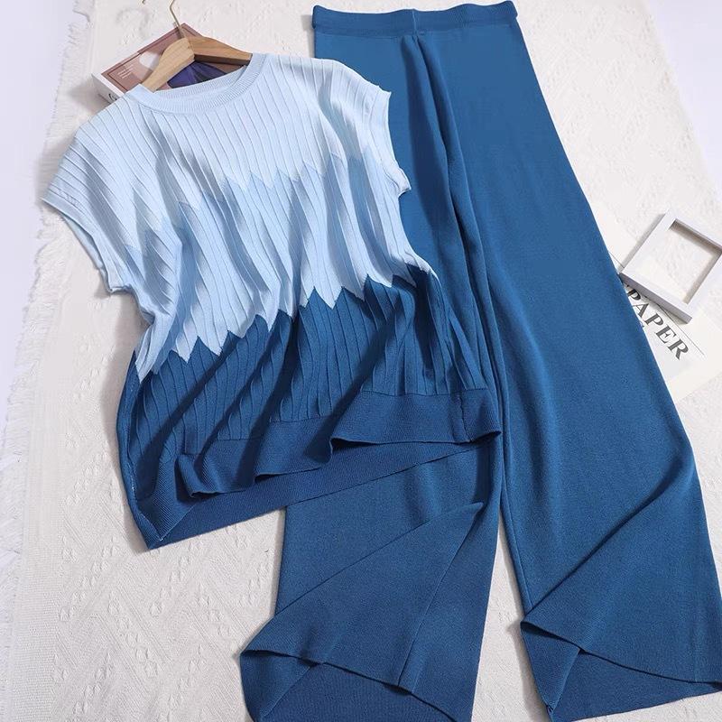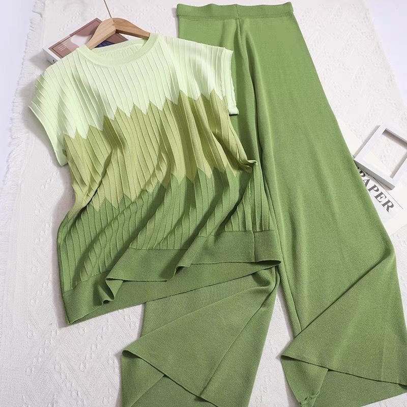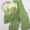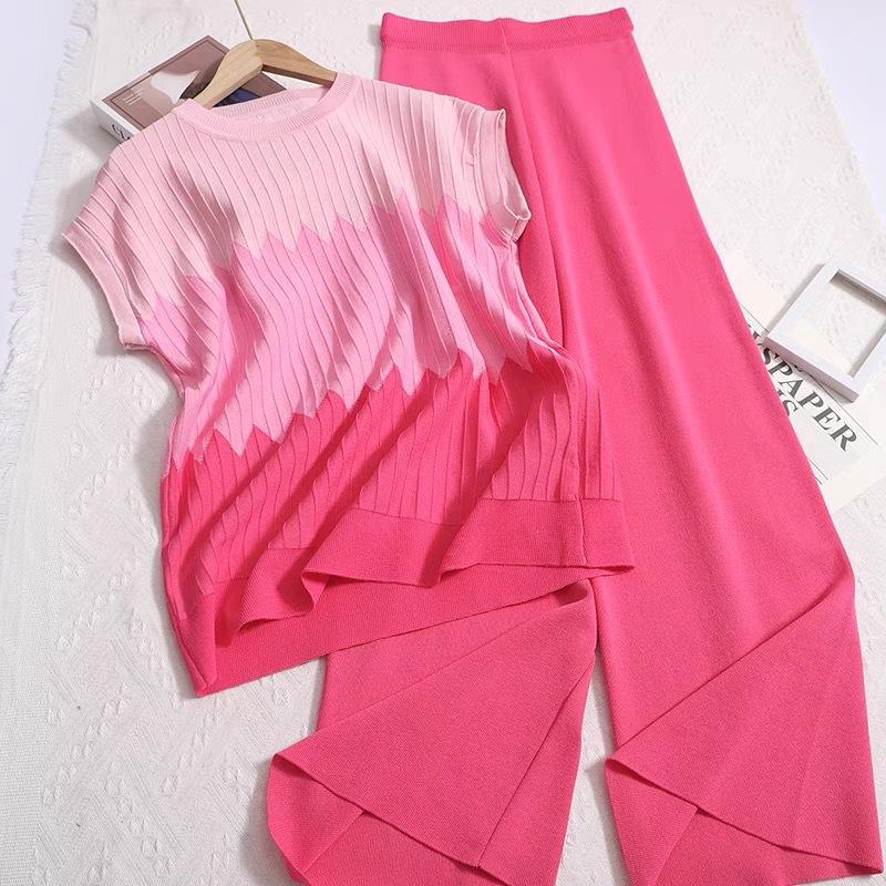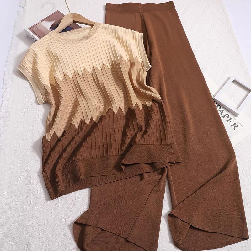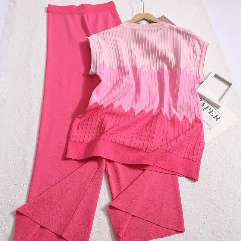 Suéter sin mangas con cuello redondo holgado y diseño de contraste degradado francés, camiseta, traje de pantalón de pierna ancha de color sólido de cintura alta
