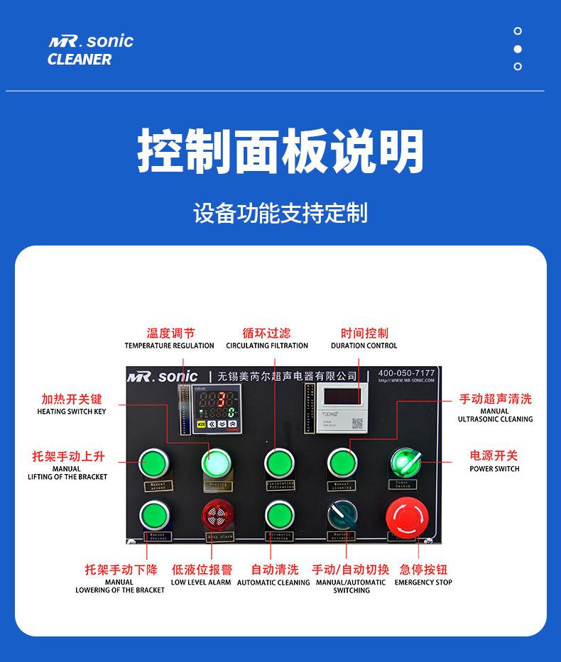 Ultrasound + timing + power adjustable + liter/down + thrown + hand/automatic operation + emergency stop