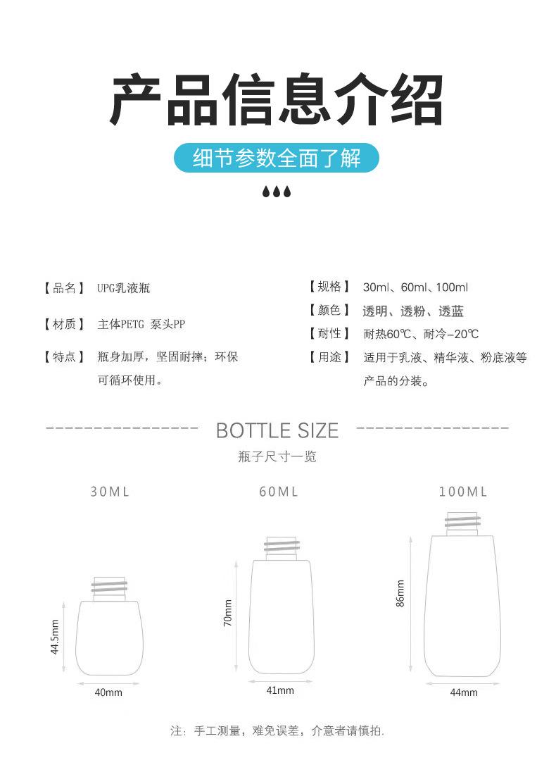 Juego de botellas de viaje, botella pequeña, botella vacía, loción en aerosol portátil, botella de vacío, botella de muestra de polvo, personalización del fabricante