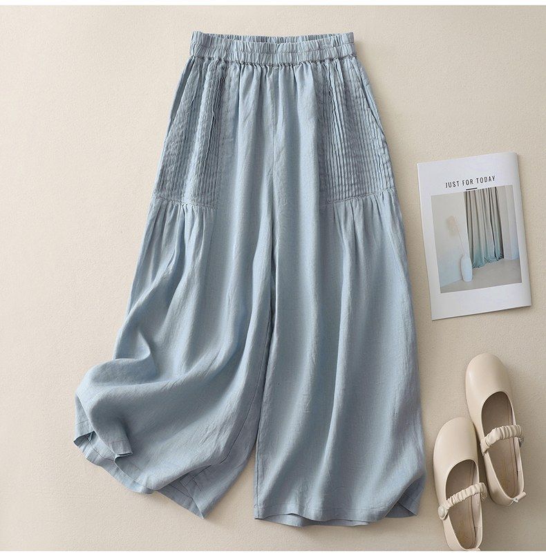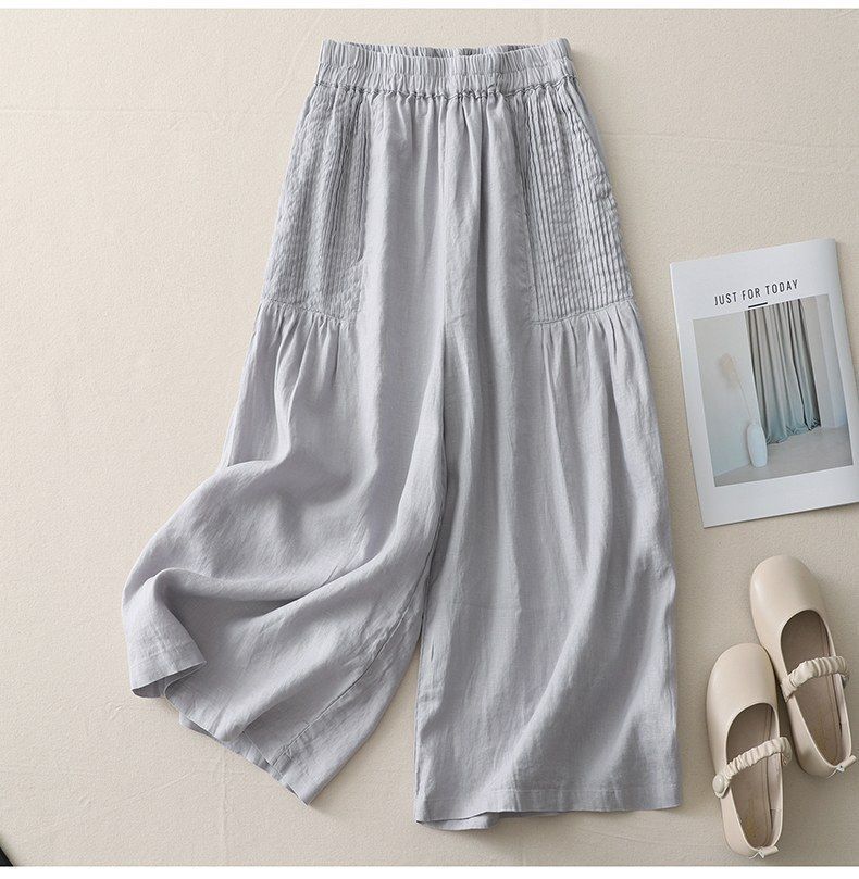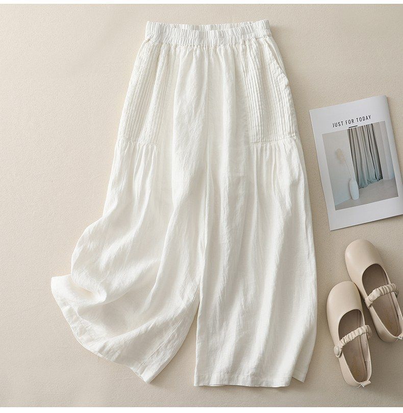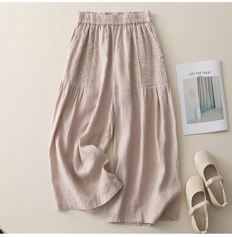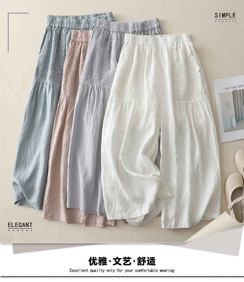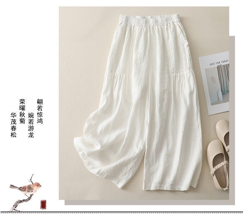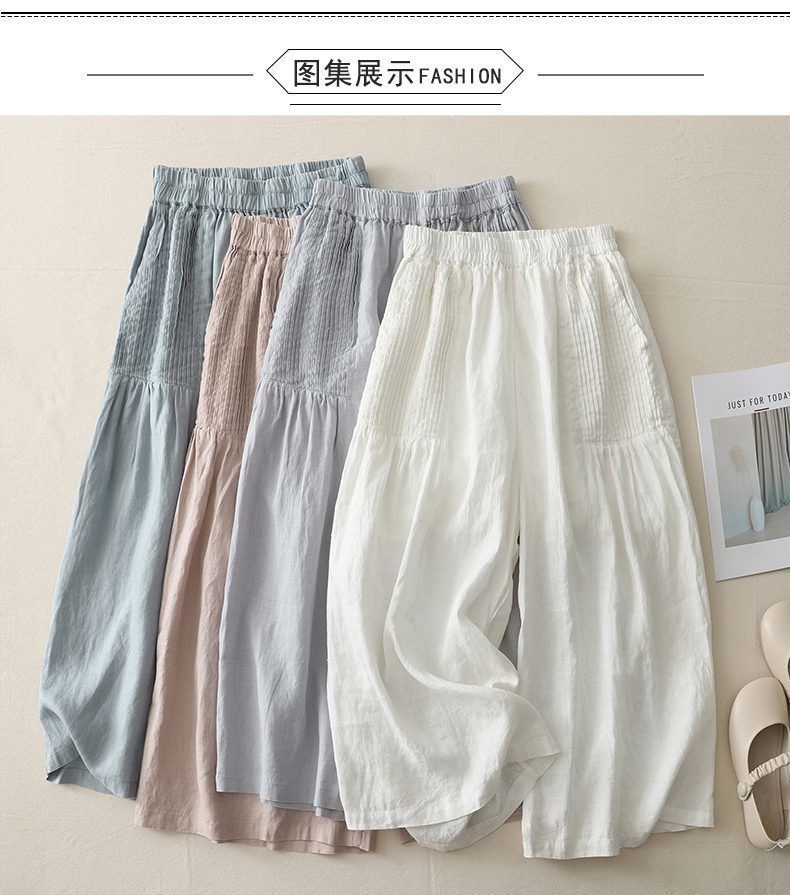 Tienda de Descuento Pantalones Falda Retro Plisados de Algodón y Lino de Pierna Ancha para Mujer Verano Literario Simple Color Sólido Cintura Alta Rectos