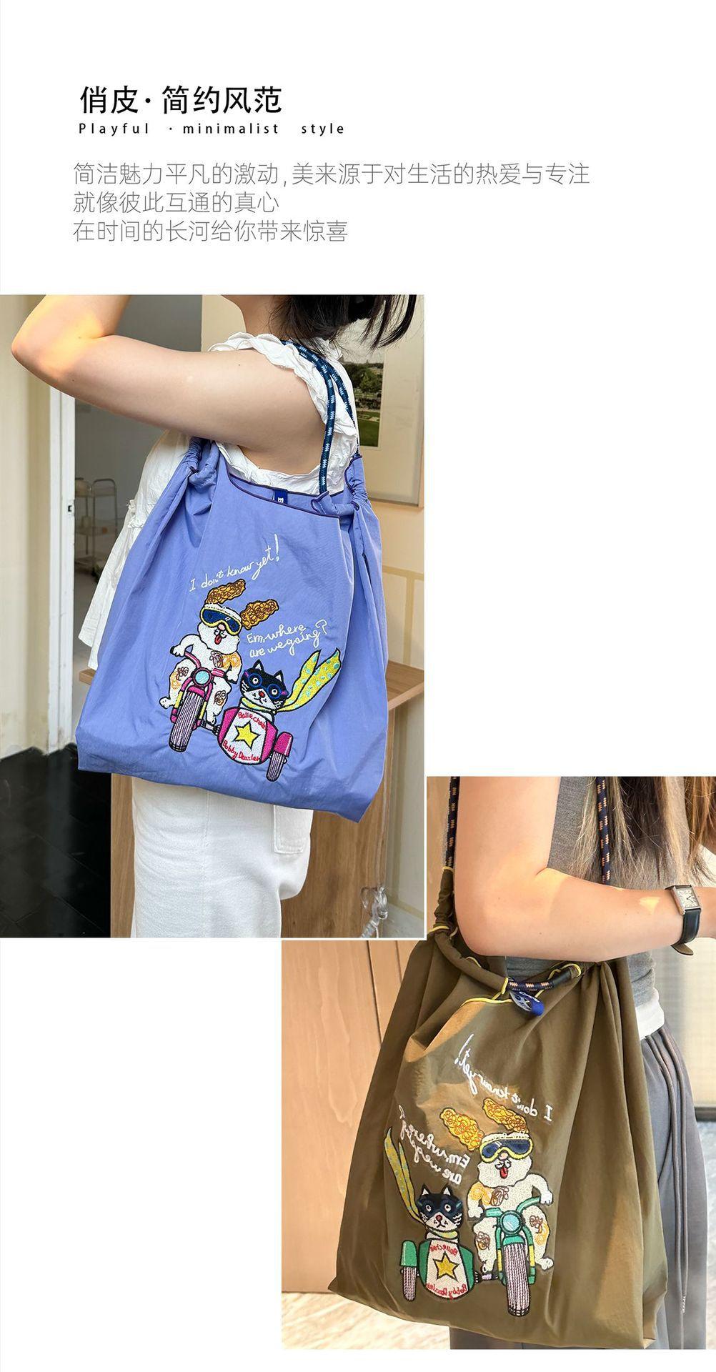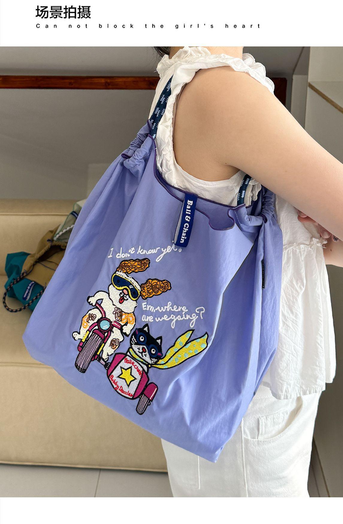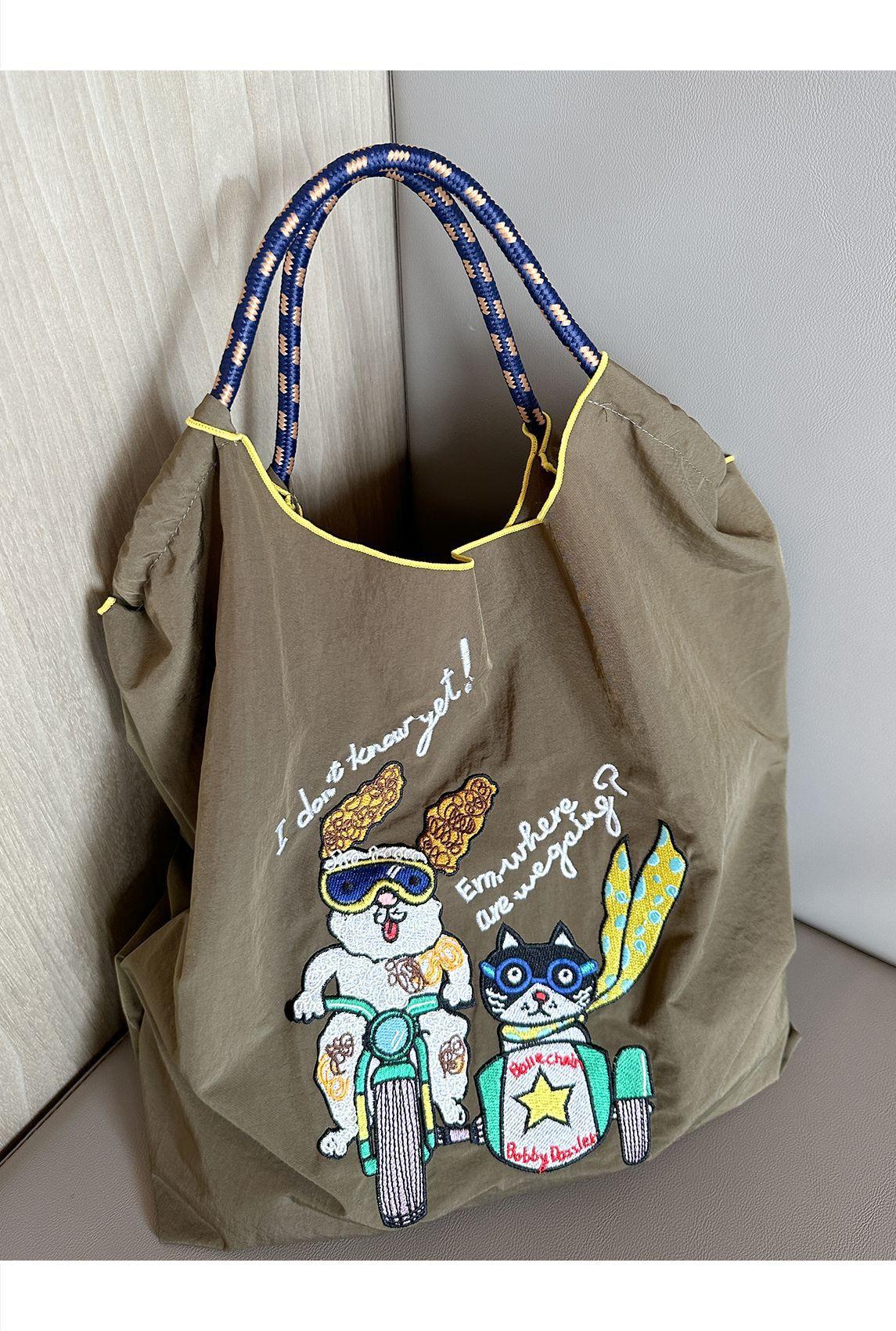 Bolso de hombro portátil para mujer, bolso bordado, bandolera de nailon de gran capacidad, bolso de mano de nailon portátil y plegable.