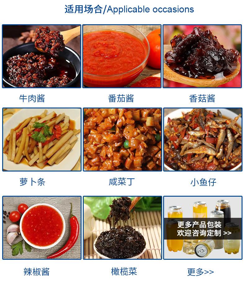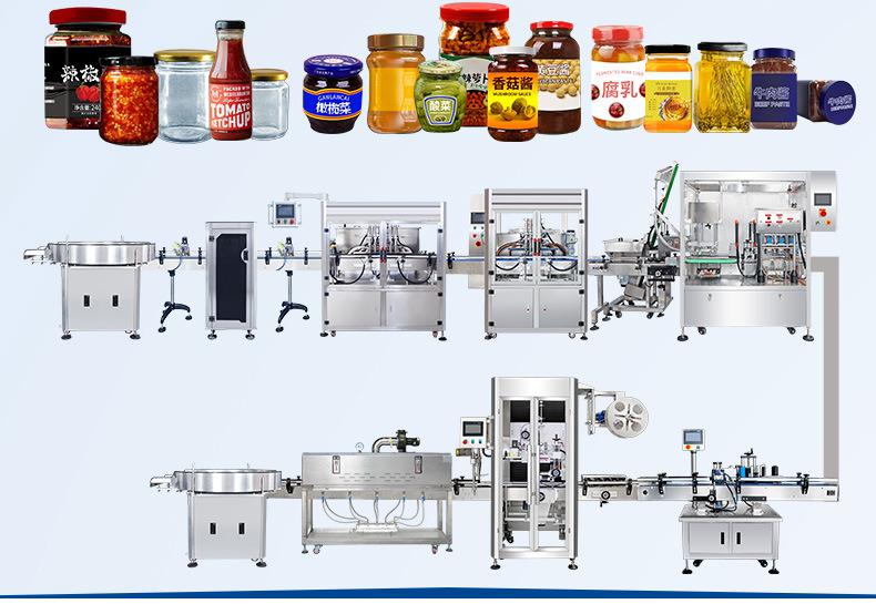 Esta línea de producción es adecuada para envasar una variedad de salsas, como aderezos para ensaladas, salsa de mostaza amarilla, salsa de soja, salsa de pimiento picante, aceite de pimiento picante, aceite de oliva, mantequilla de maní, vinagre de sidra de manzana, vinagre de vino tinto, mermelada y jalea, salsa de champiñones, etc.